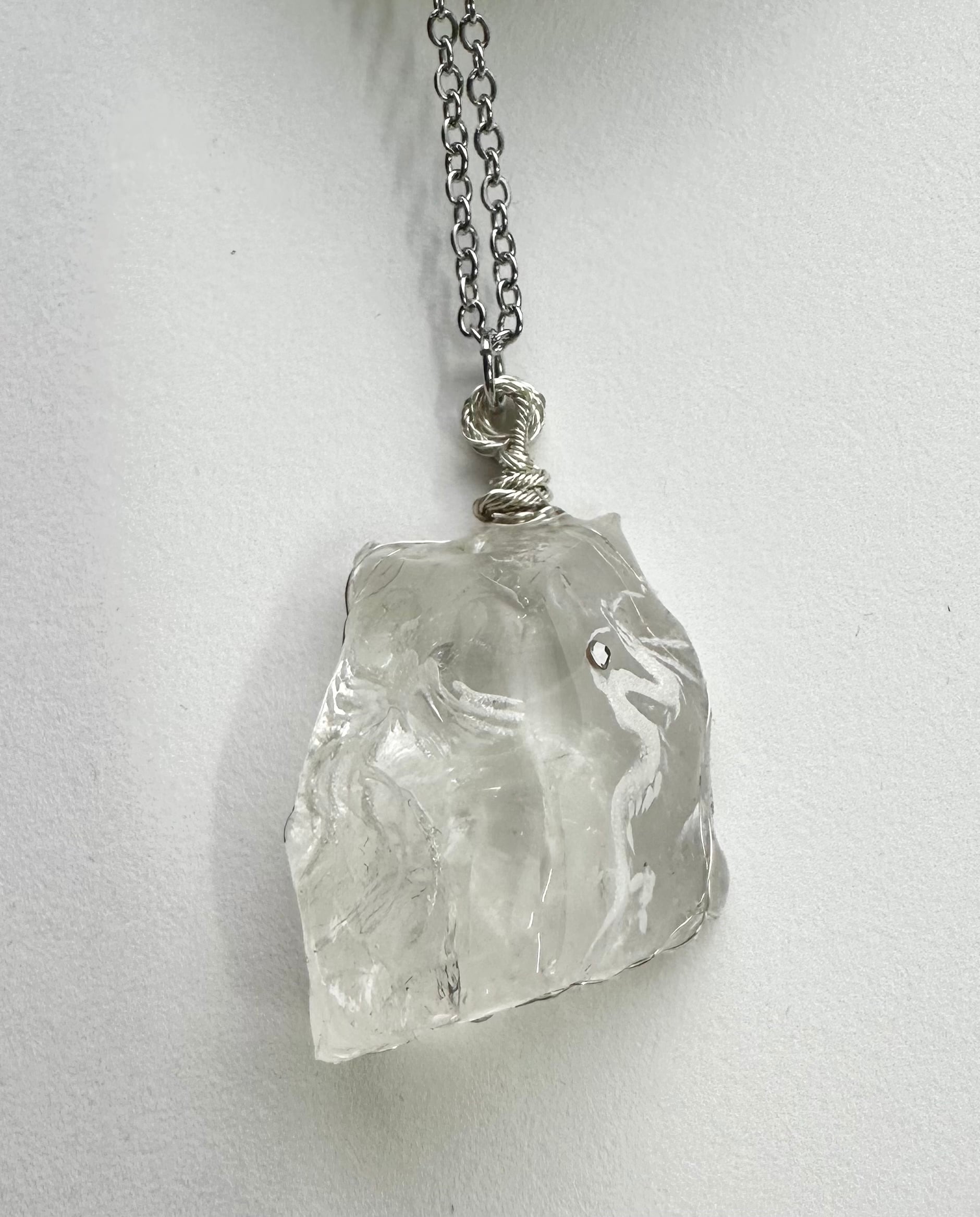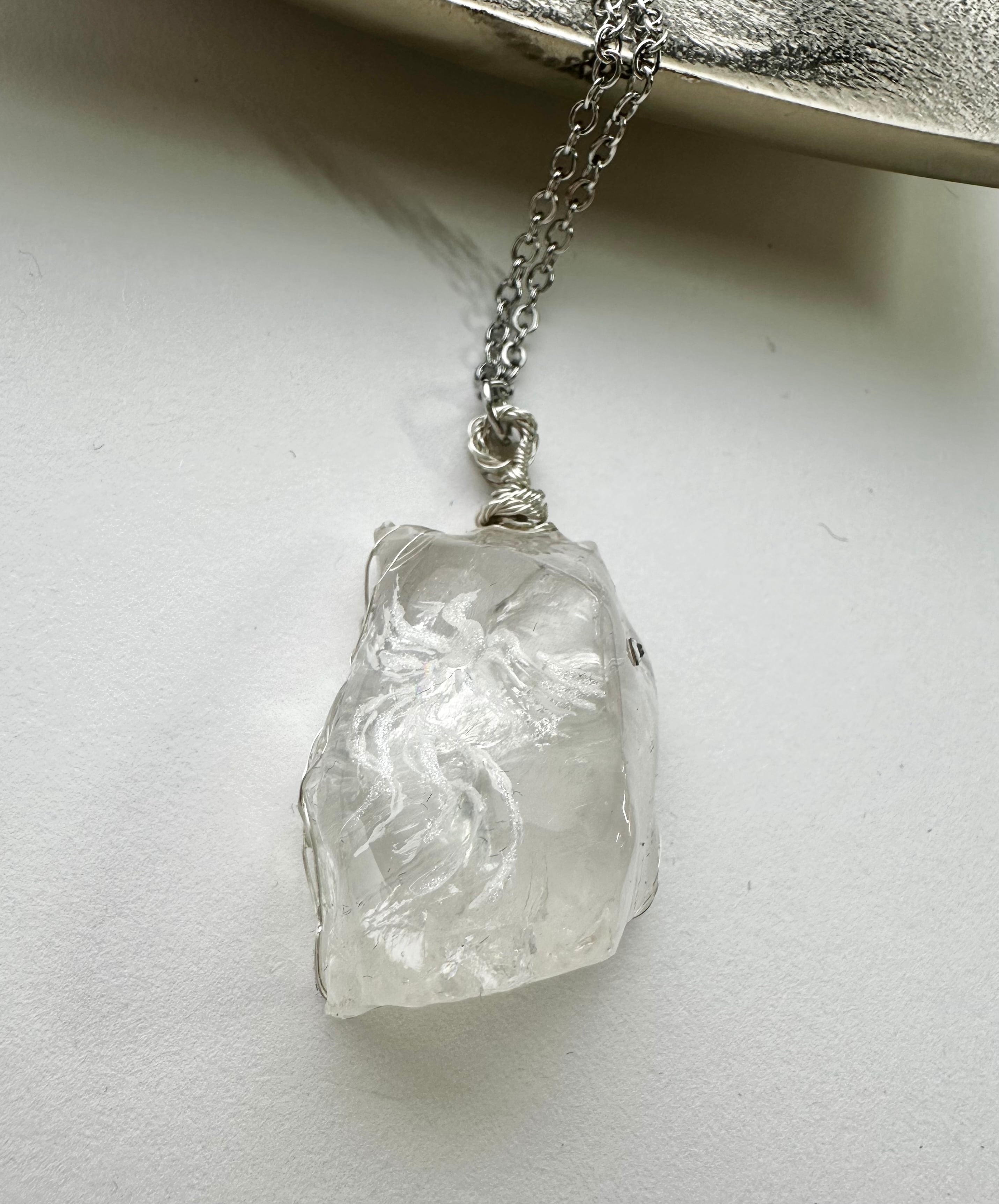 透明感あふれる原石水晶に、光白の龍と鳳凰両方が描かれた品のあるネックレス。