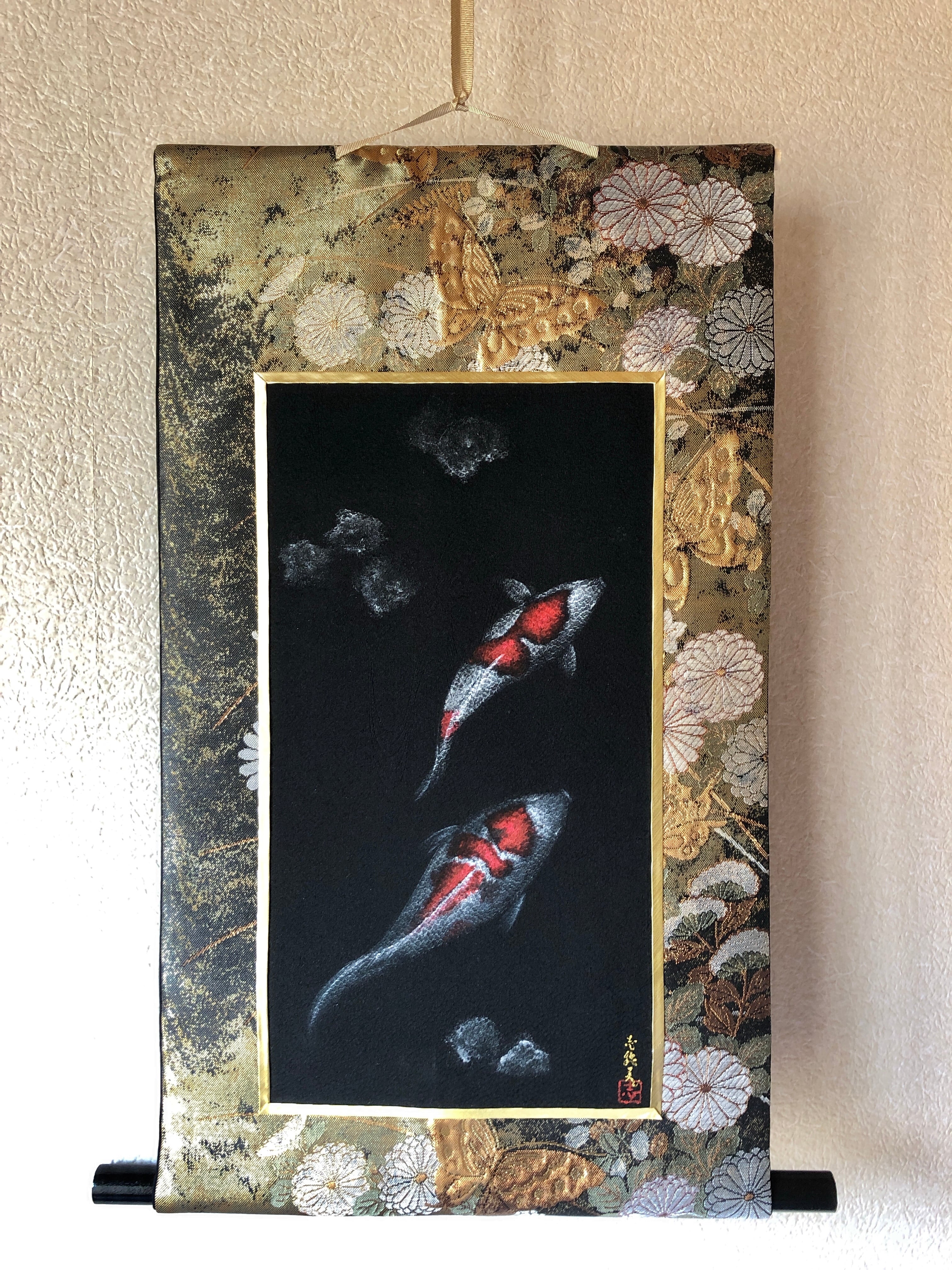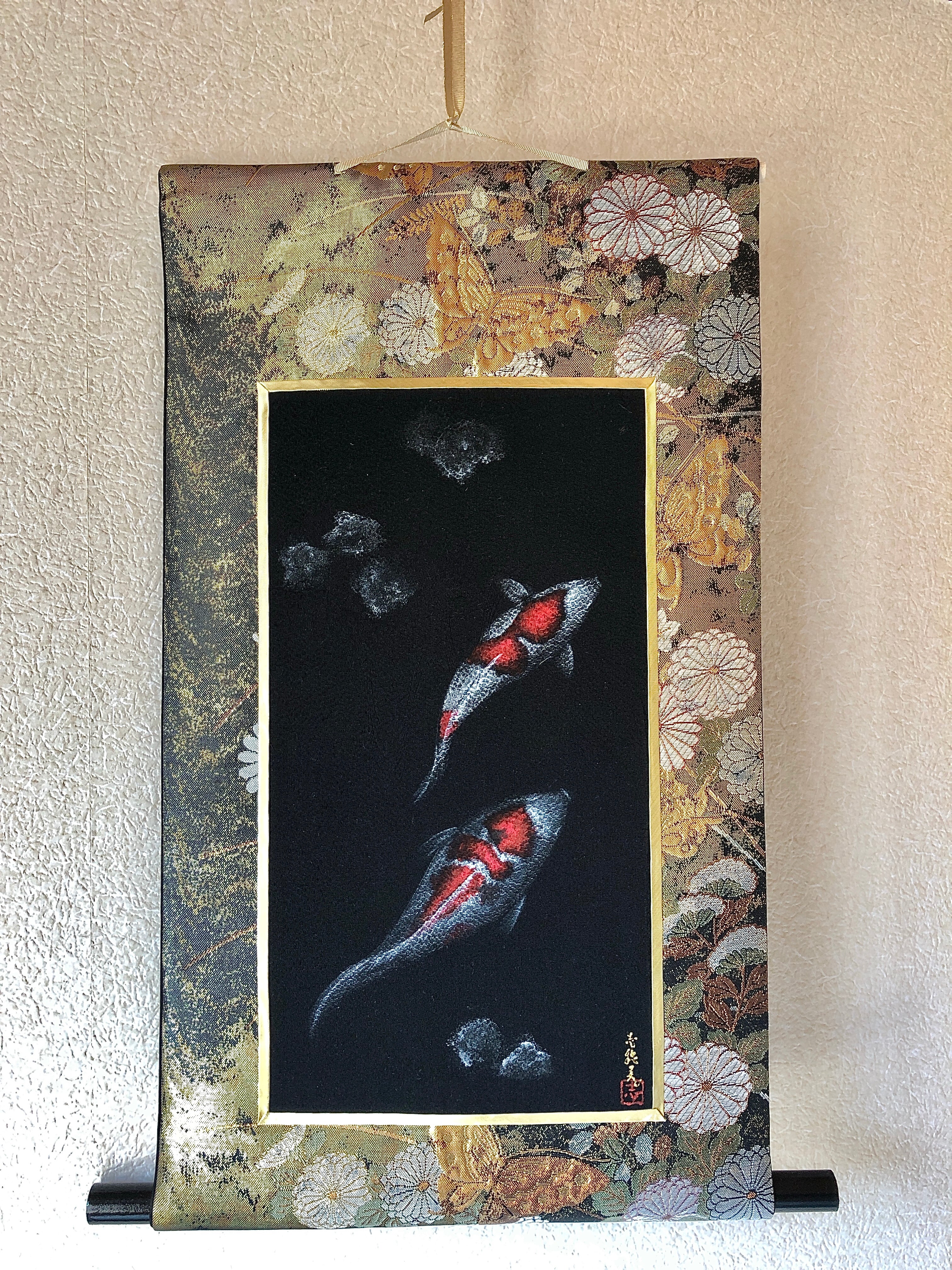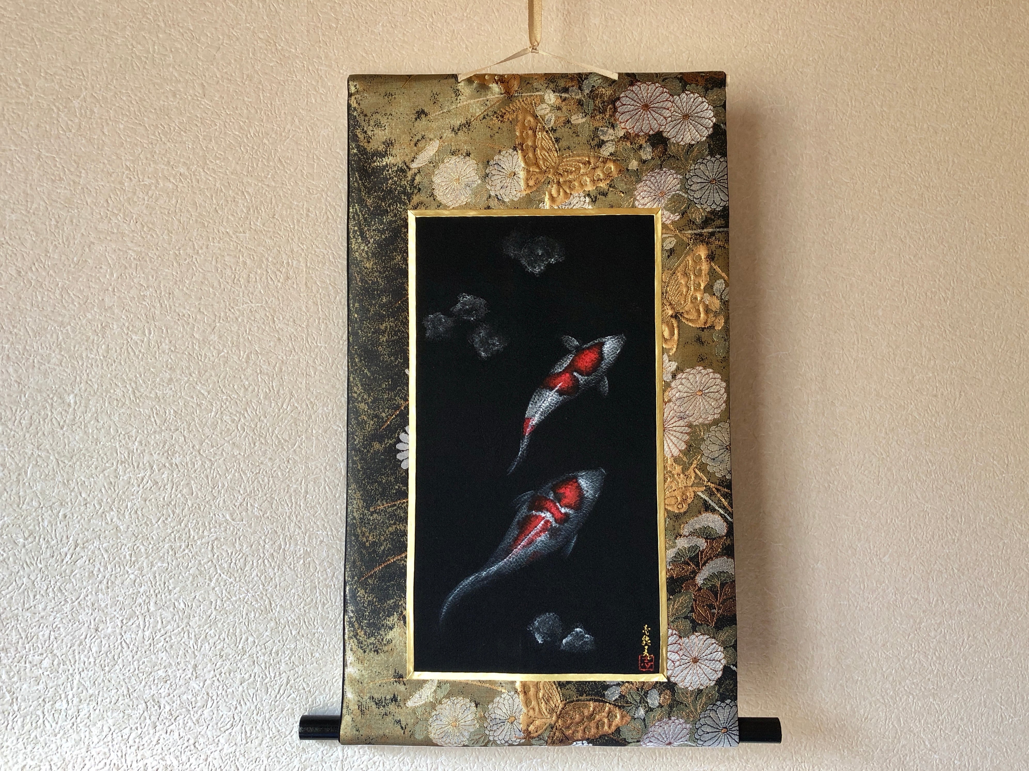 2匹の錦鯉が上へ向かって泳ぐ、縁起のよい掛け軸。