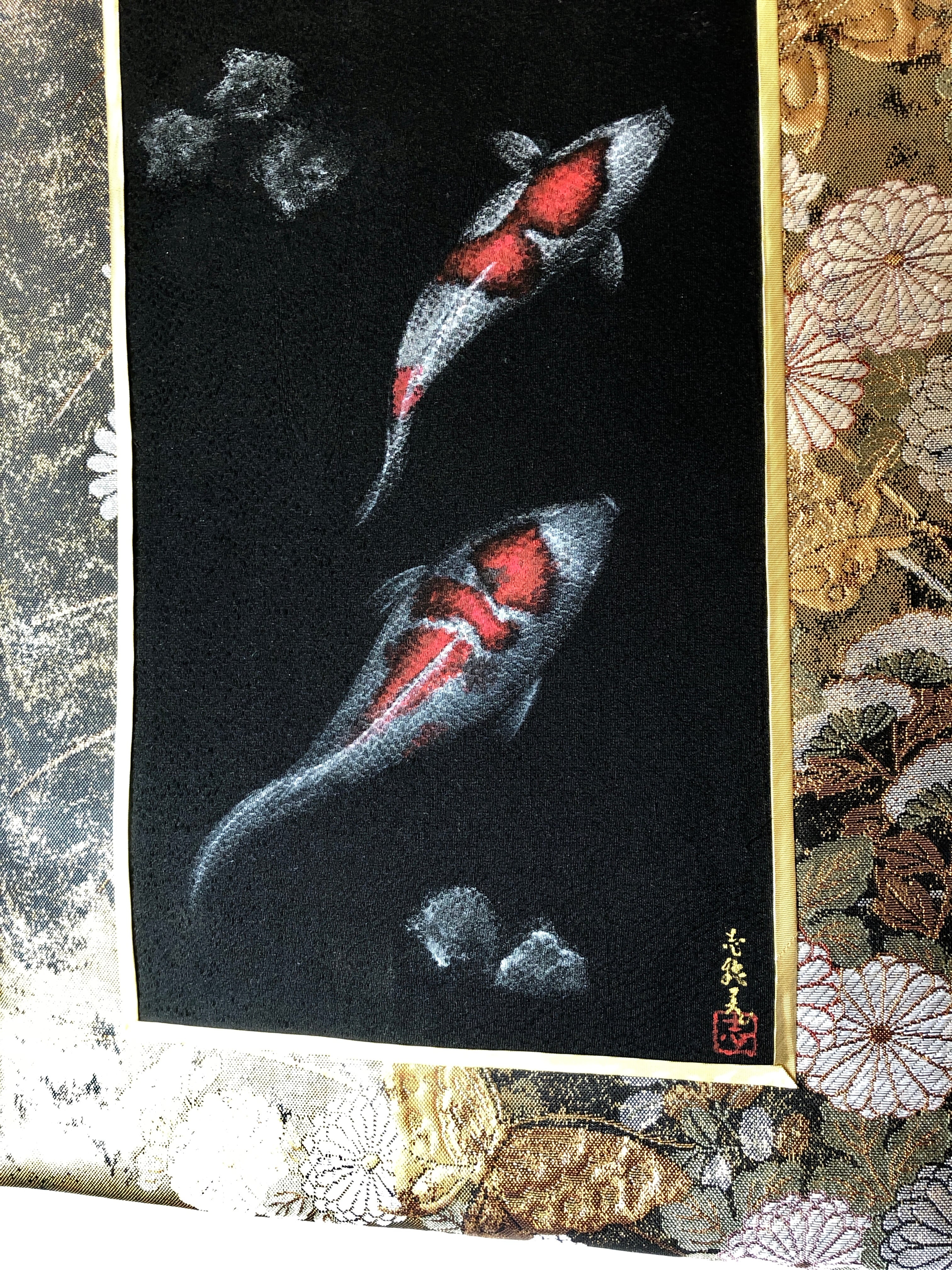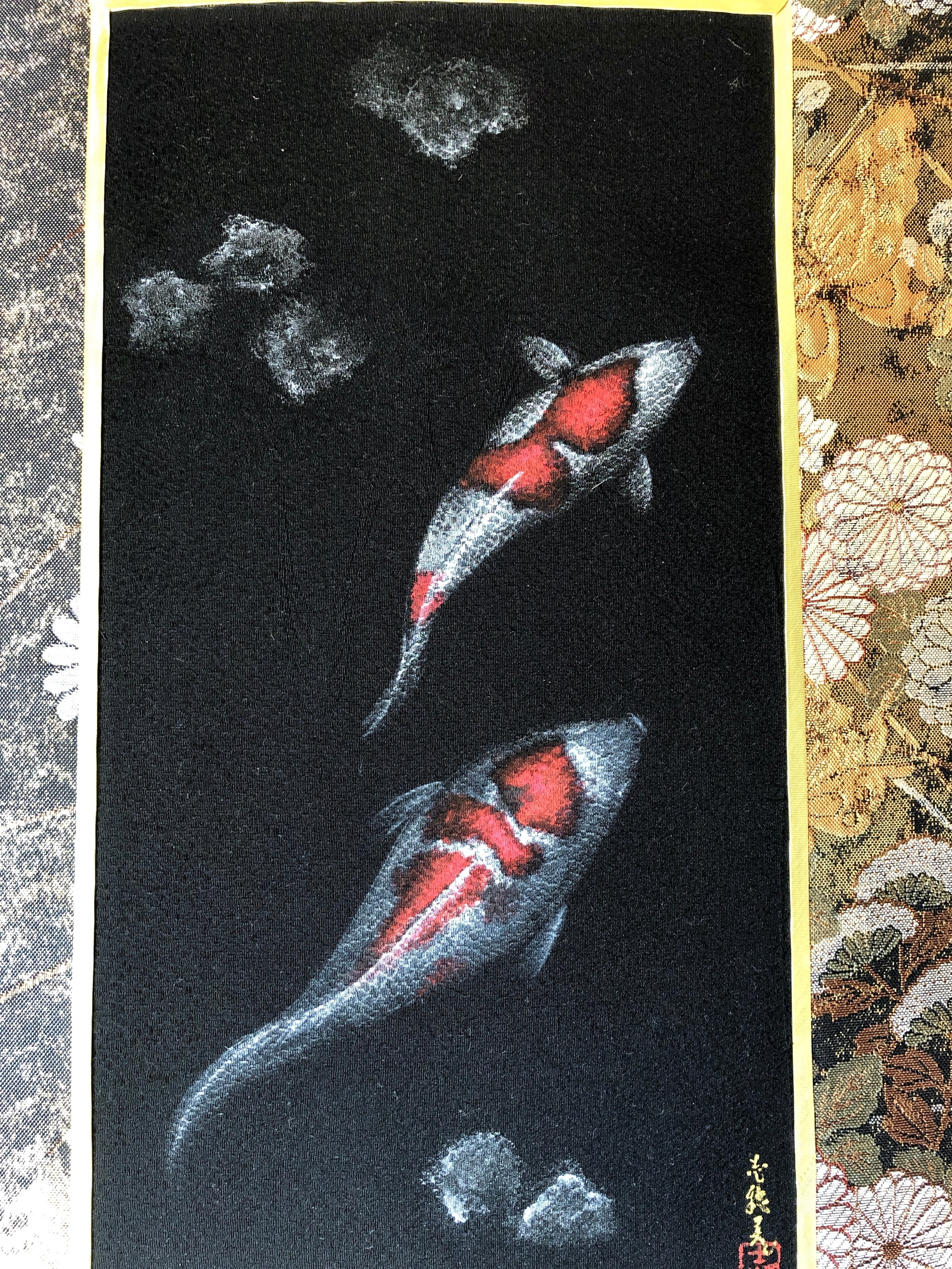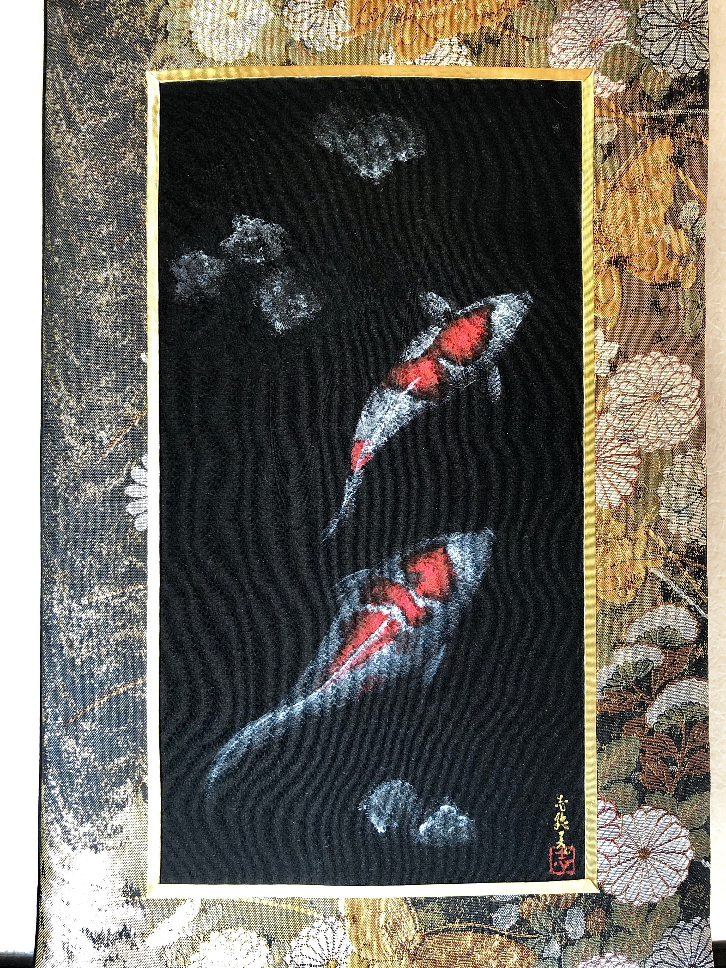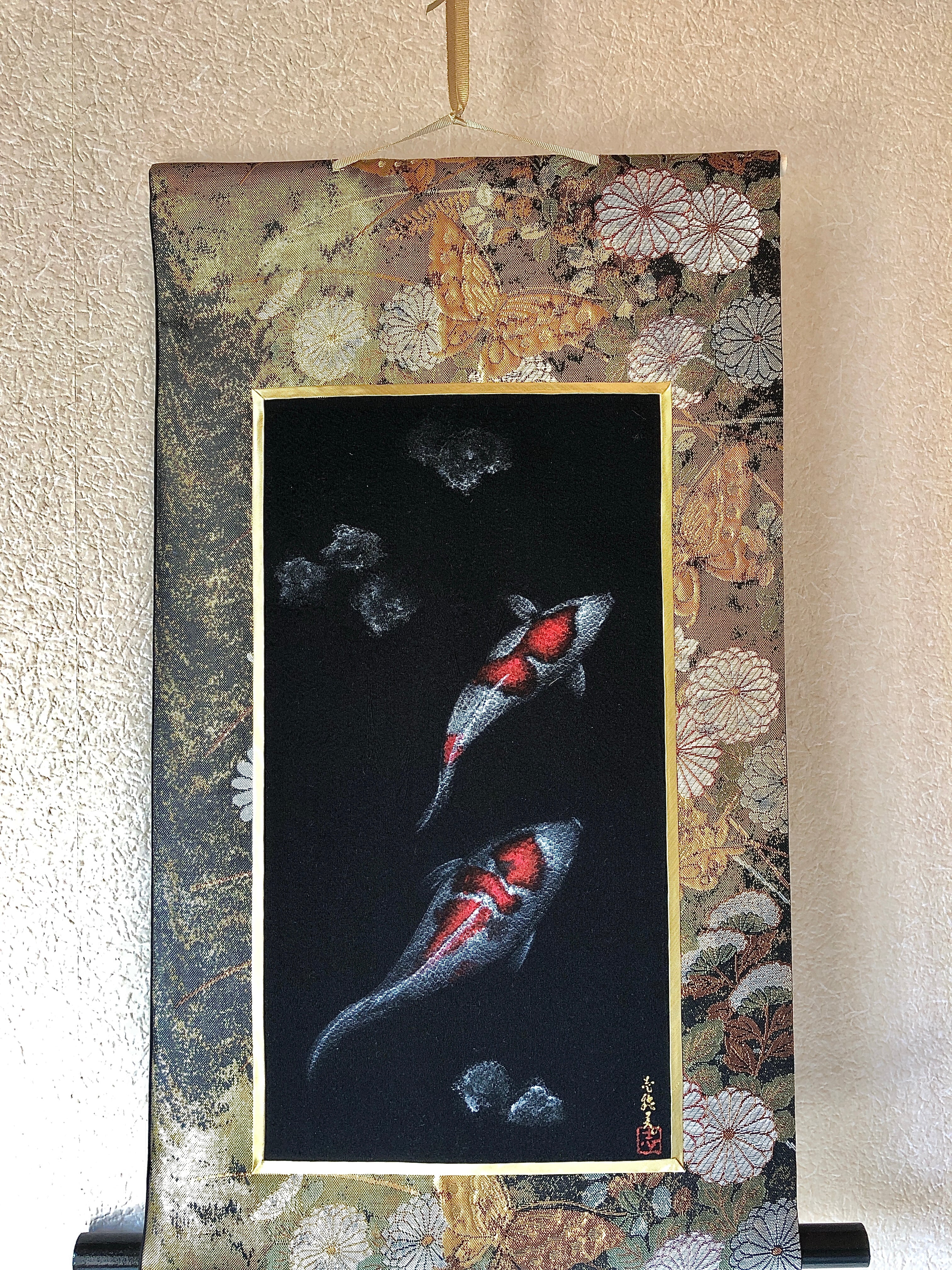 2匹の錦鯉が上へ向かって泳ぐ、縁起のよい掛け軸。