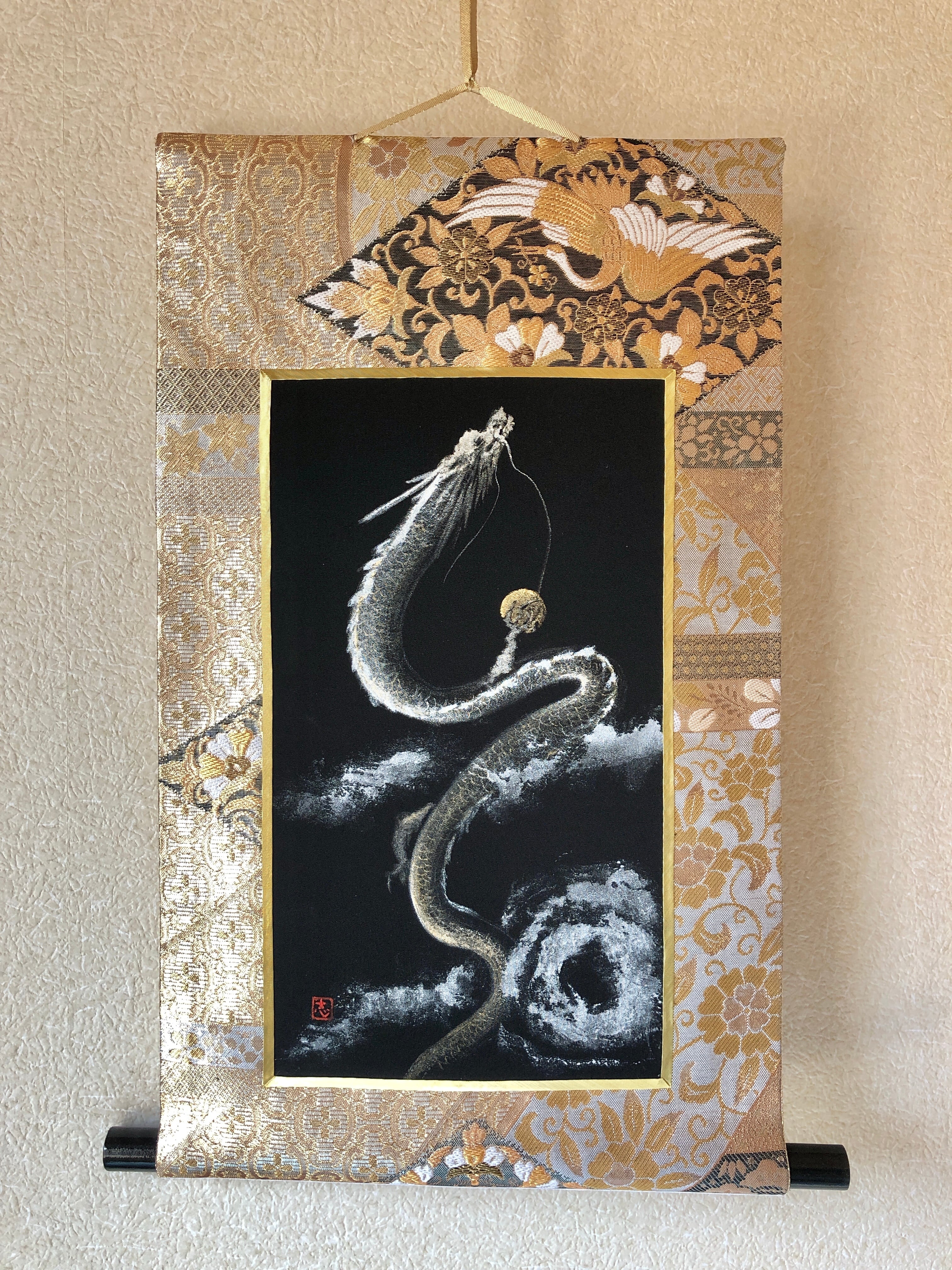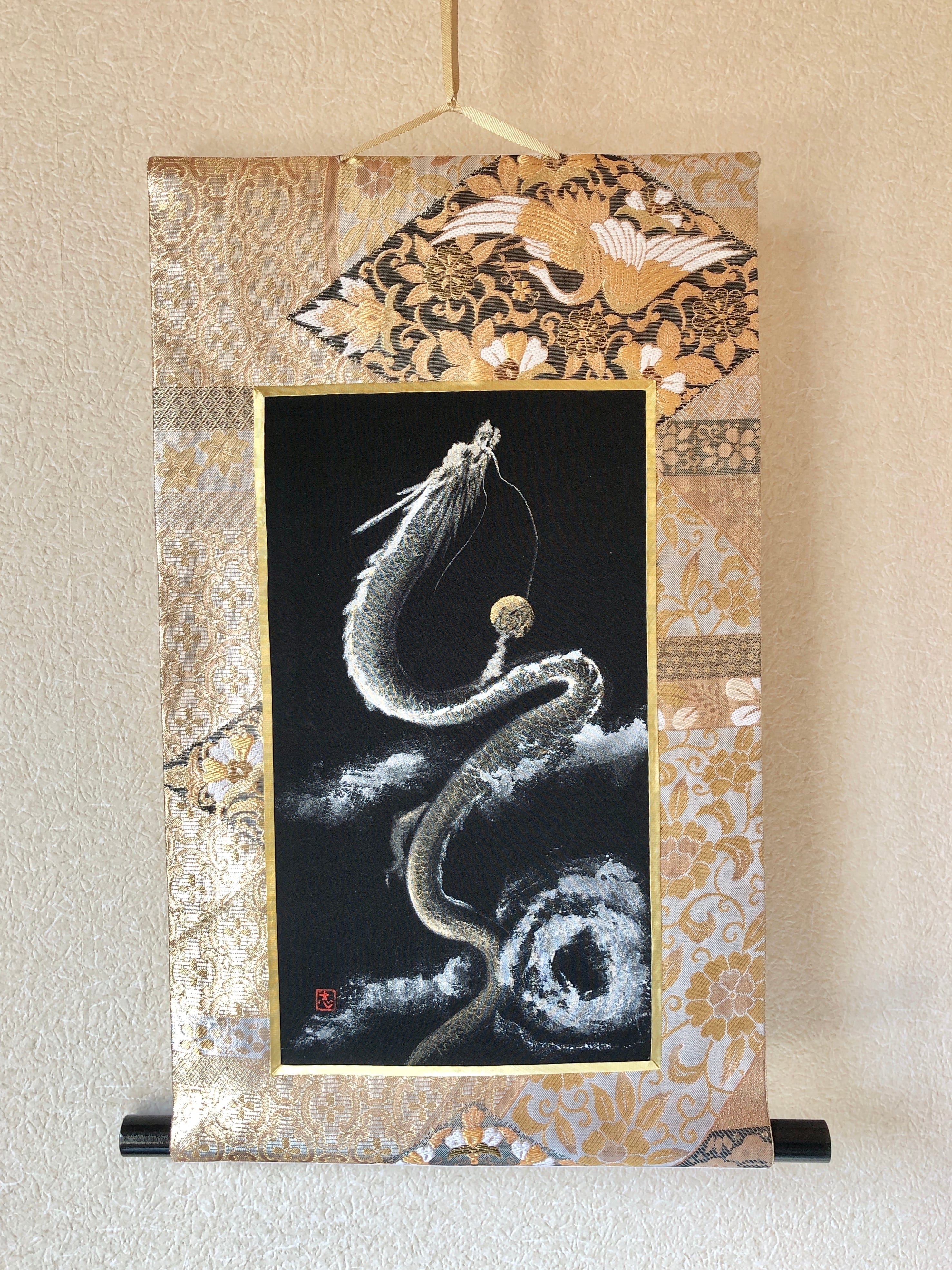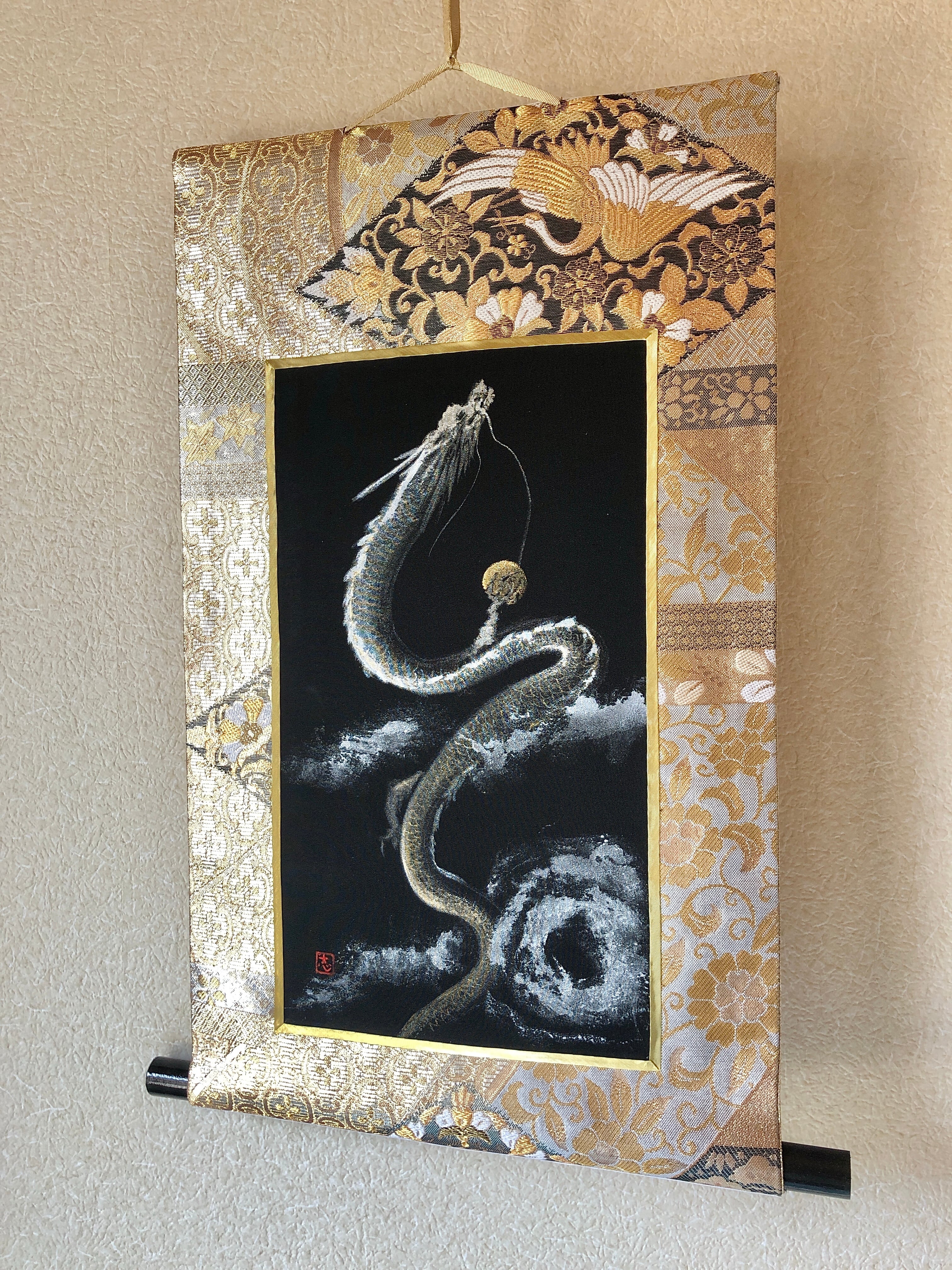 伝統的な日本の着物の袋帯を使用することで、豪華絢爛な美を持つだけなく、日本古来からの神との距離を縮めるパワーを持っている掛け軸です。