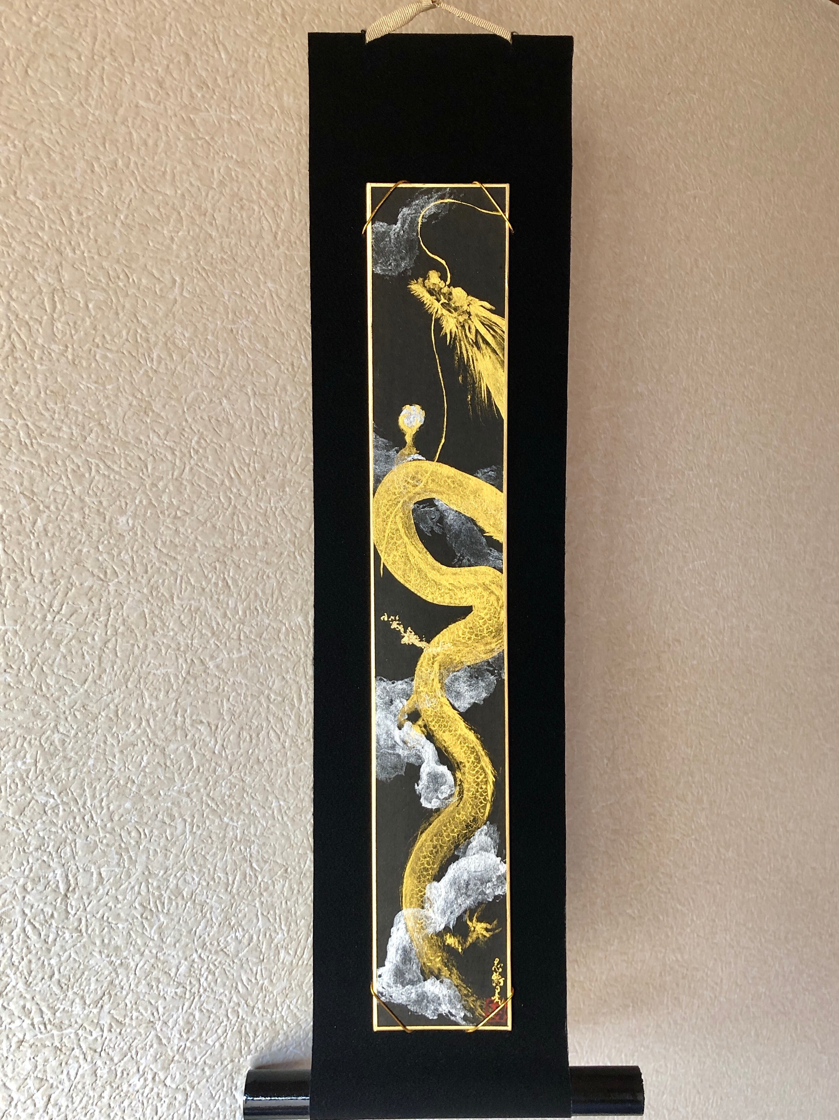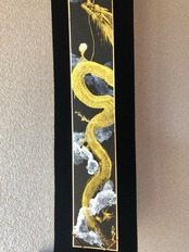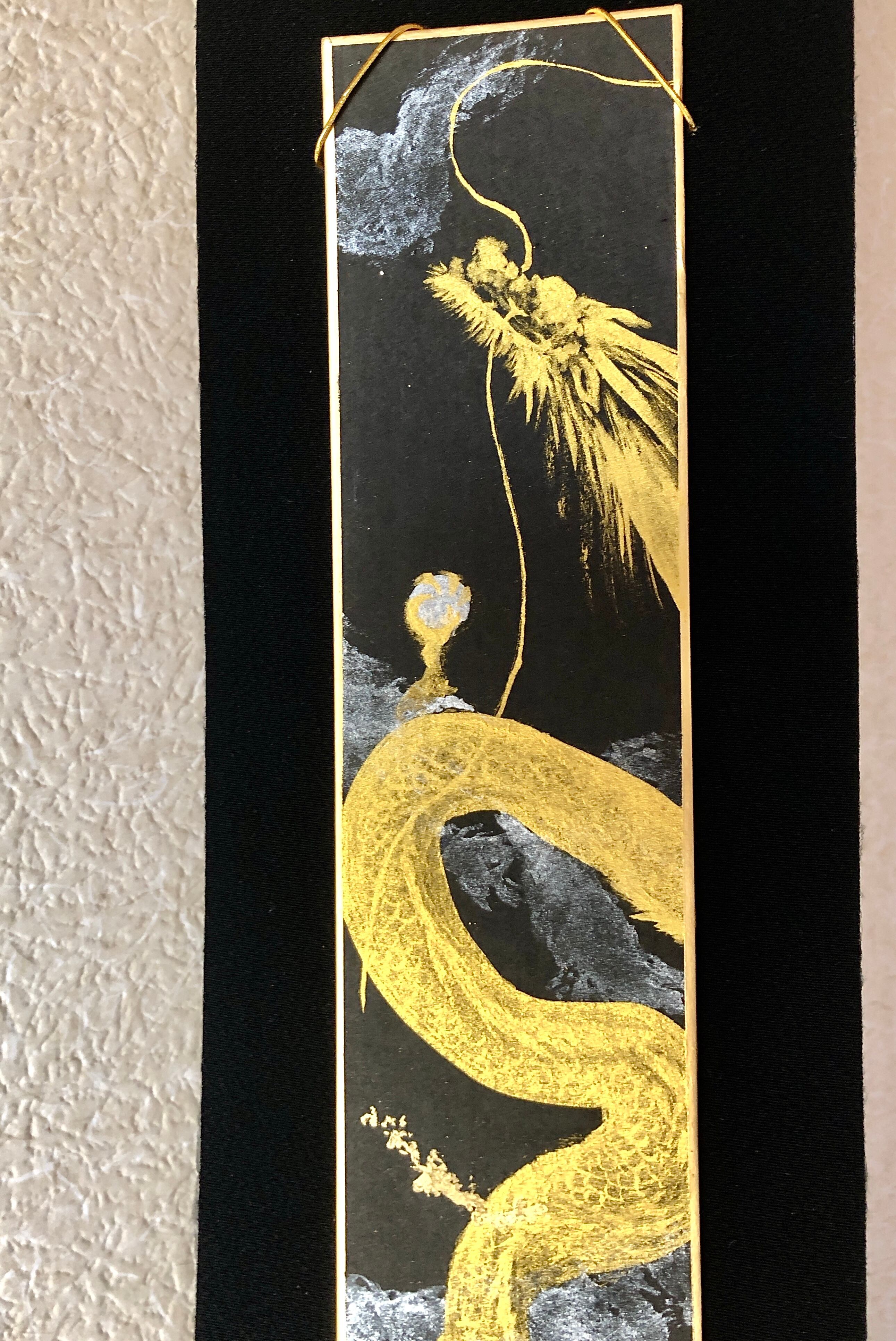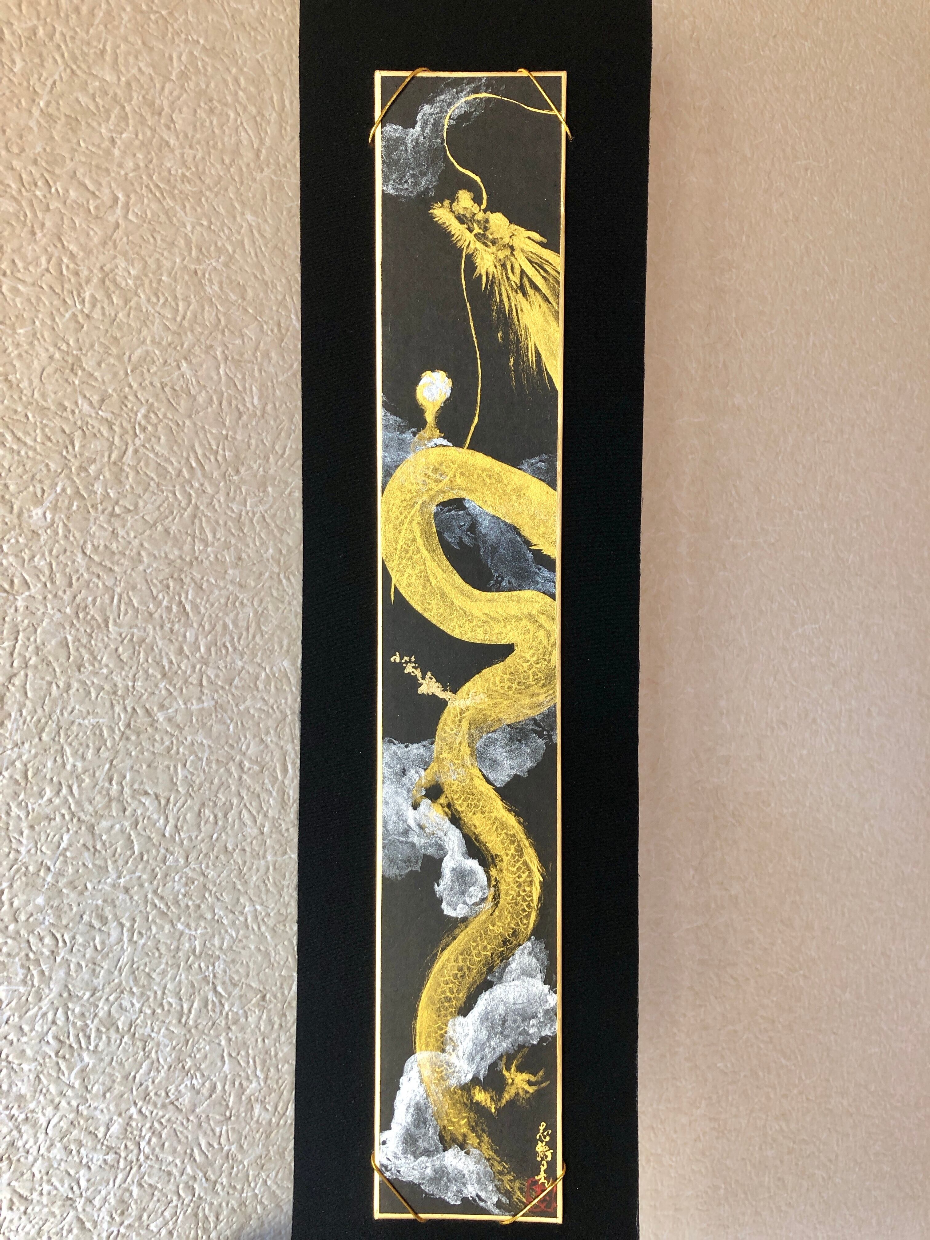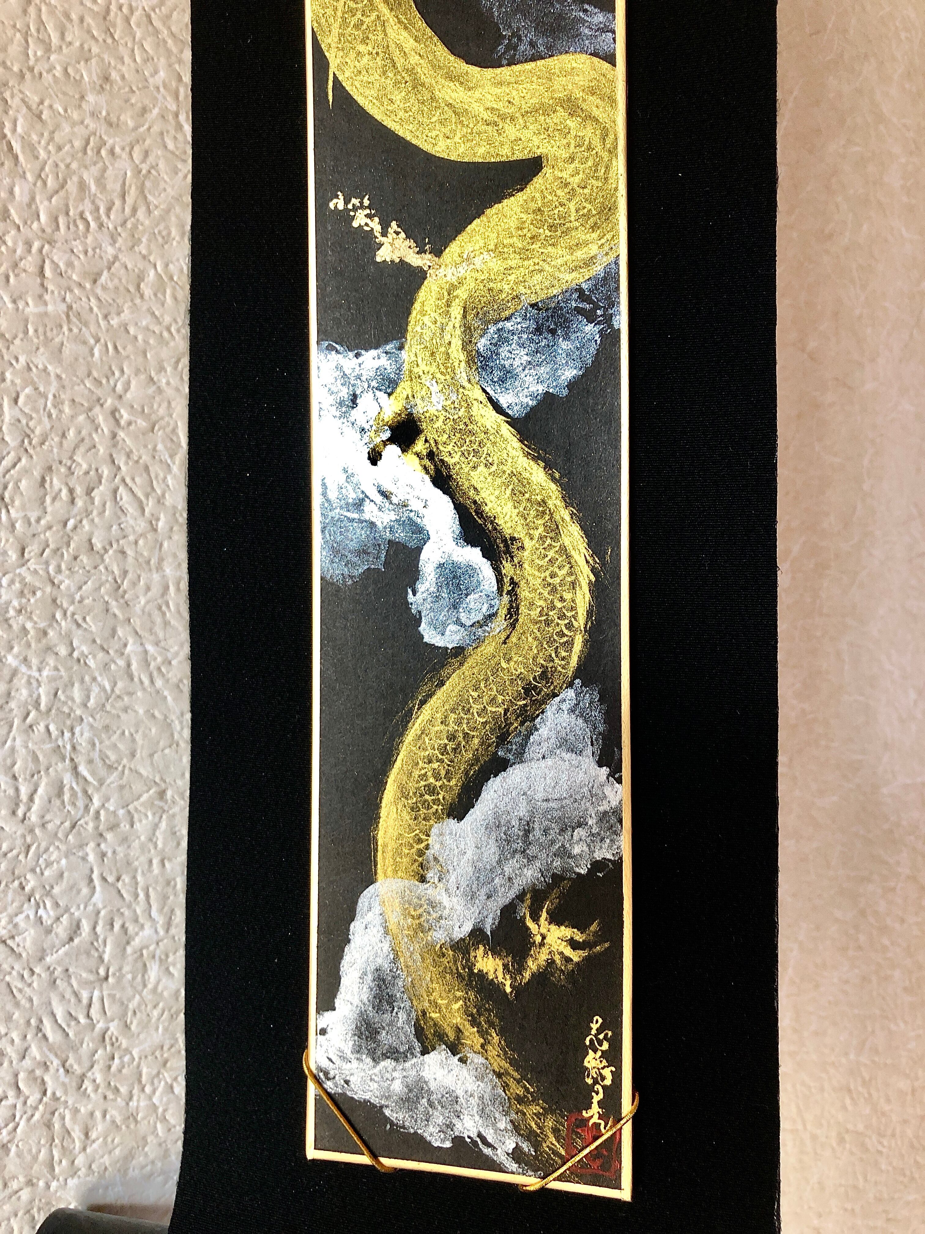 短冊の色紙を墨で黒くした背景に金墨で描いた金龍。