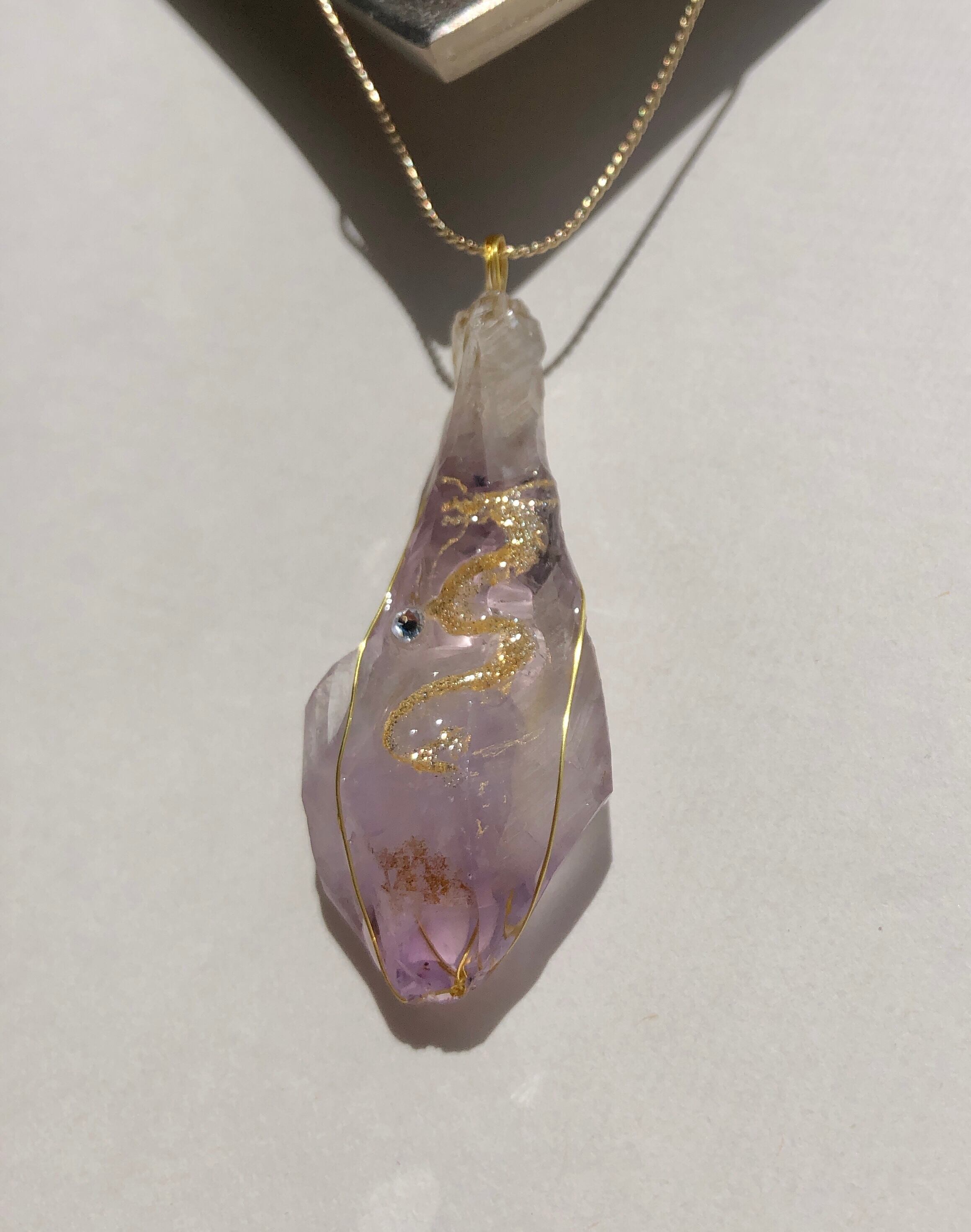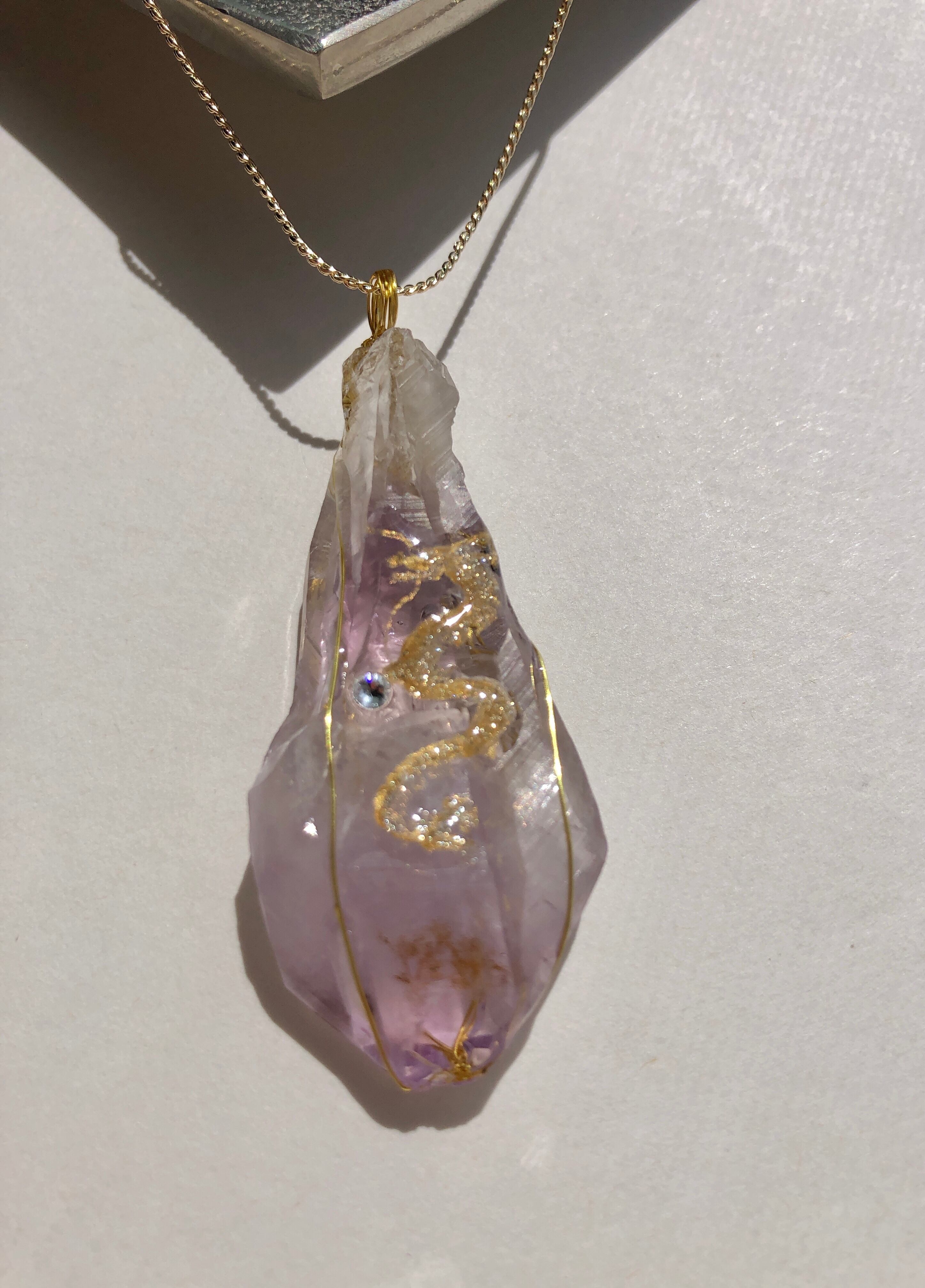 大きな原石のアメジストに金の龍神が描かれています。