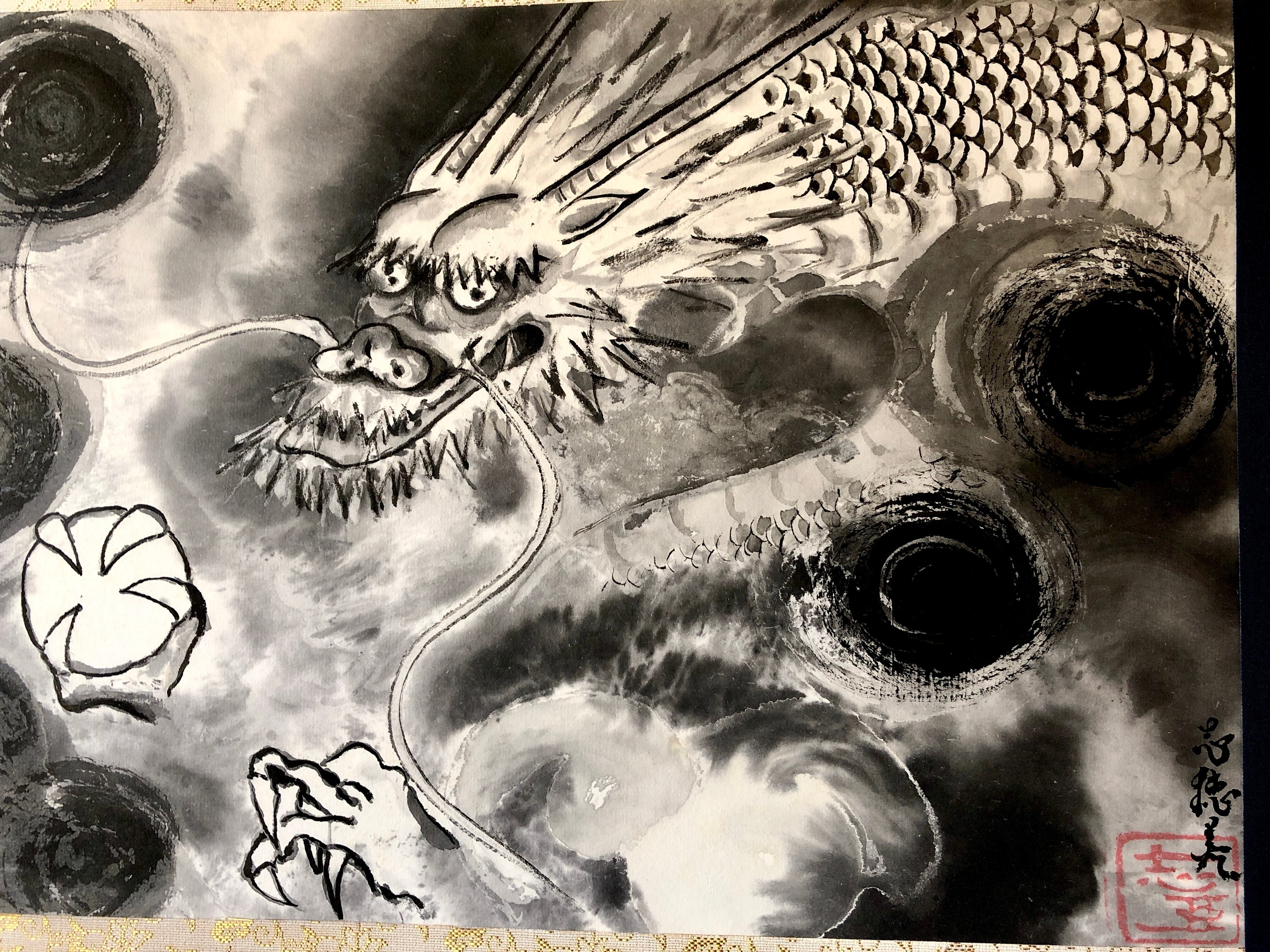 龍と渦巻く龍雲を、水墨の濃淡で表現しています。