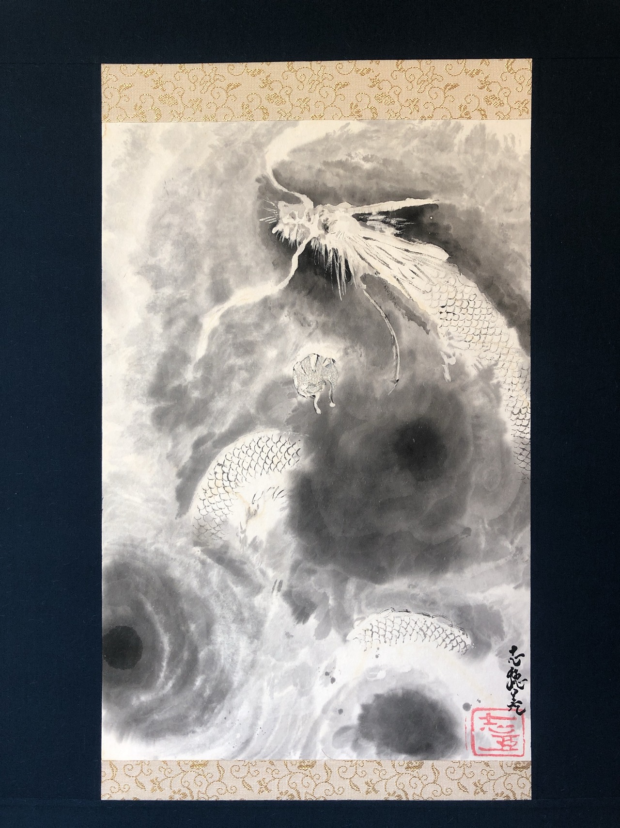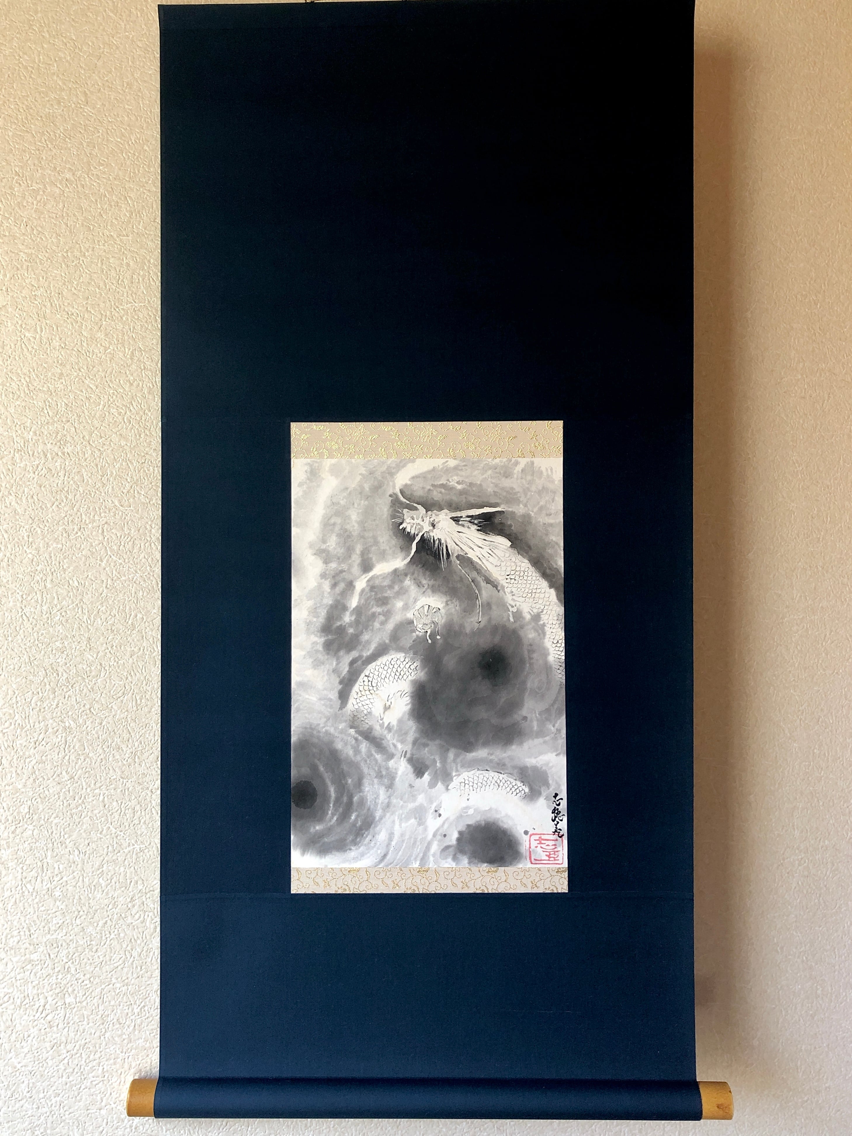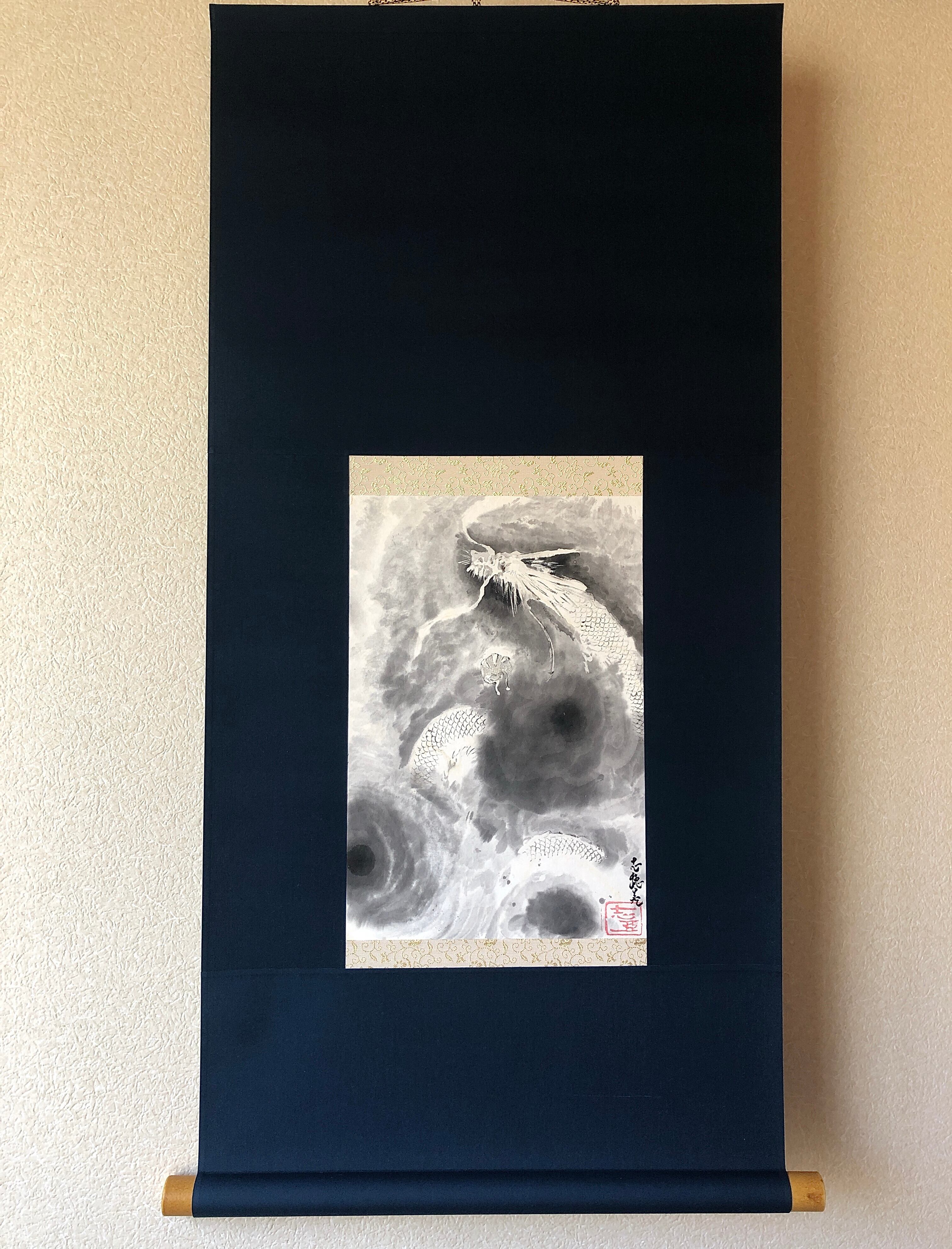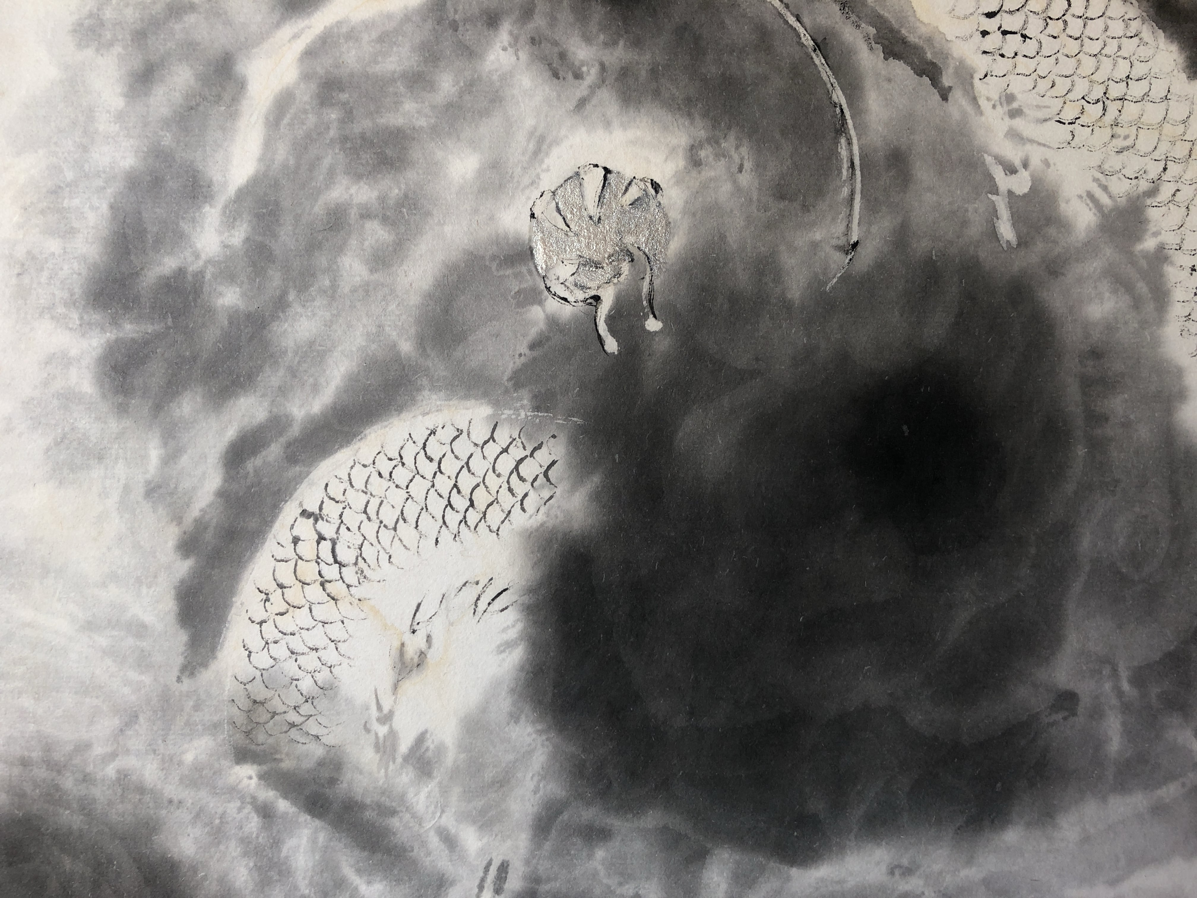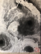 龍と渦巻く龍雲を、水墨の濃淡で表現しています。