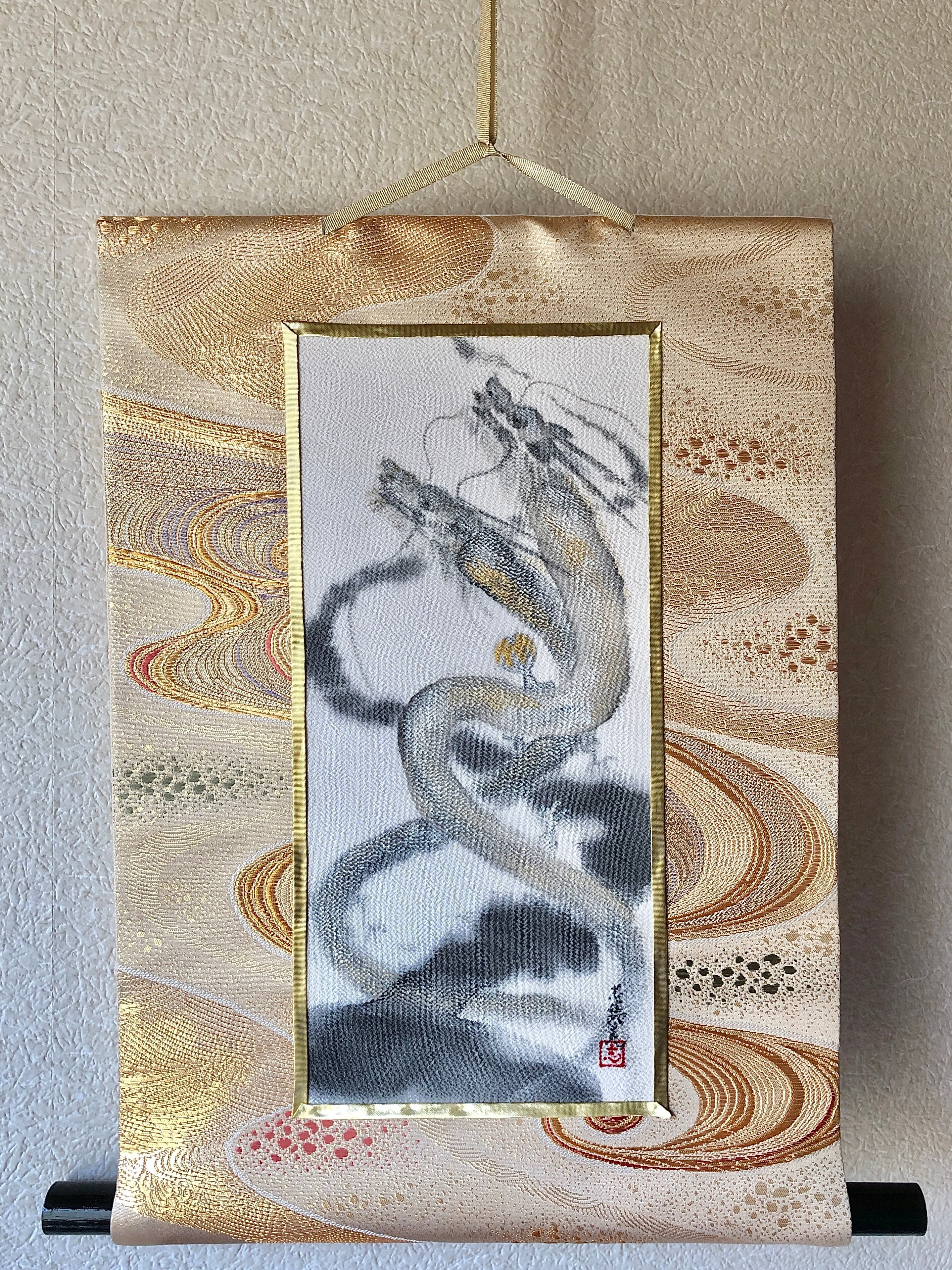 伝統的な日本の着物の袋帯を使用することで、豪華絢爛な美を持つだけなく、日本古来からの神との距離を縮めるパワーを持っている掛け軸です。