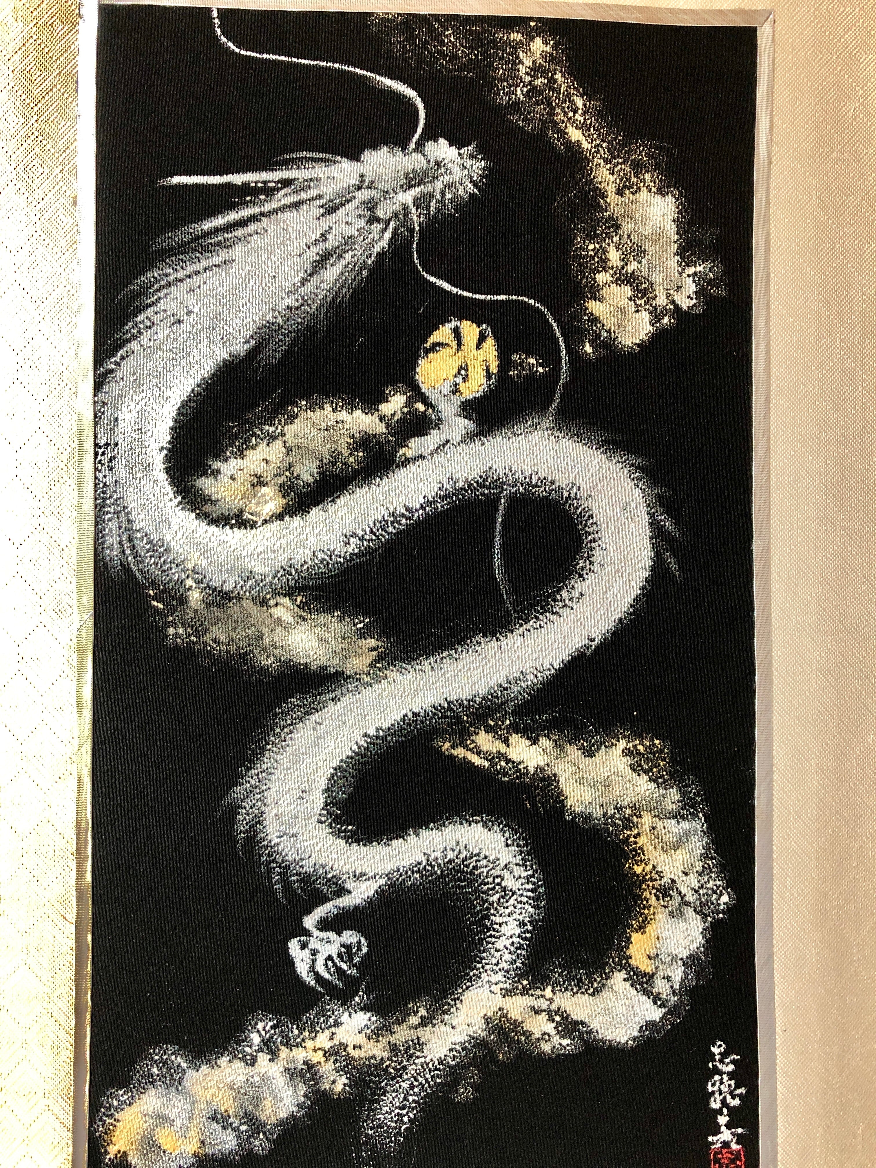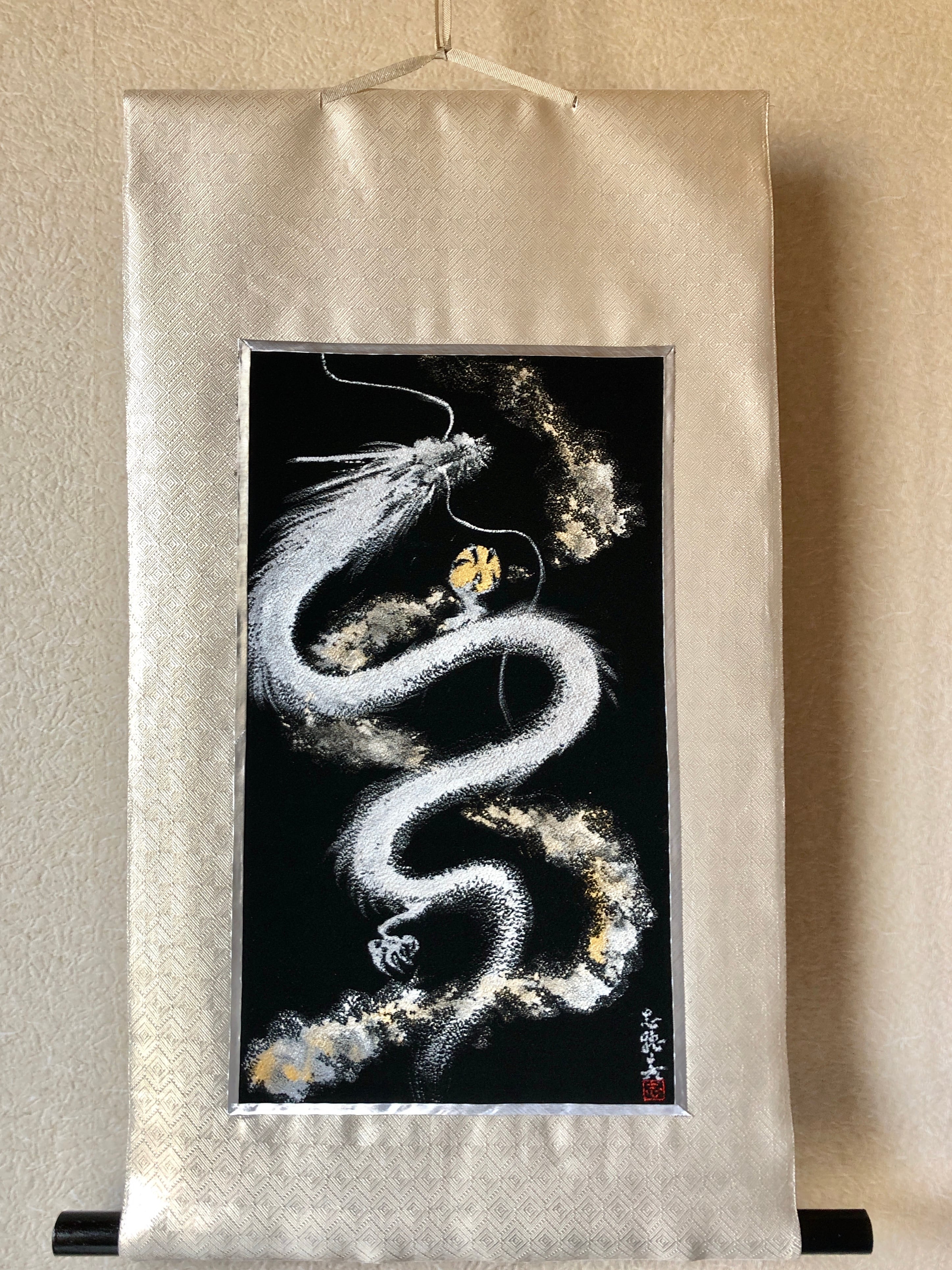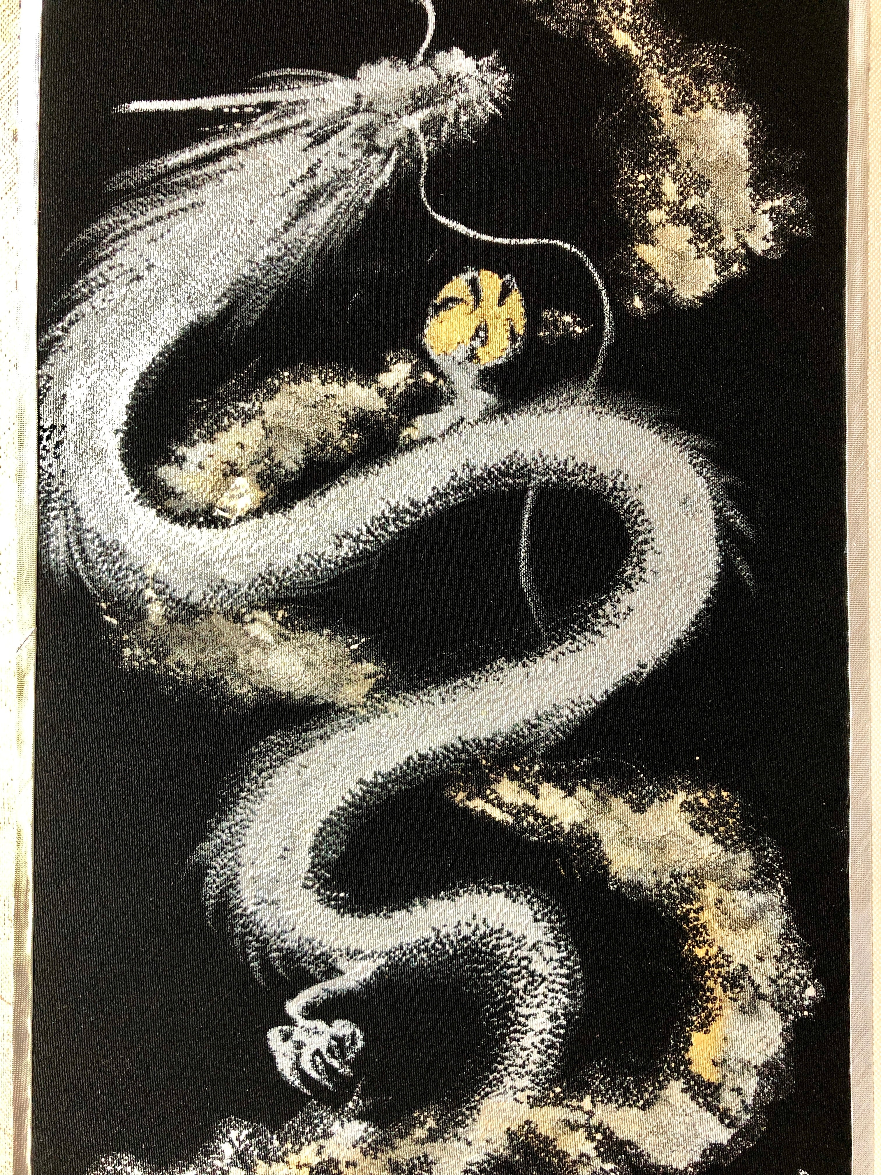 上へ昇る銀龍を金銀色に輝く龍雲が取り巻きます。