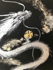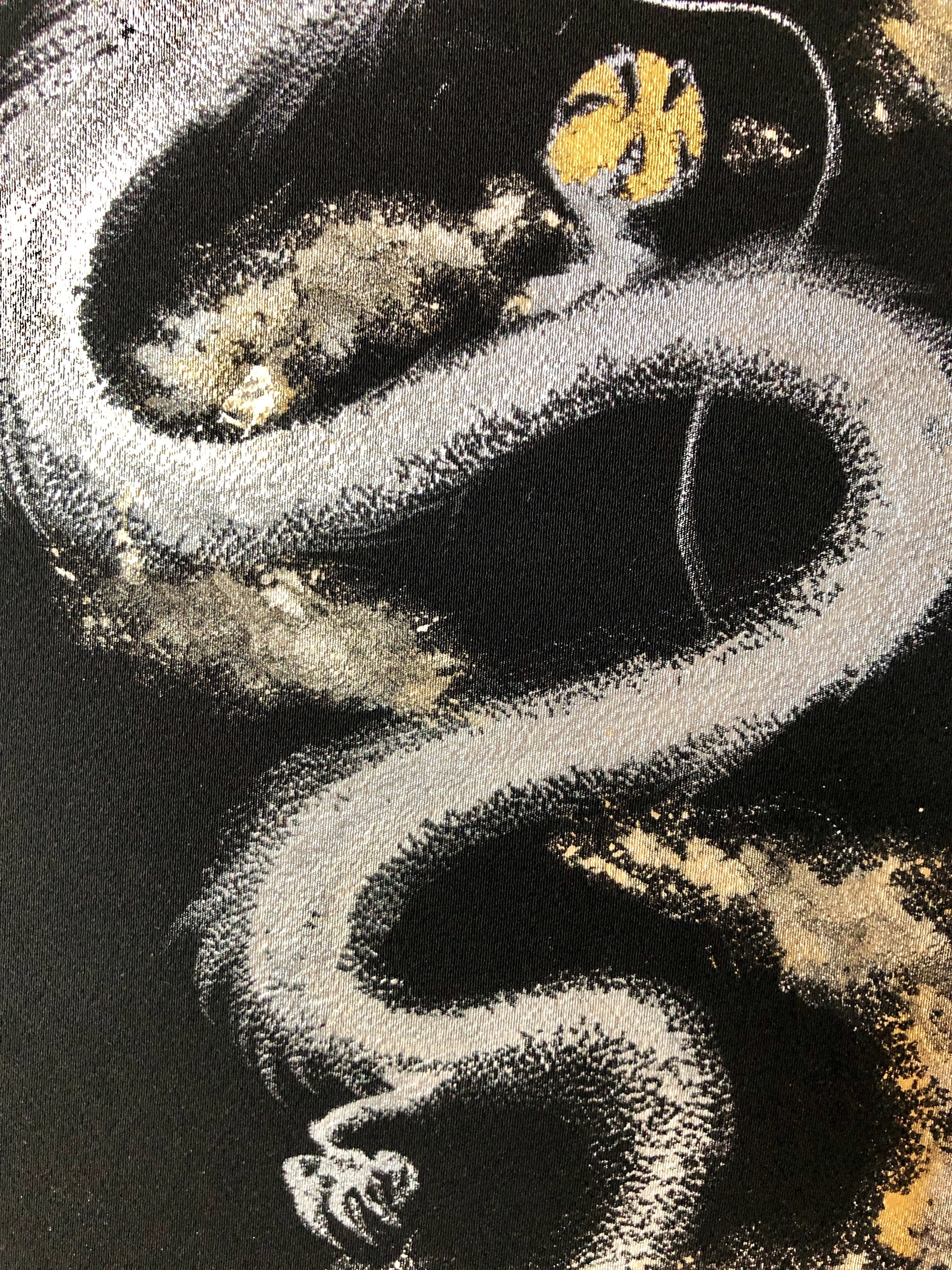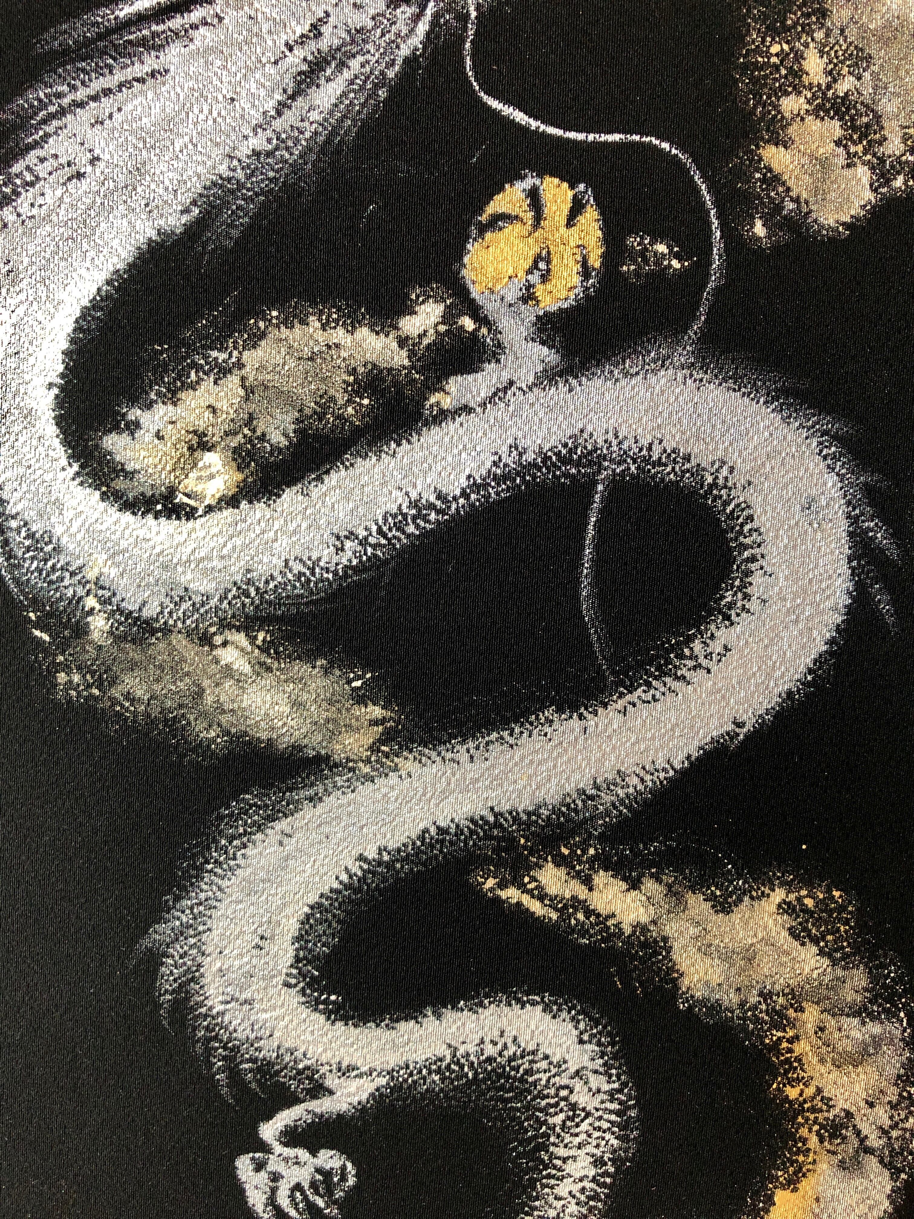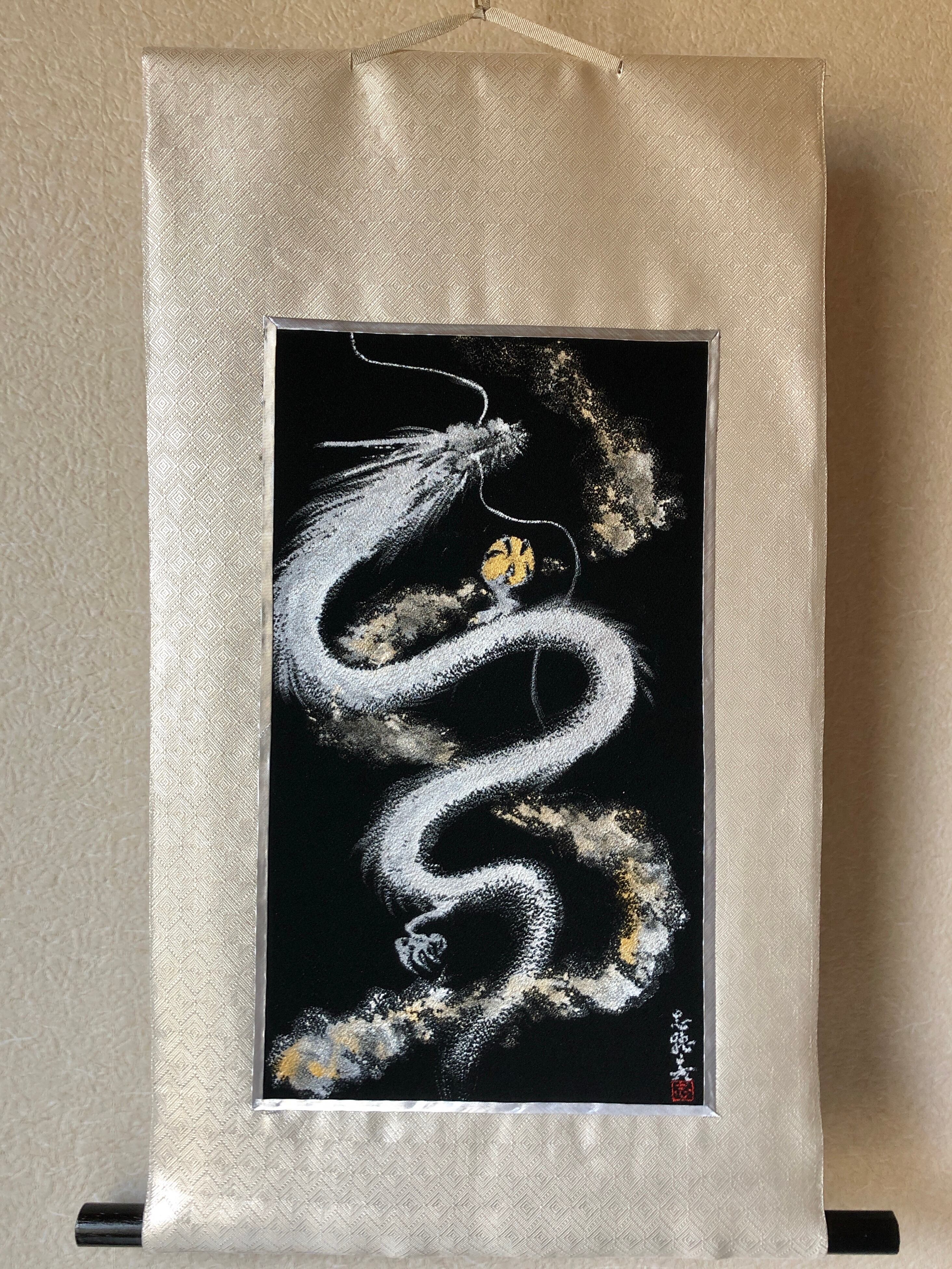 上へ昇る銀龍を金銀色に輝く龍雲が取り巻きます。