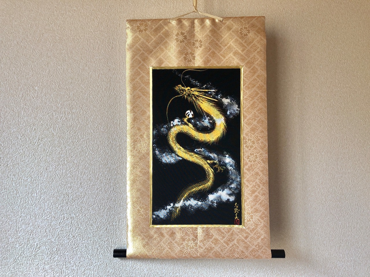 黒の正絹に描いた金龍。