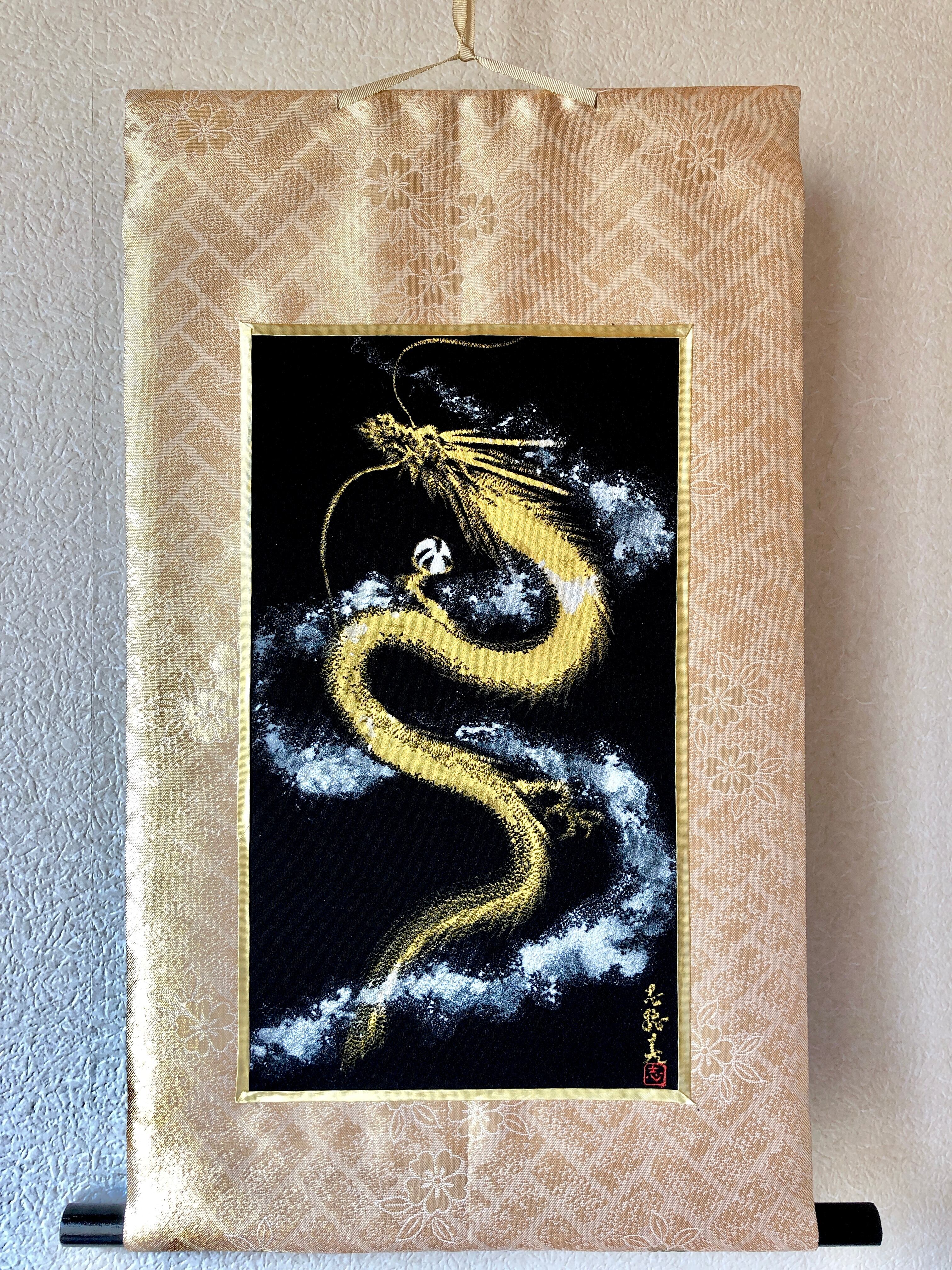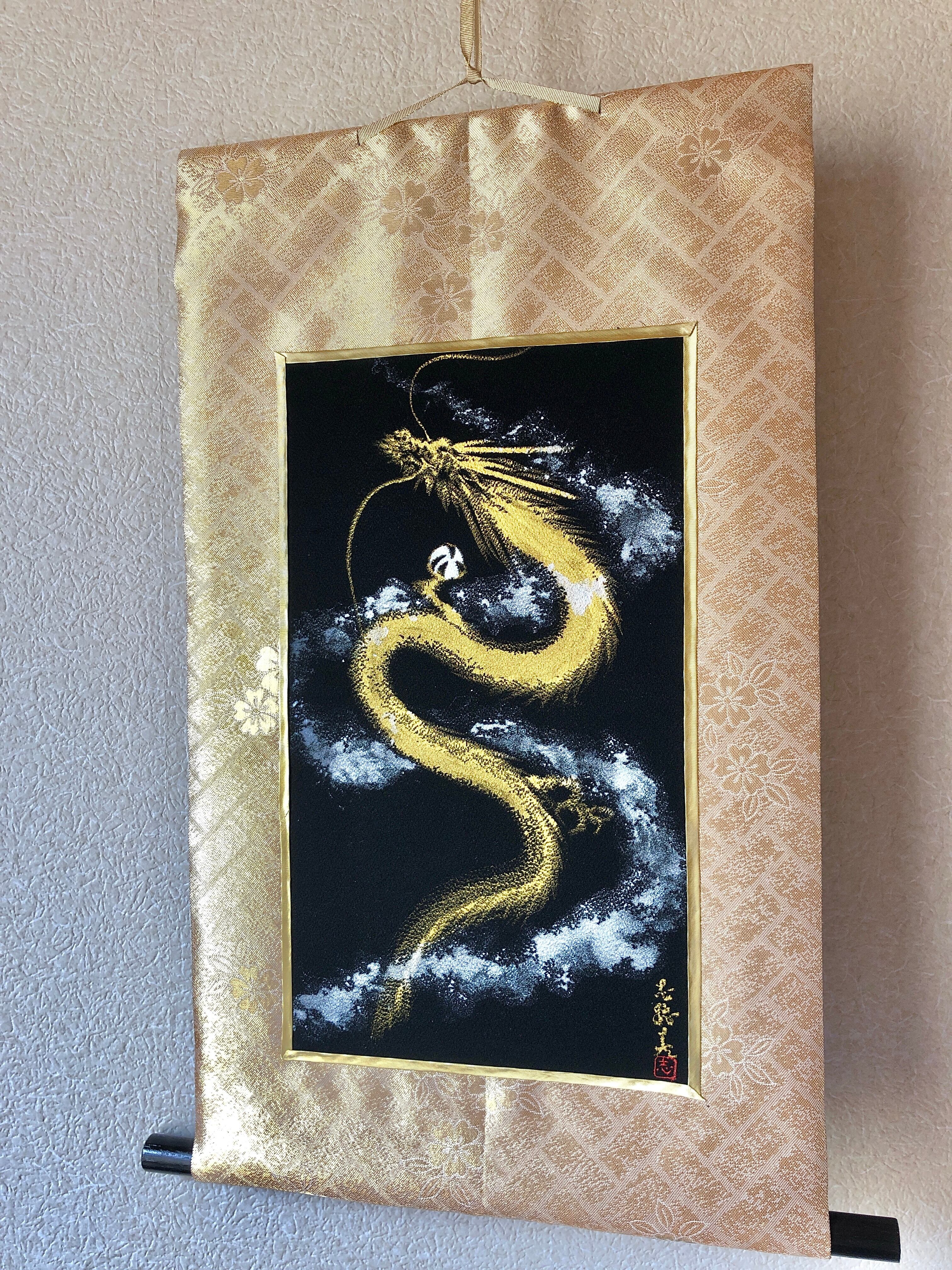 伝統的な日本の着物の袋帯を使用することで、豪華絢爛な美を持つだけなく、日本古来からの神との距離を縮めるパワーを持っている掛け軸です。