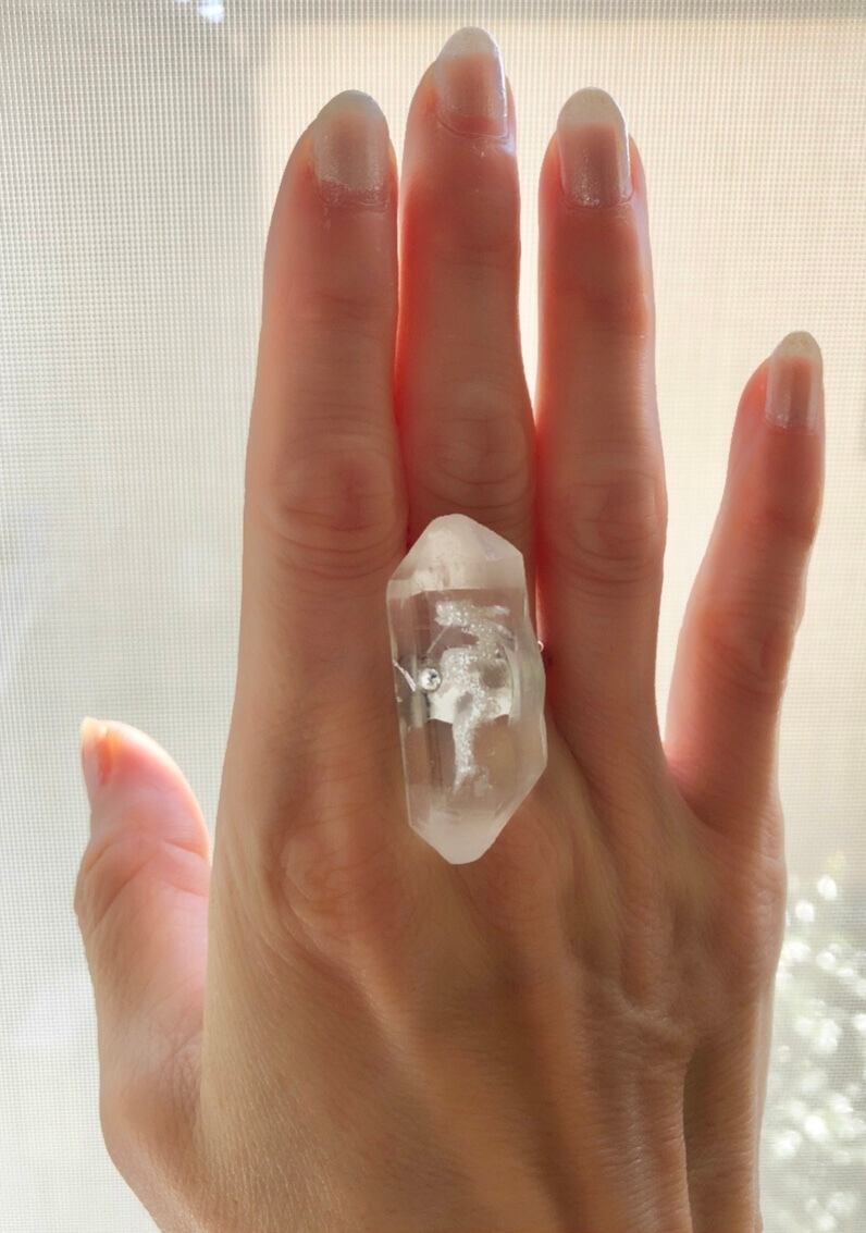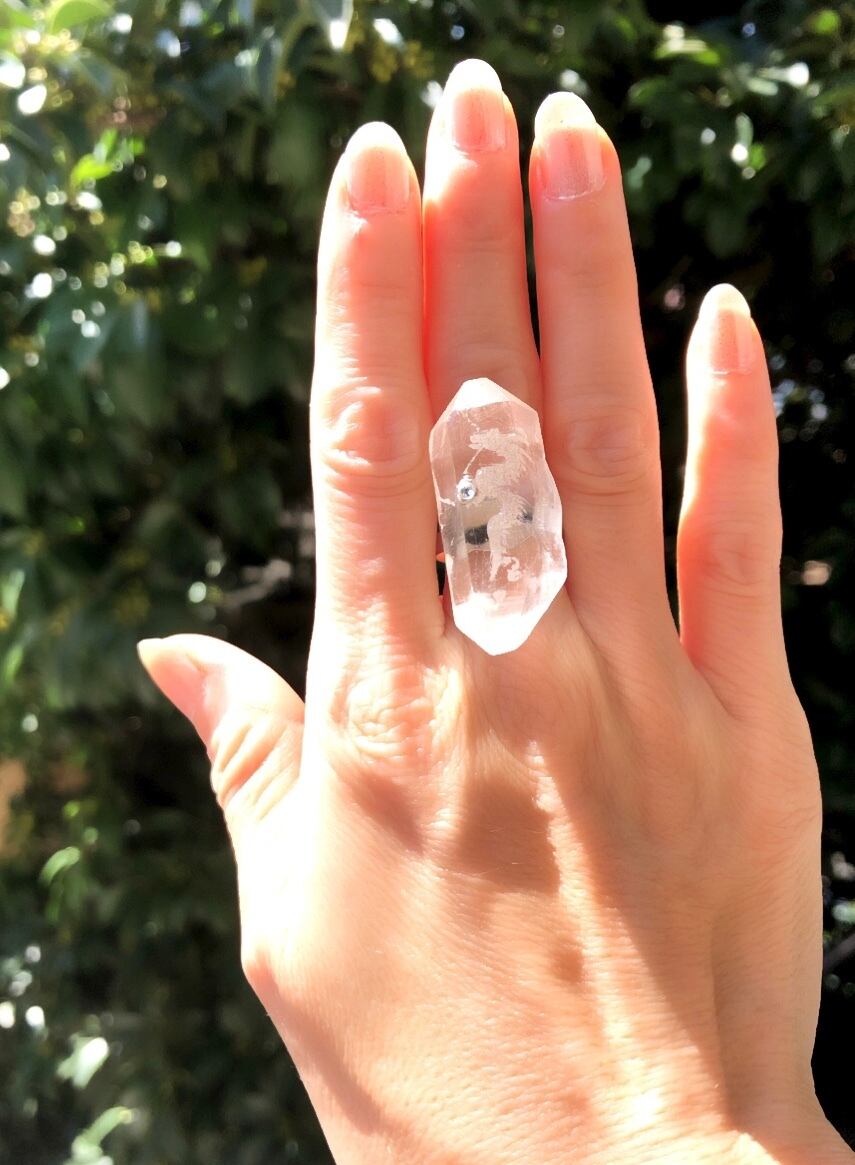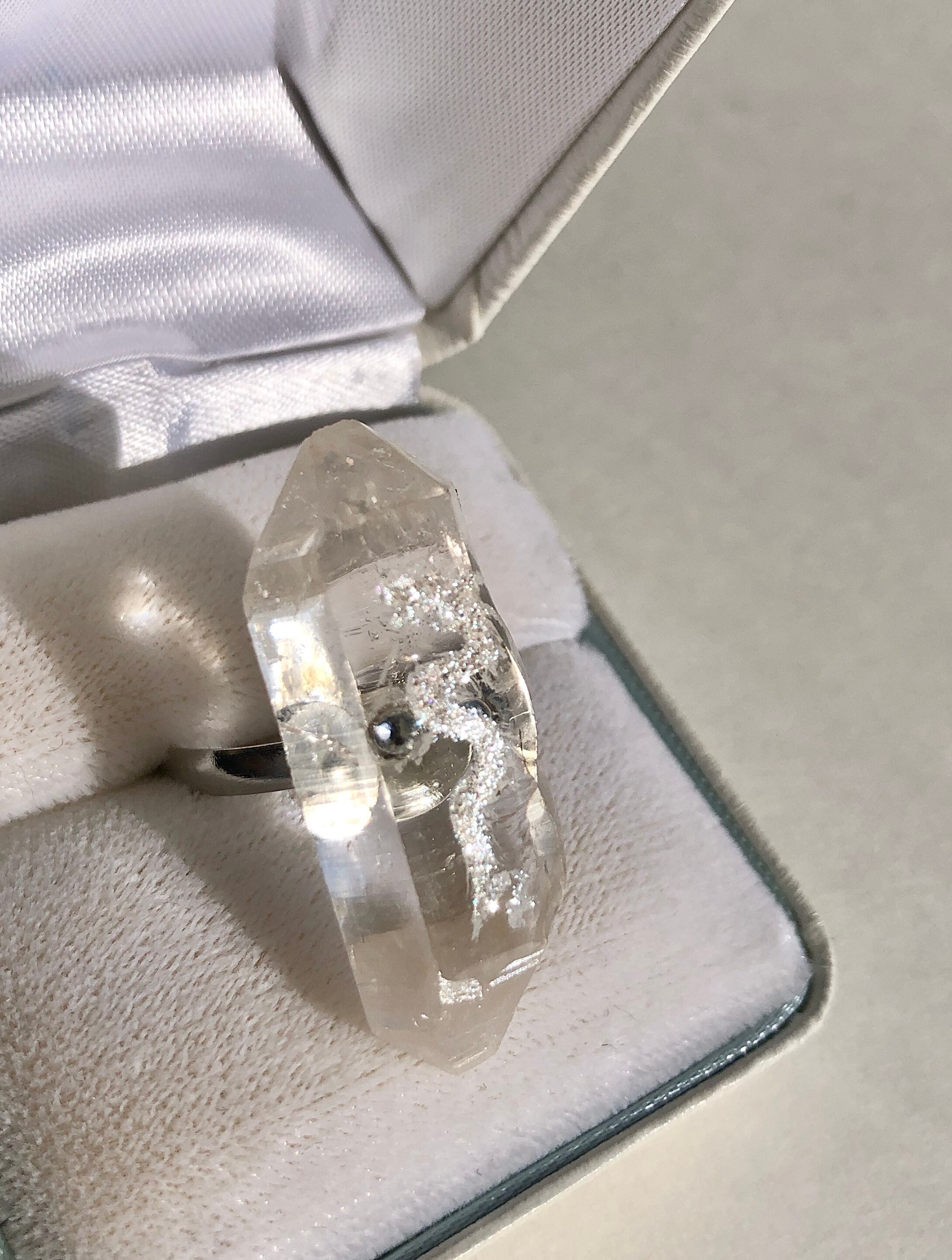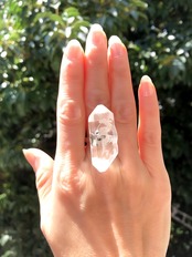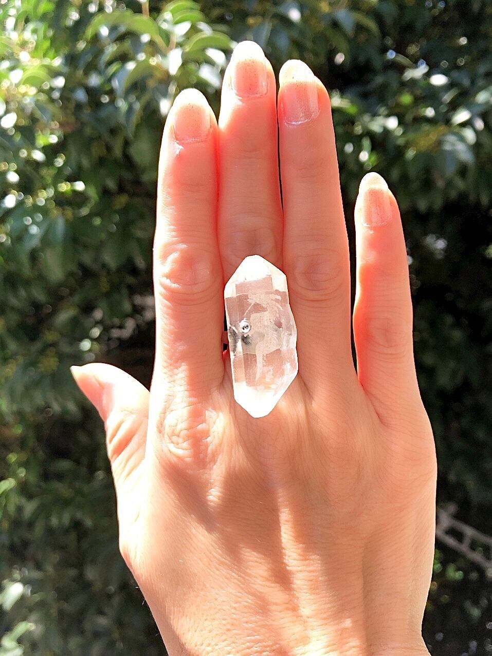 存在感のある大きなダブルポイント水晶の美しい指輪です。
