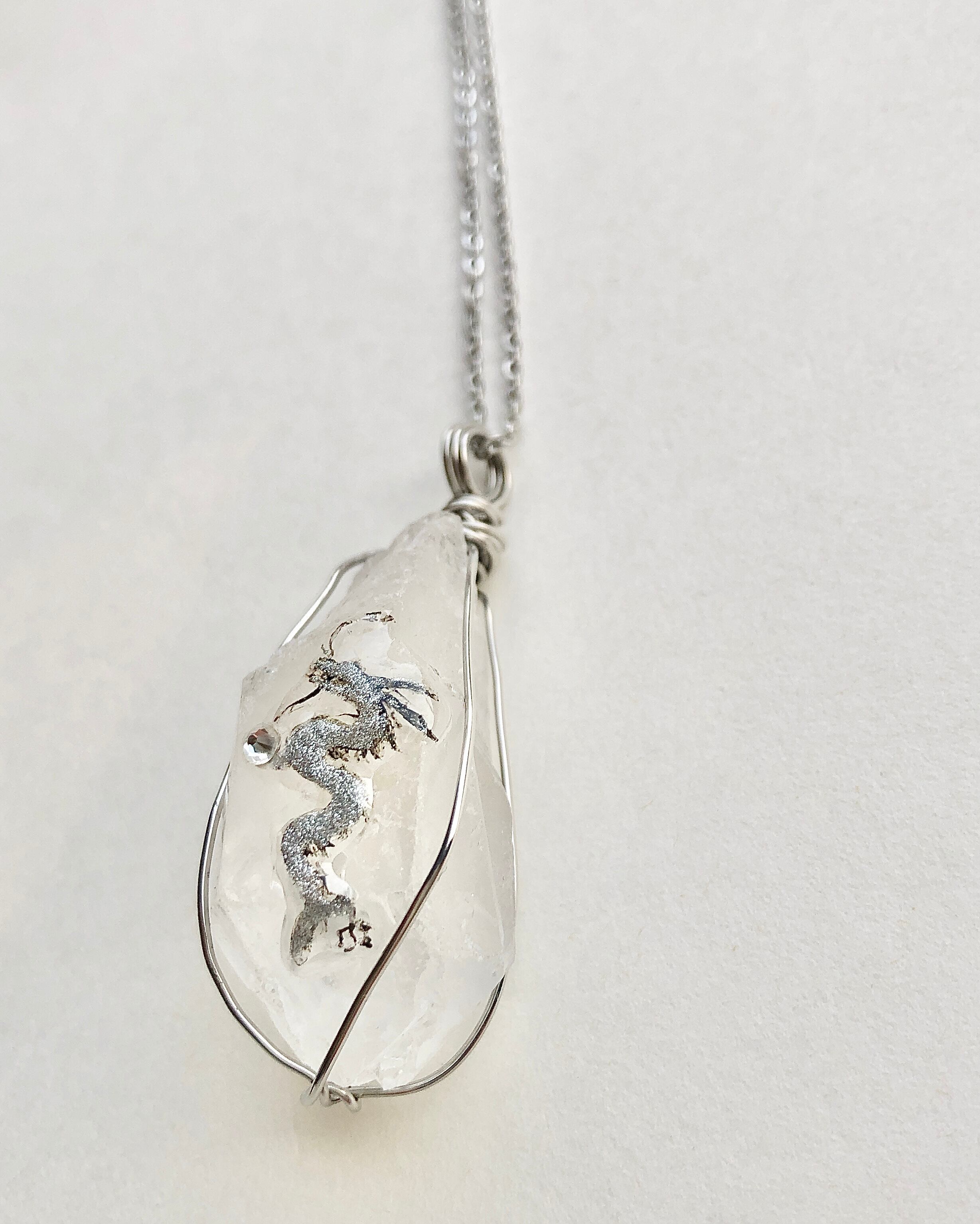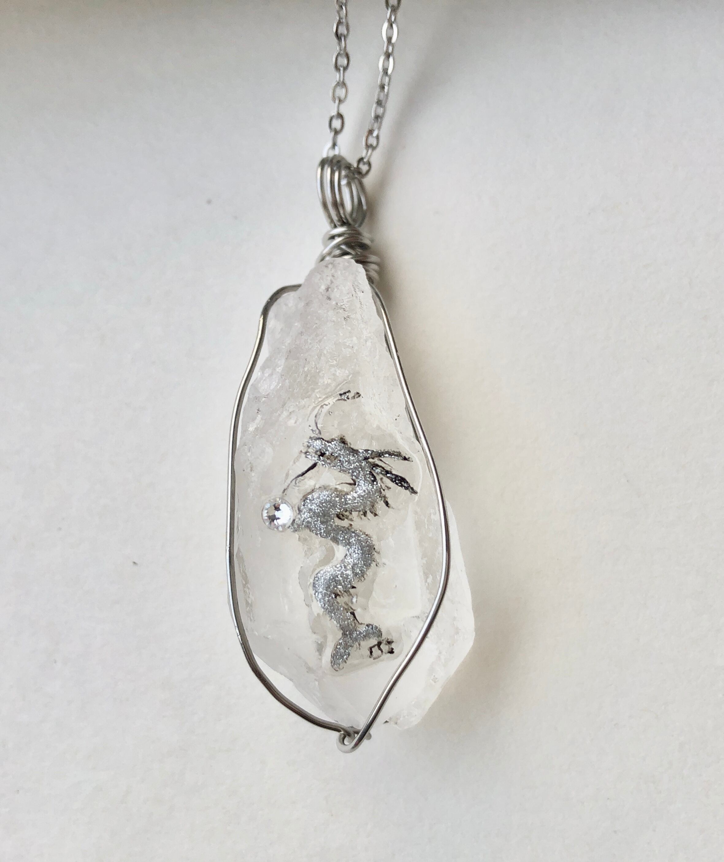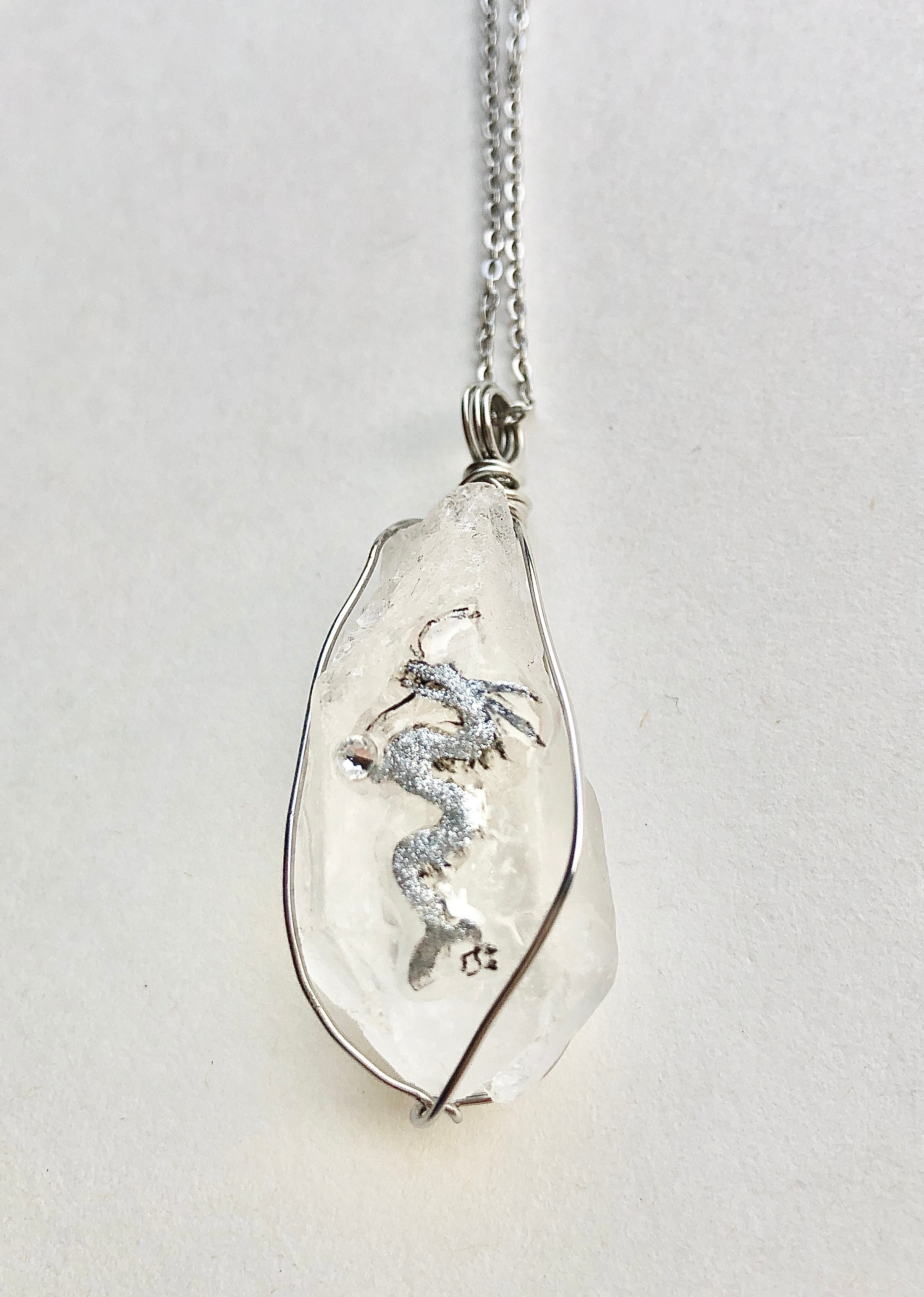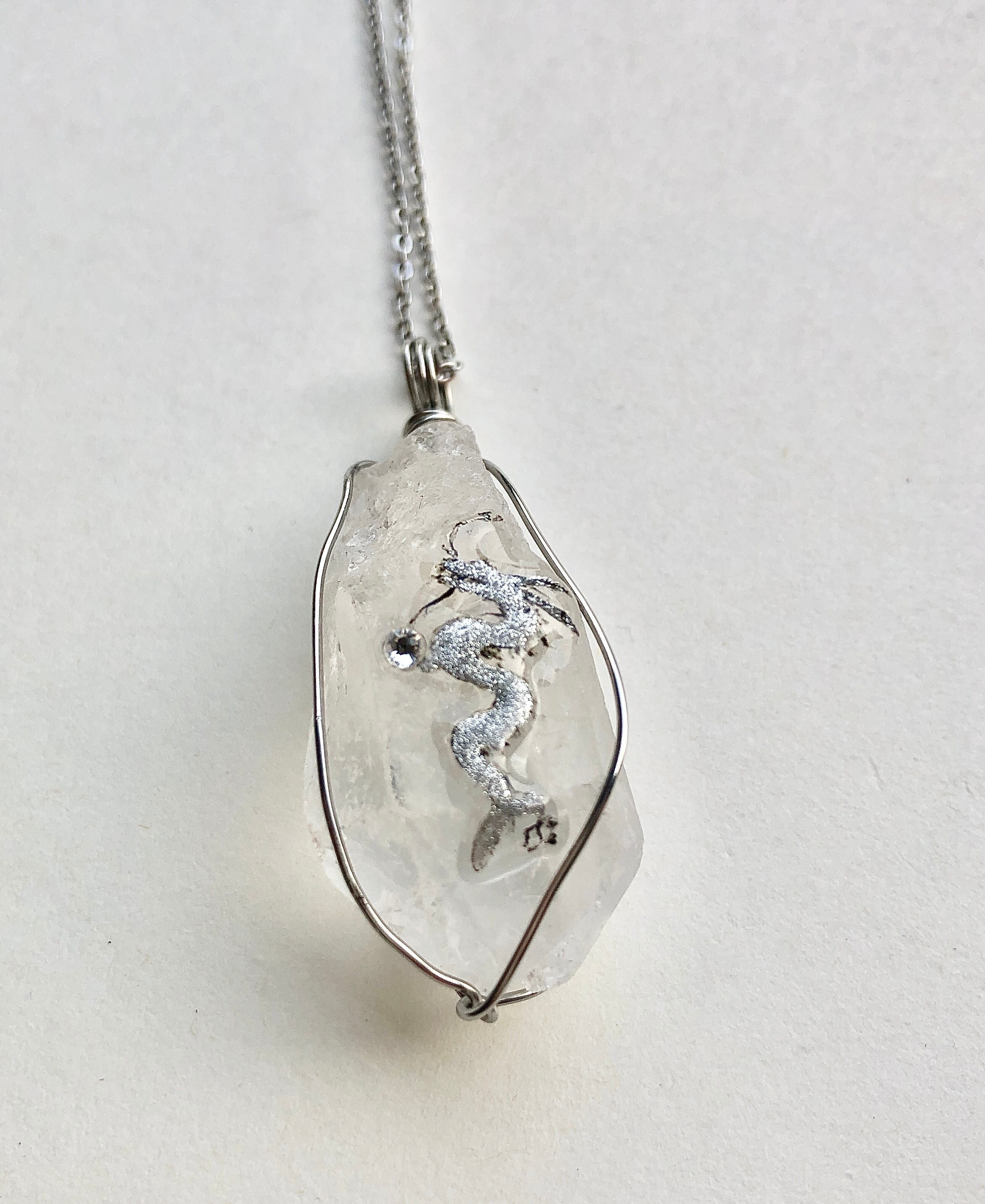 存在感あふれる大きな原石水晶の銀龍ネックレス。