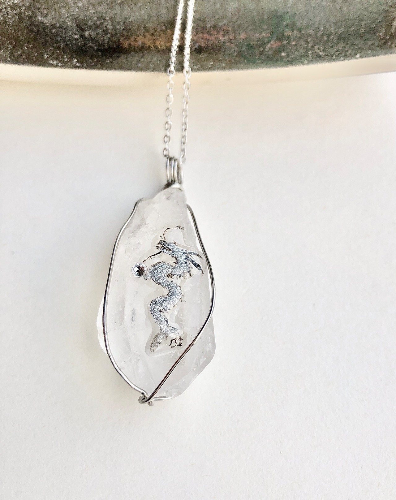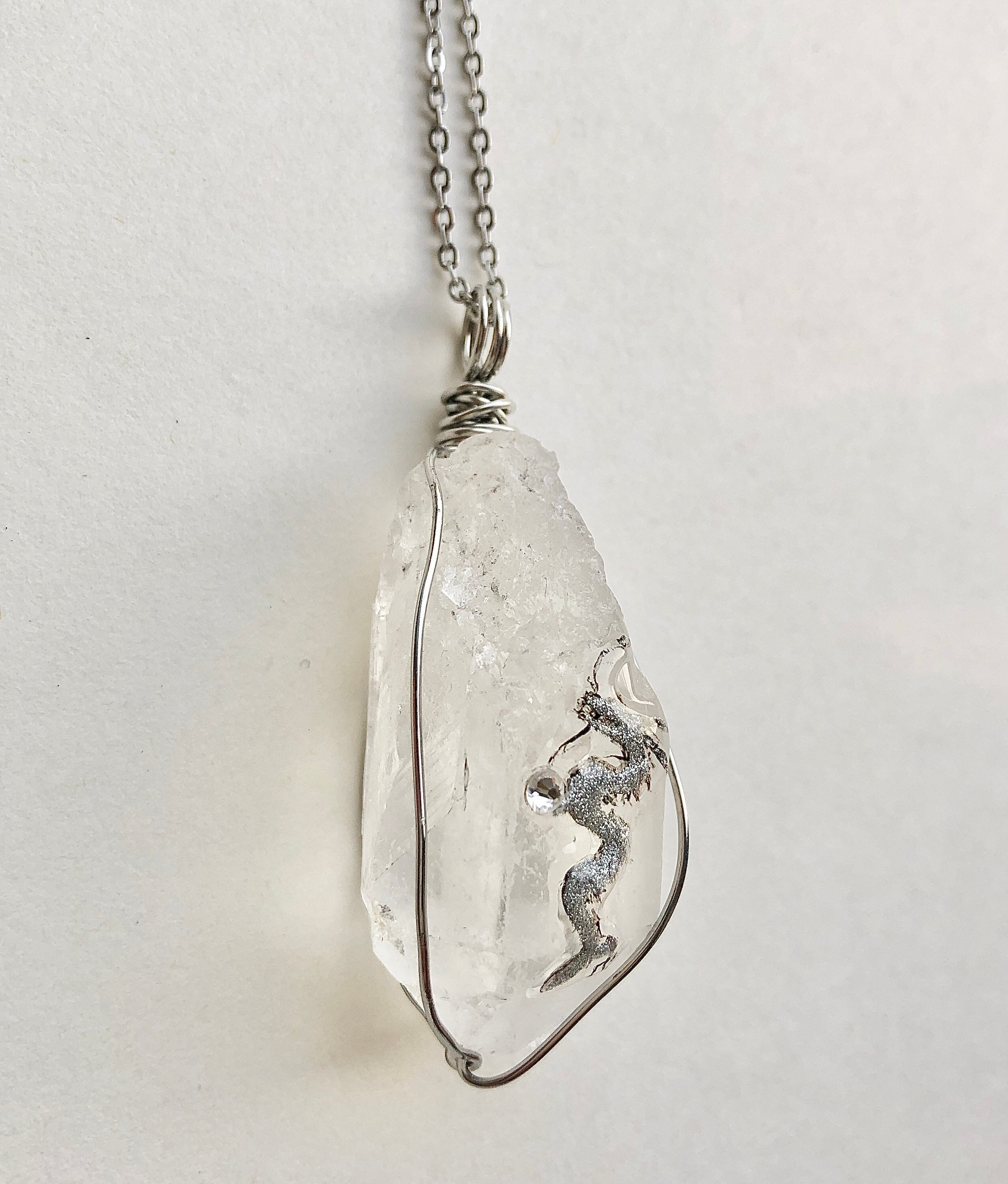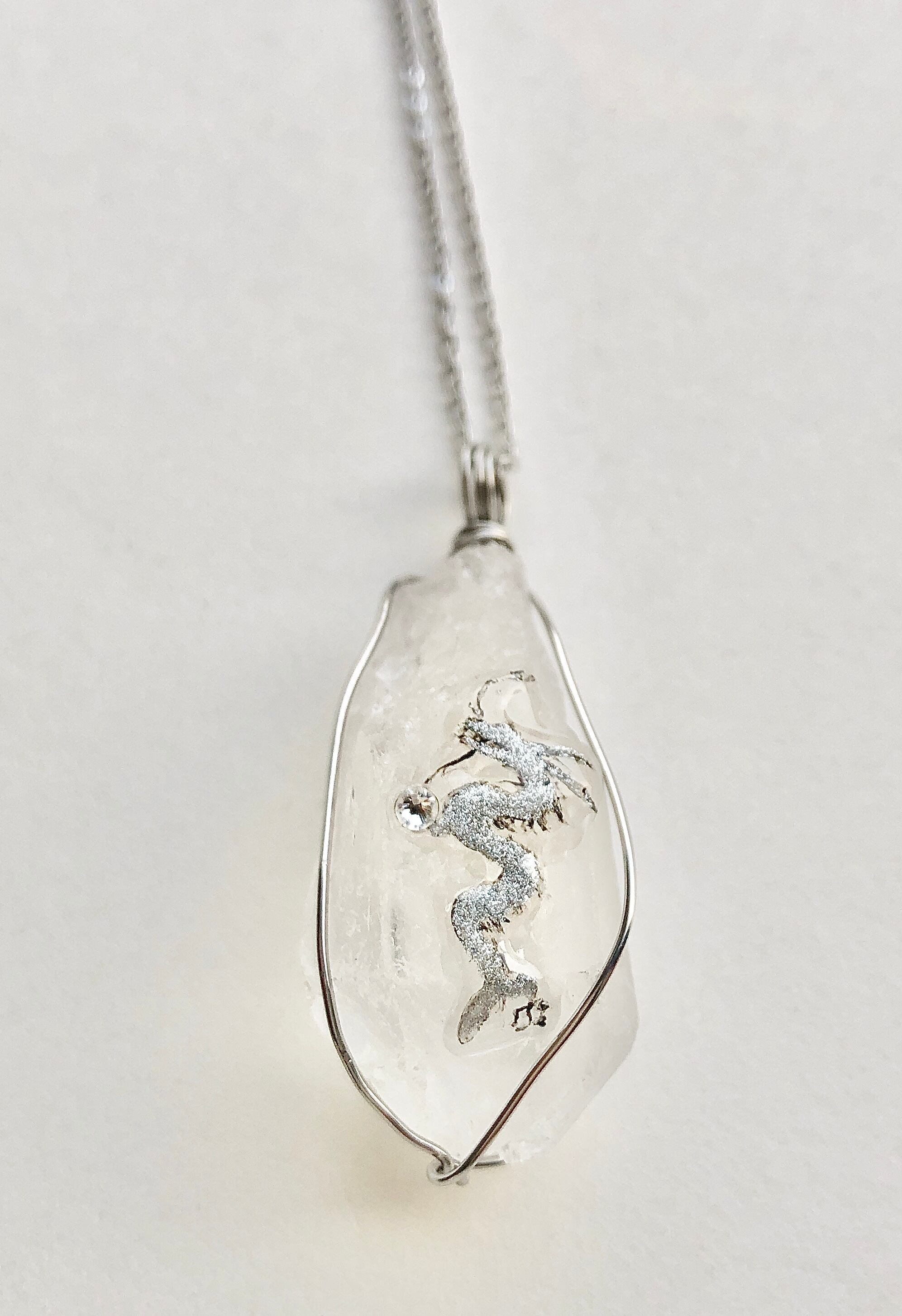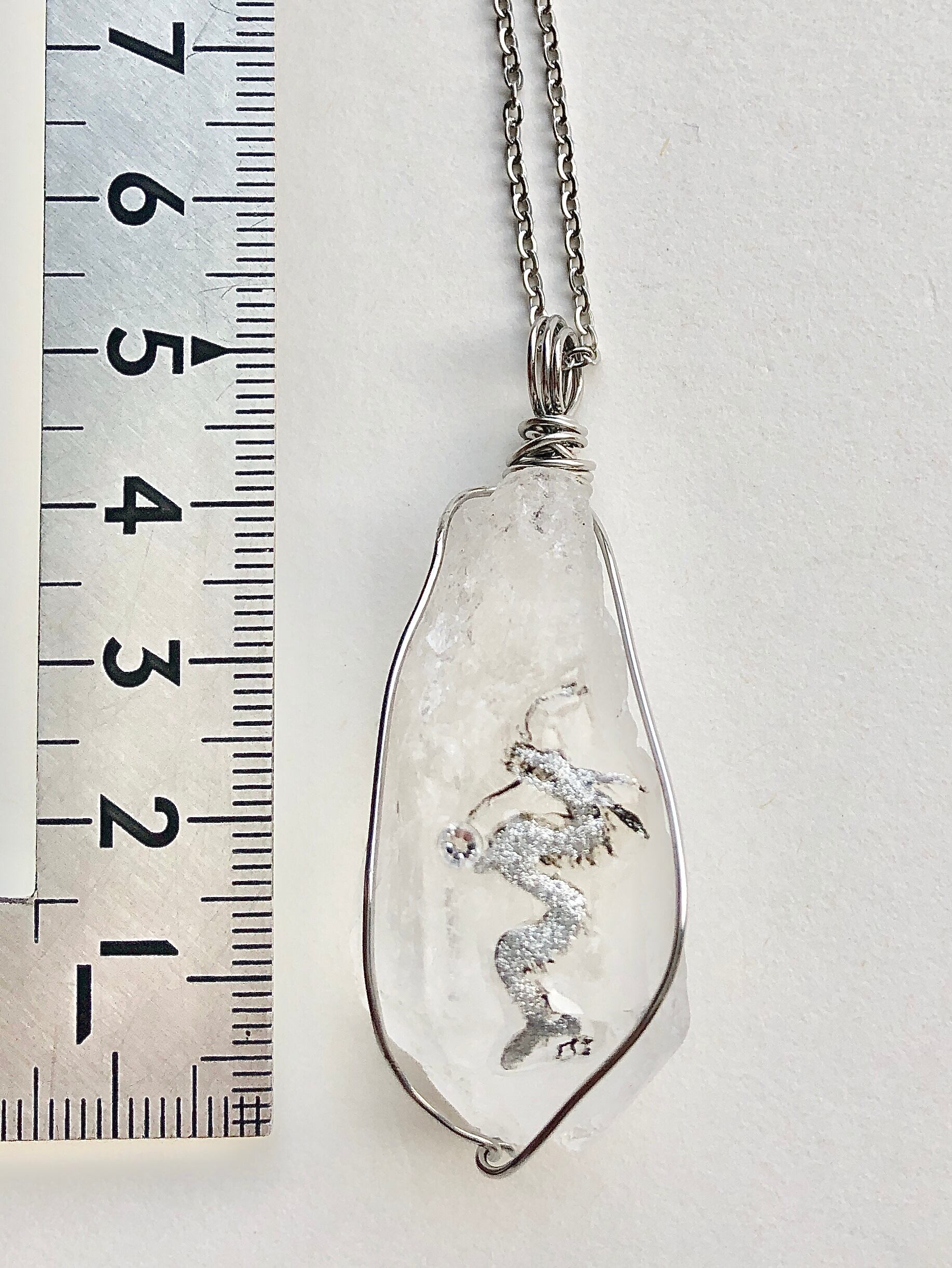 存在感あふれる大きな原石水晶の銀龍ネックレス。