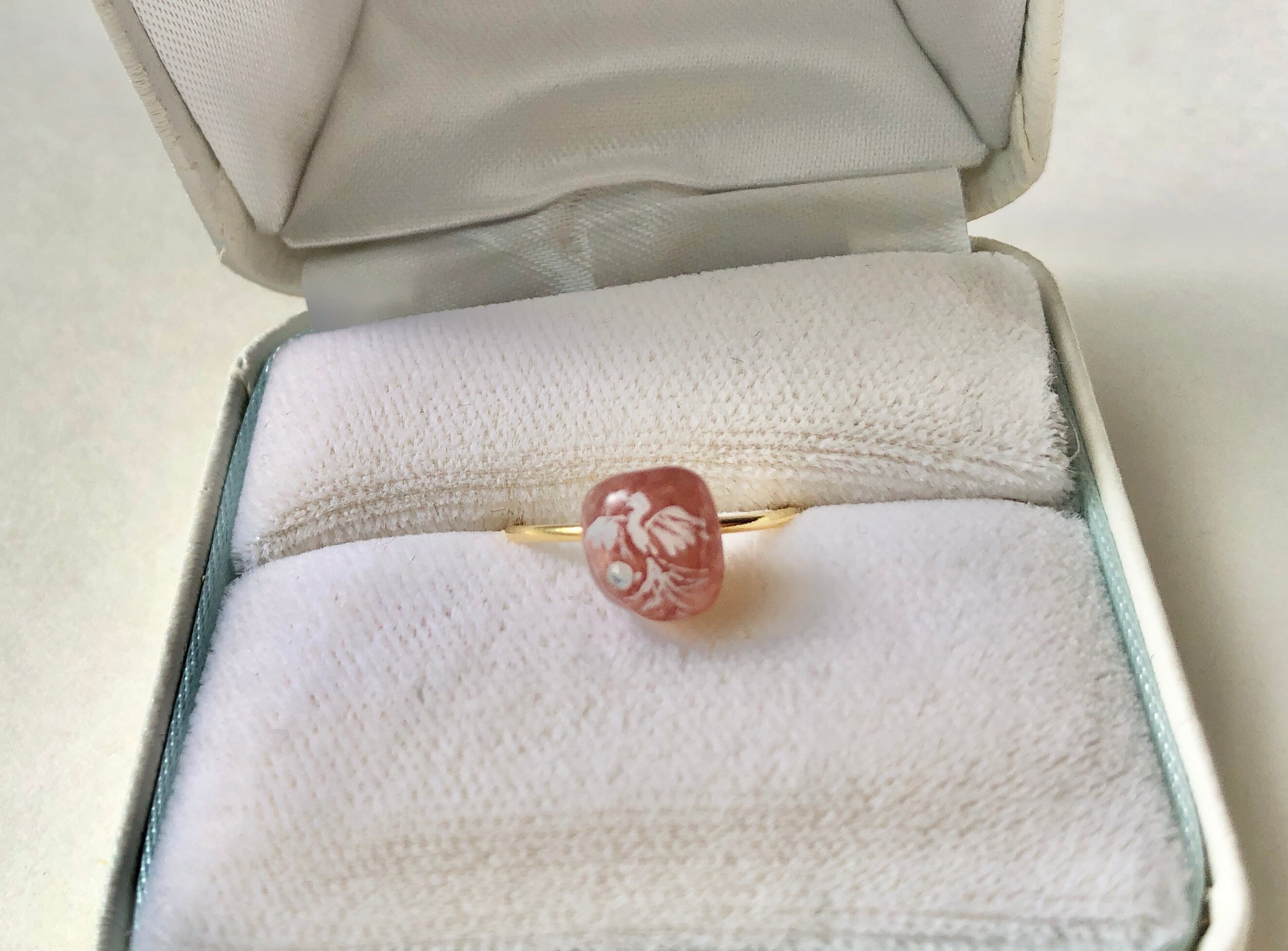 ストロベリーのような淡いピンクの石に描かれた小さな鳳凰。