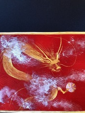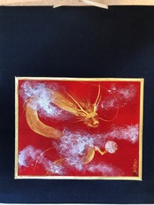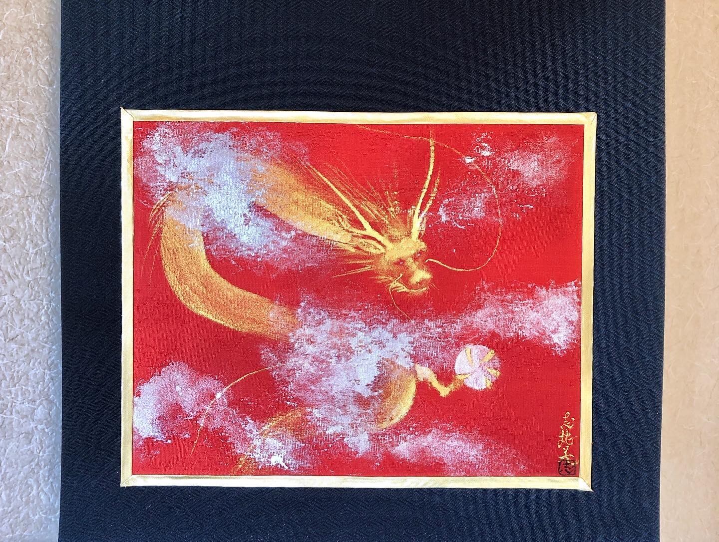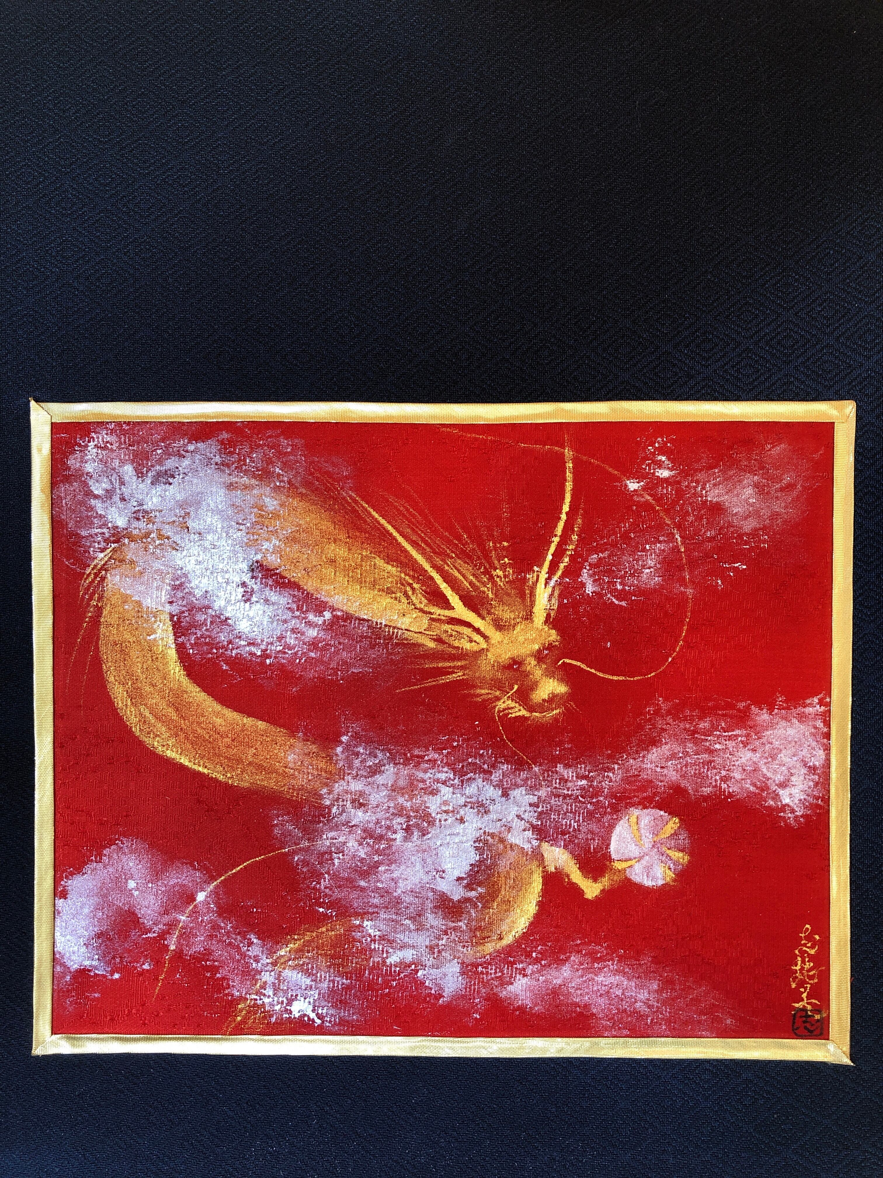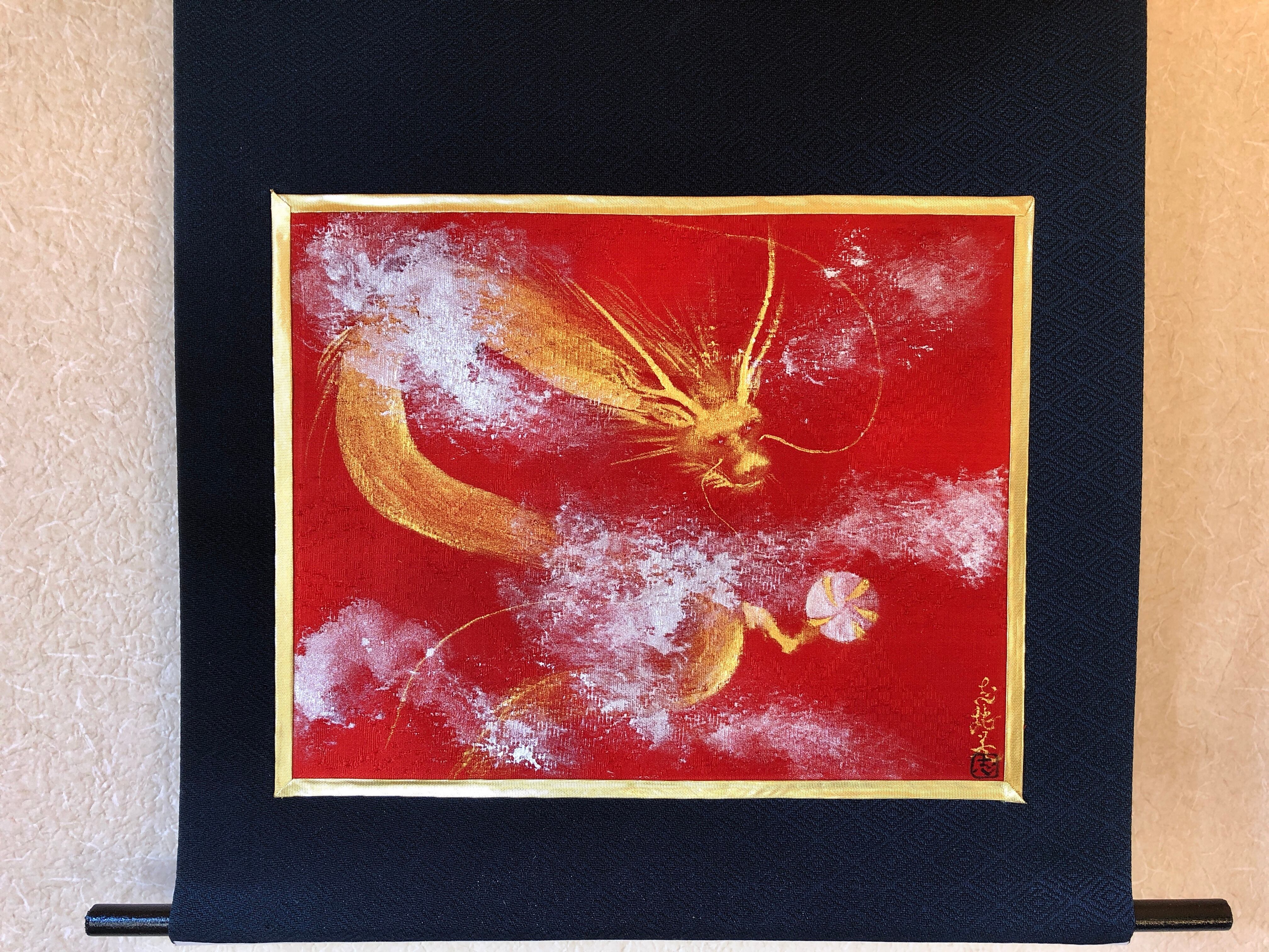 絹の着物帯を背景に、美しい赤の正絹に金墨で描いた金龍。