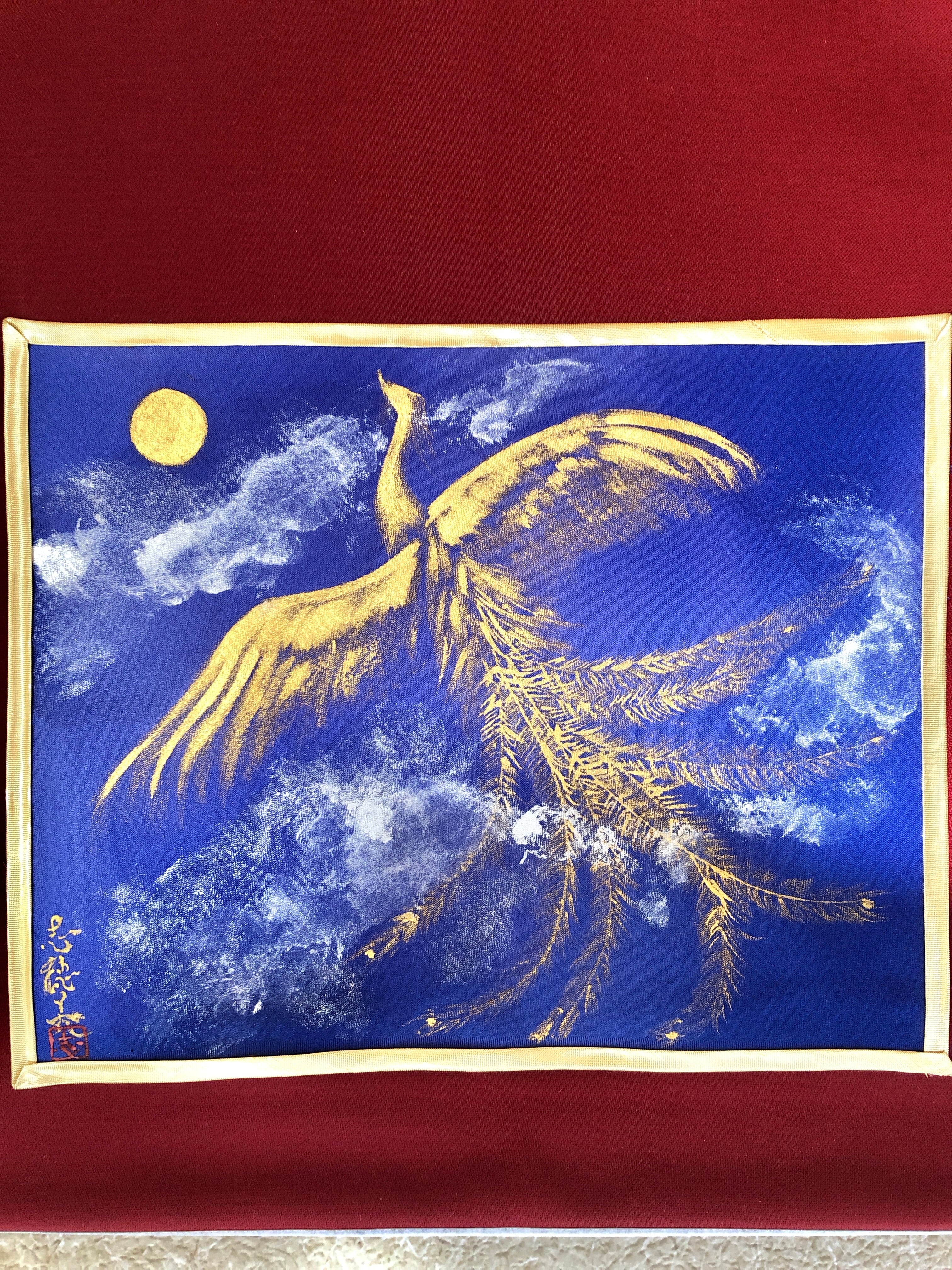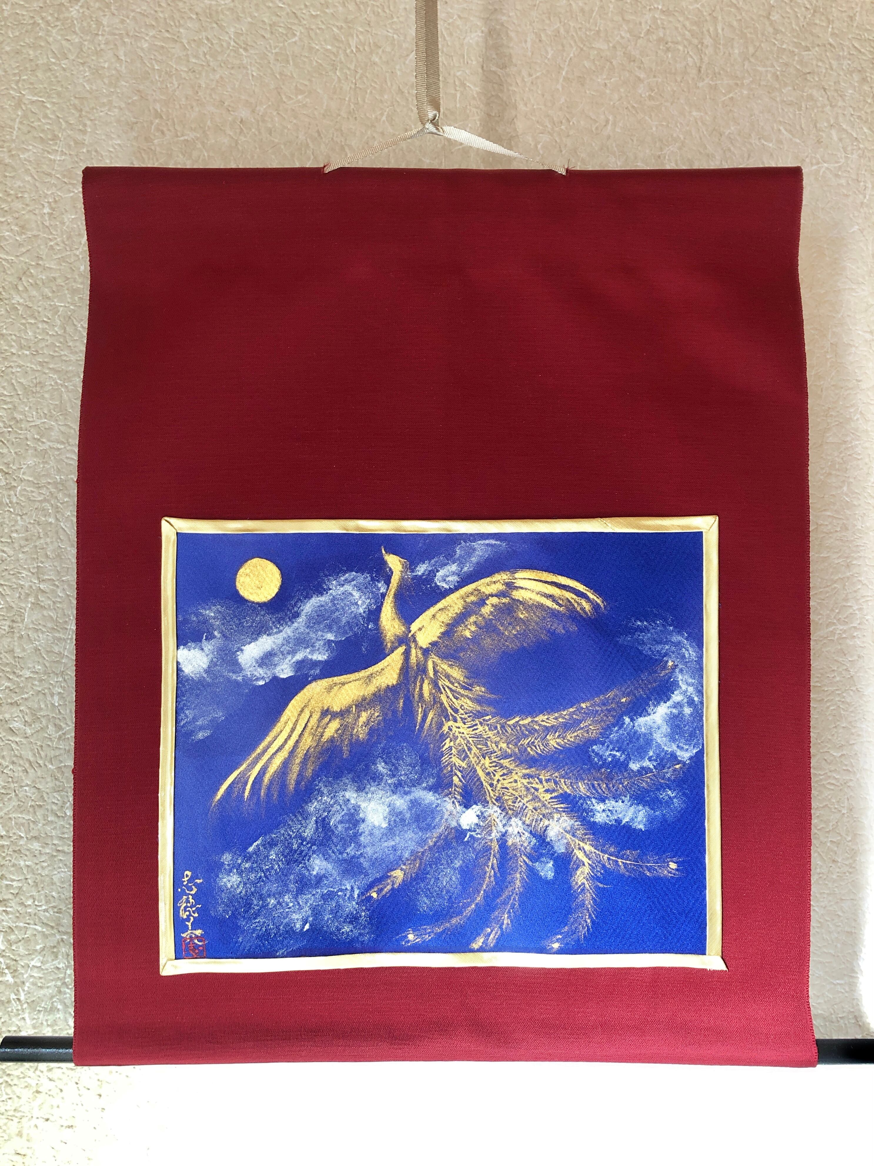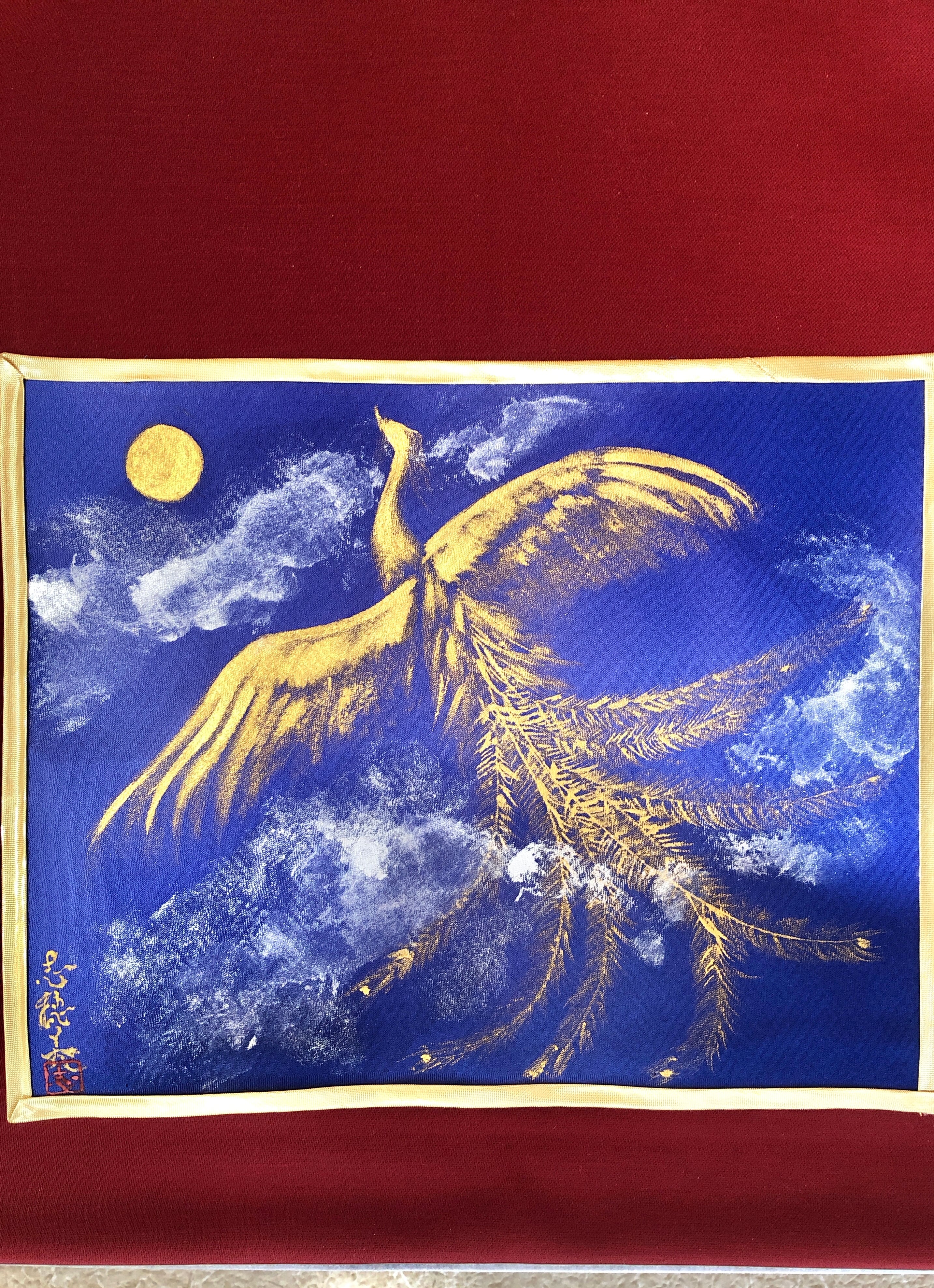 絹の着物帯を背景に、美しい青の正絹に金墨で描いた金の鳳凰。