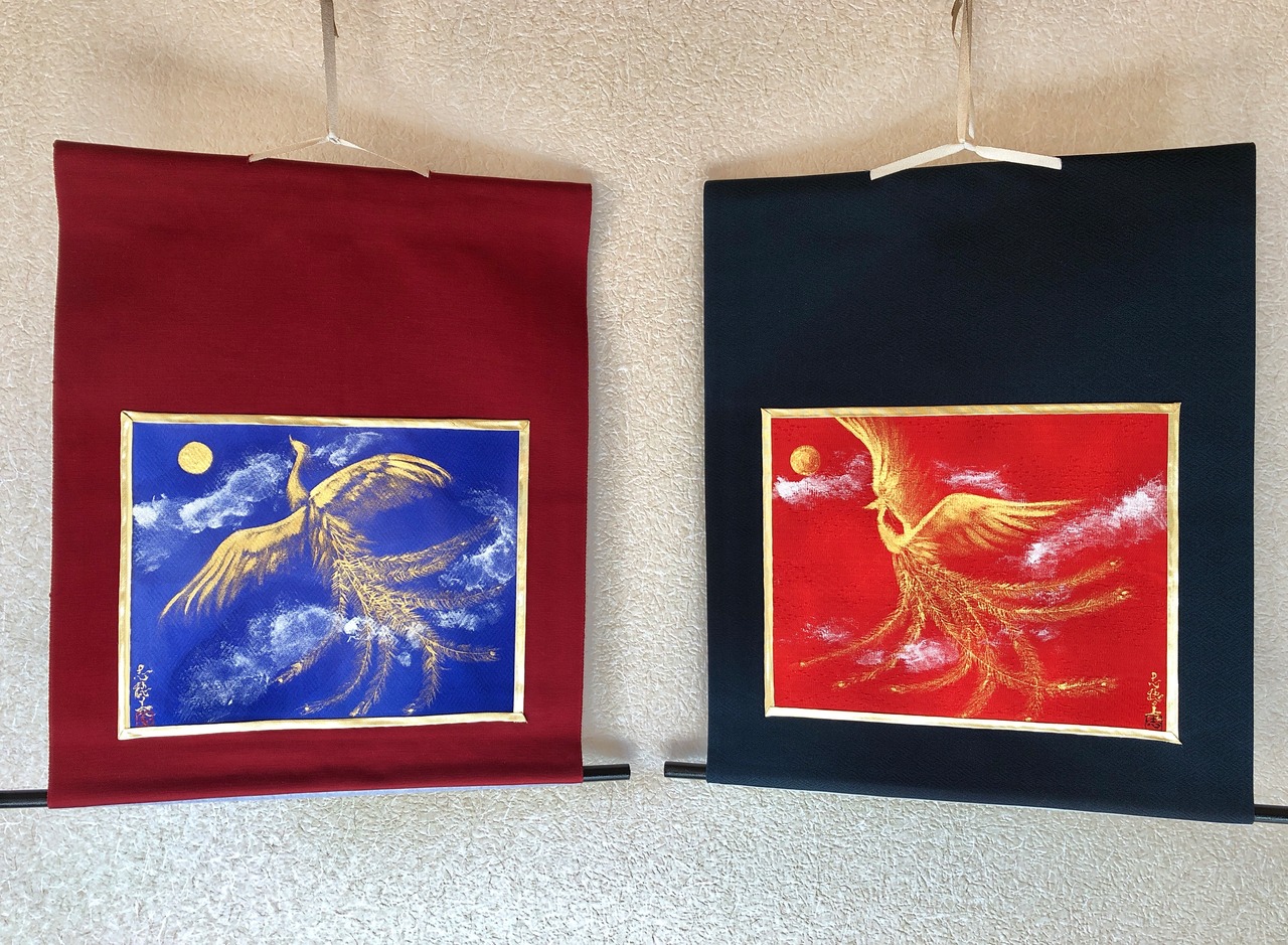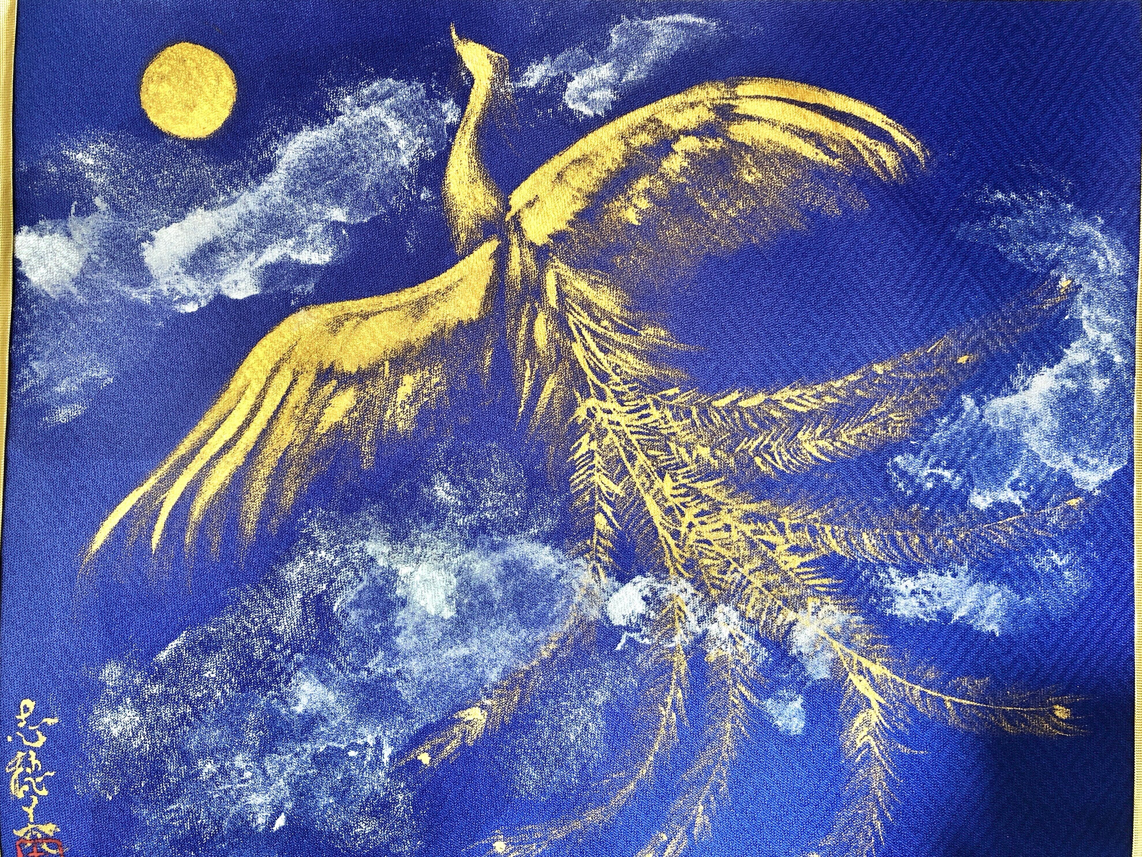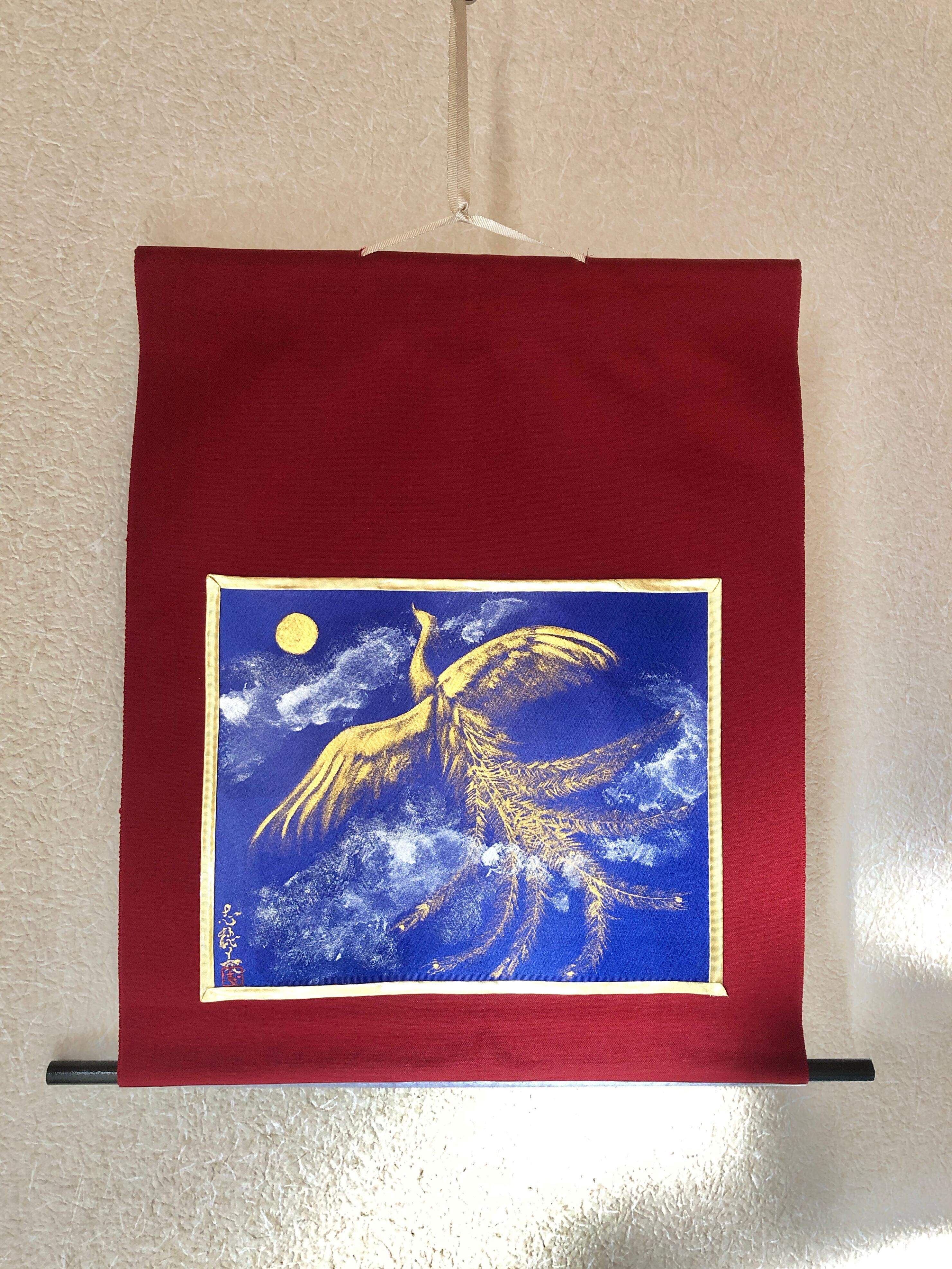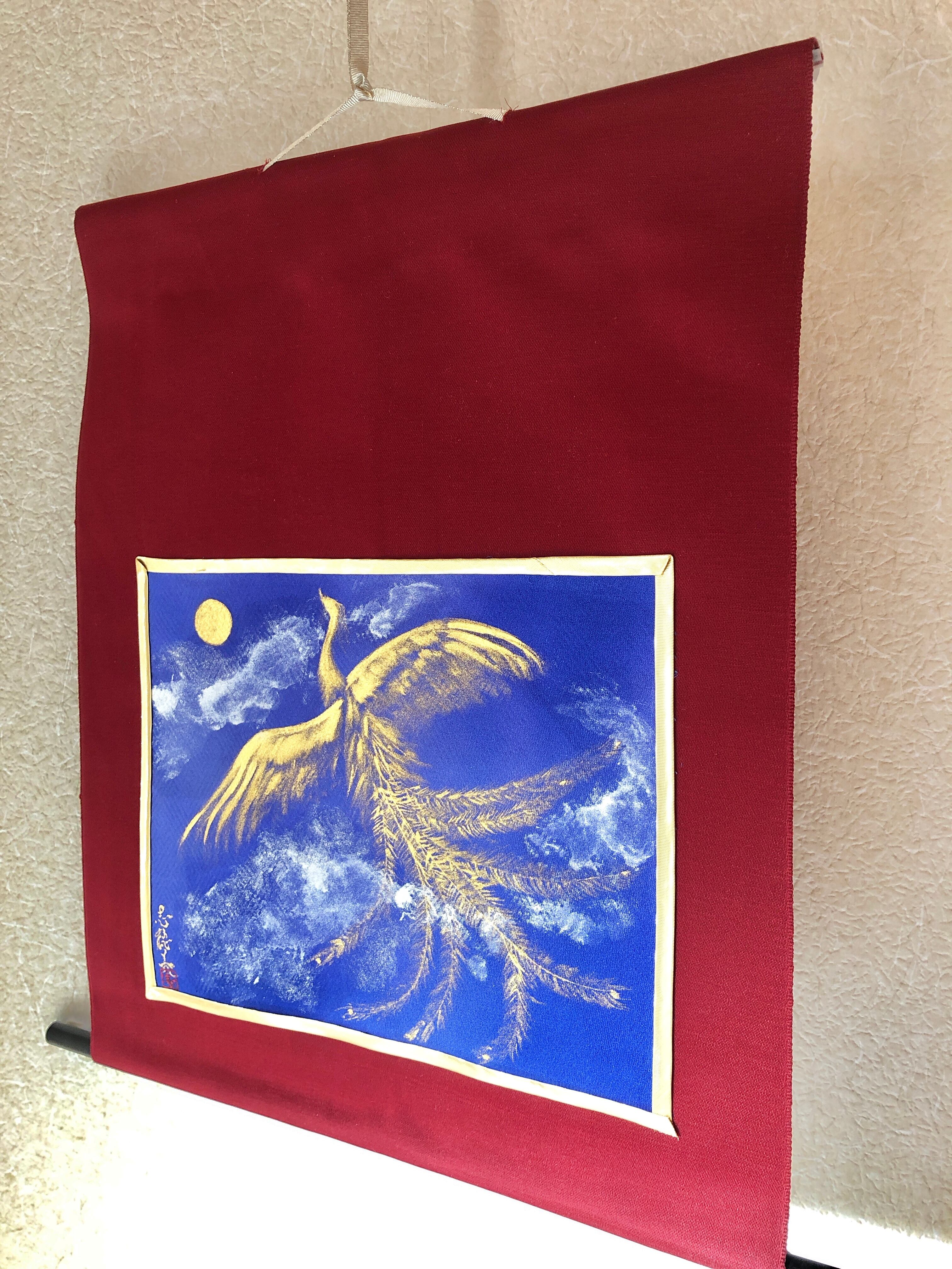 絹の着物帯を背景に、美しい青の正絹に金墨で描いた金の鳳凰。