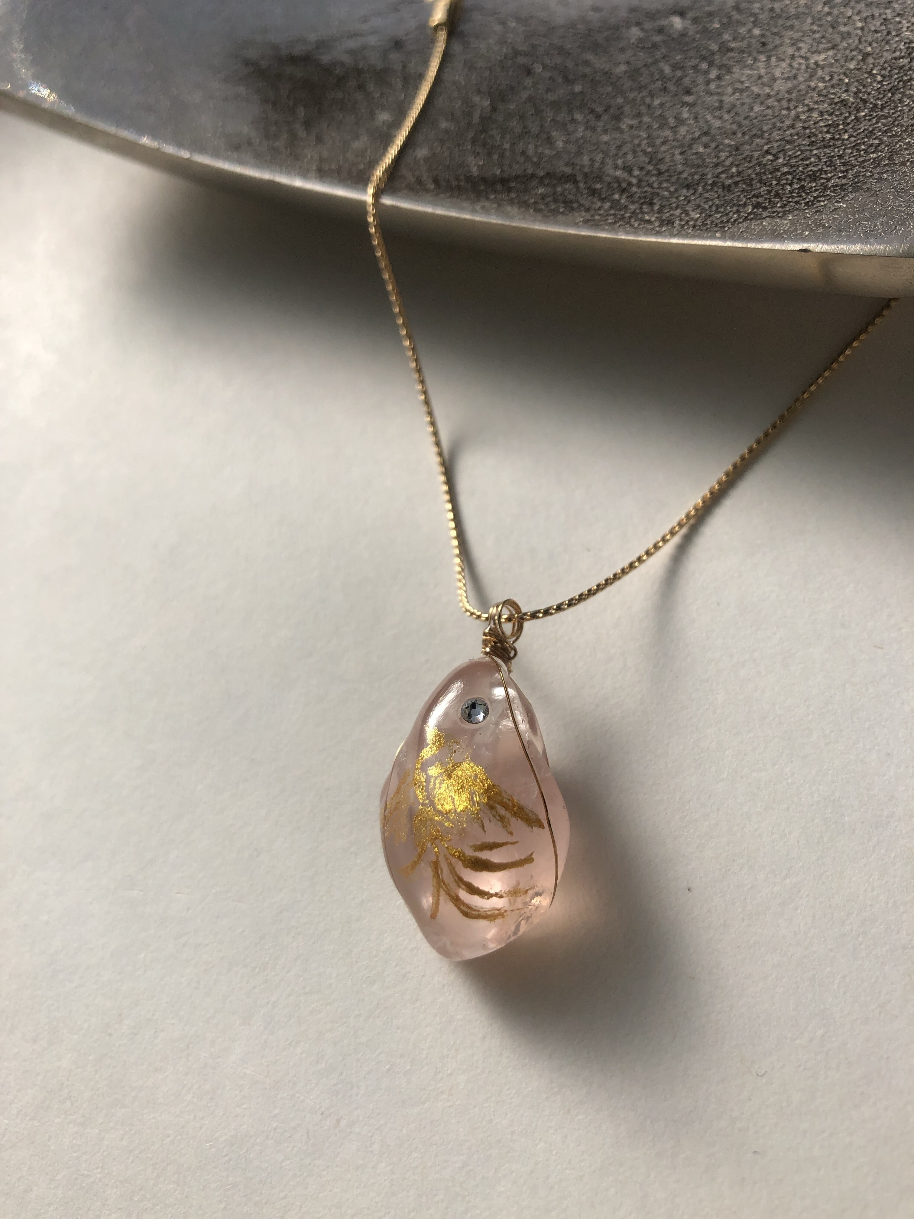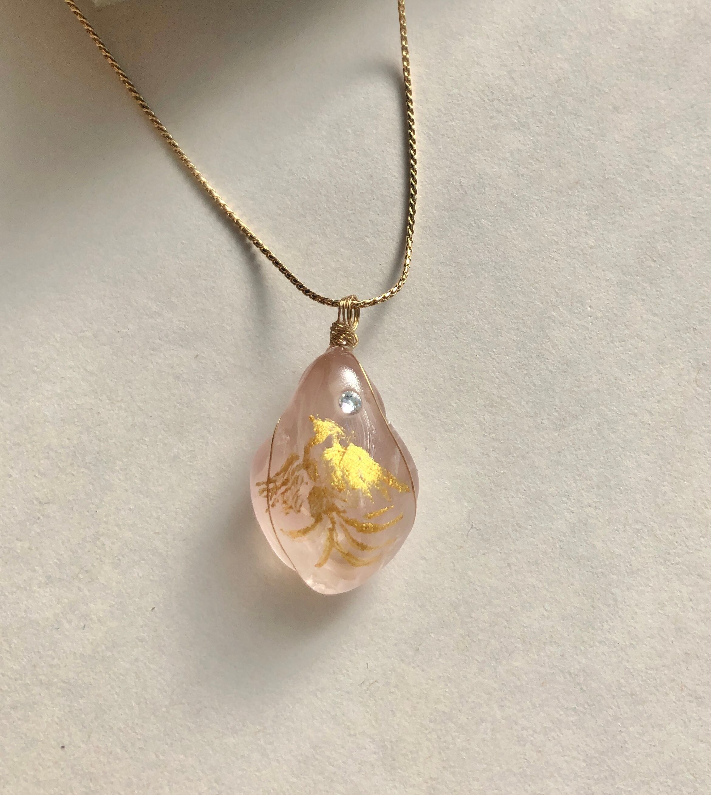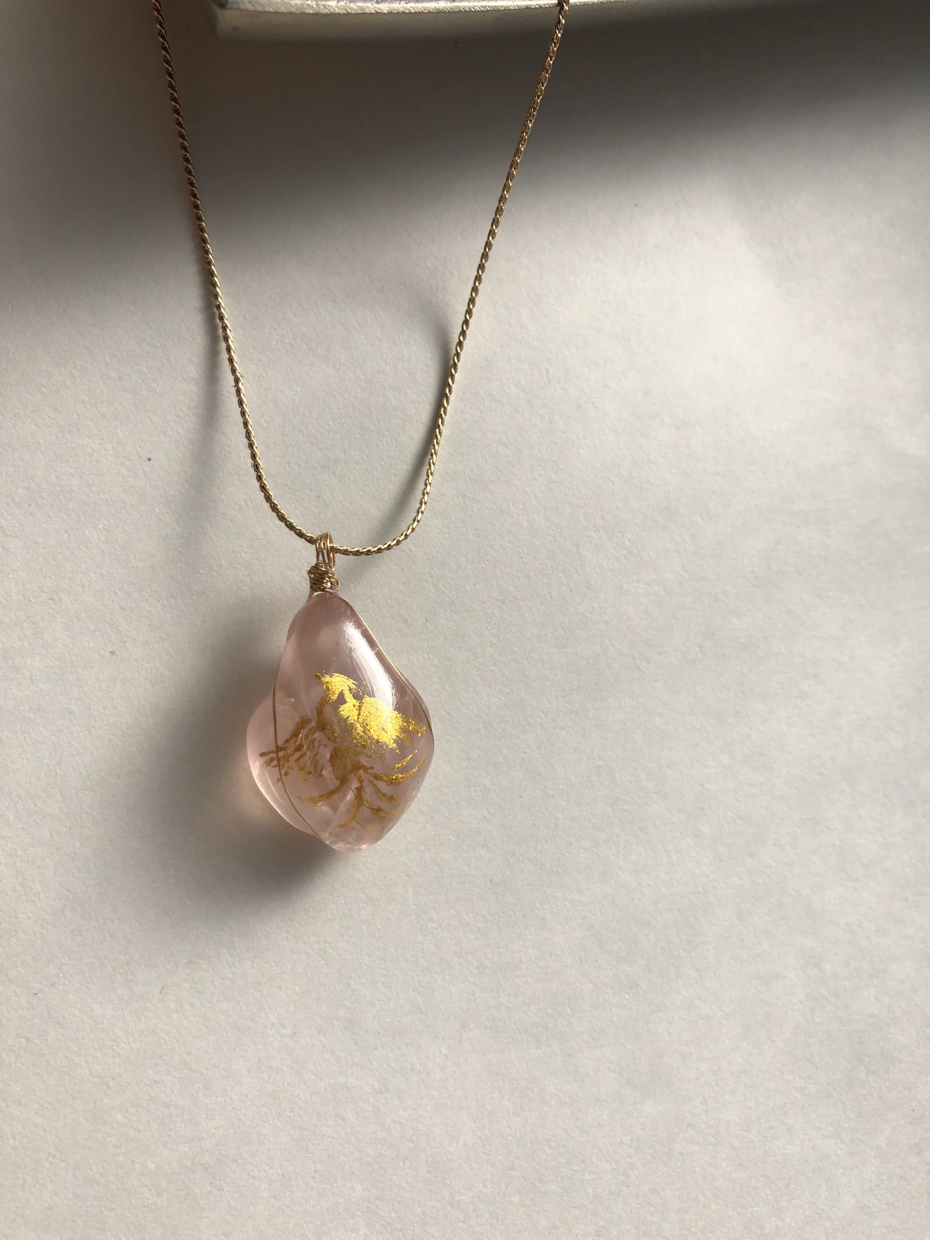 天然石 ローズクォーツ 金の鳳凰ネックレス。