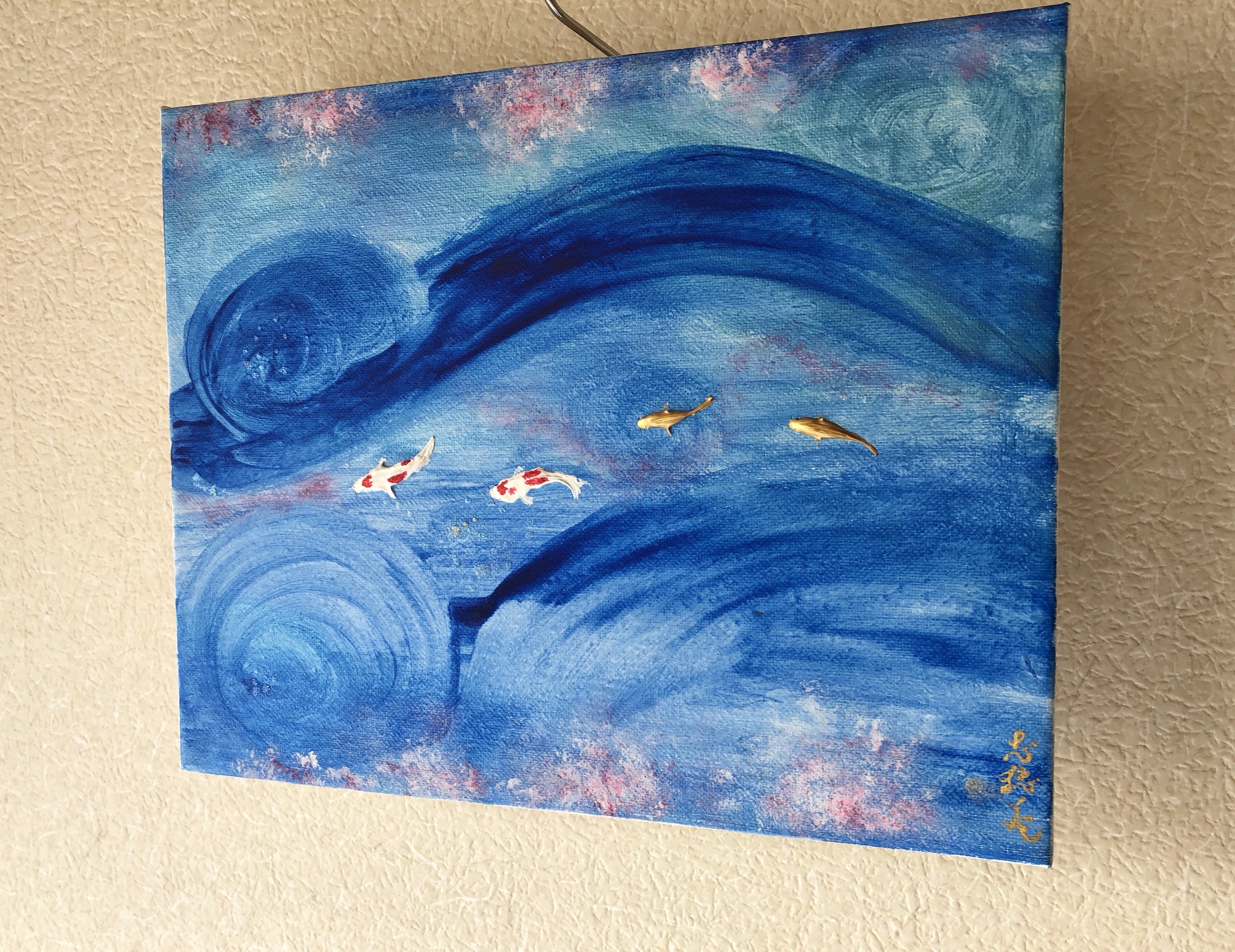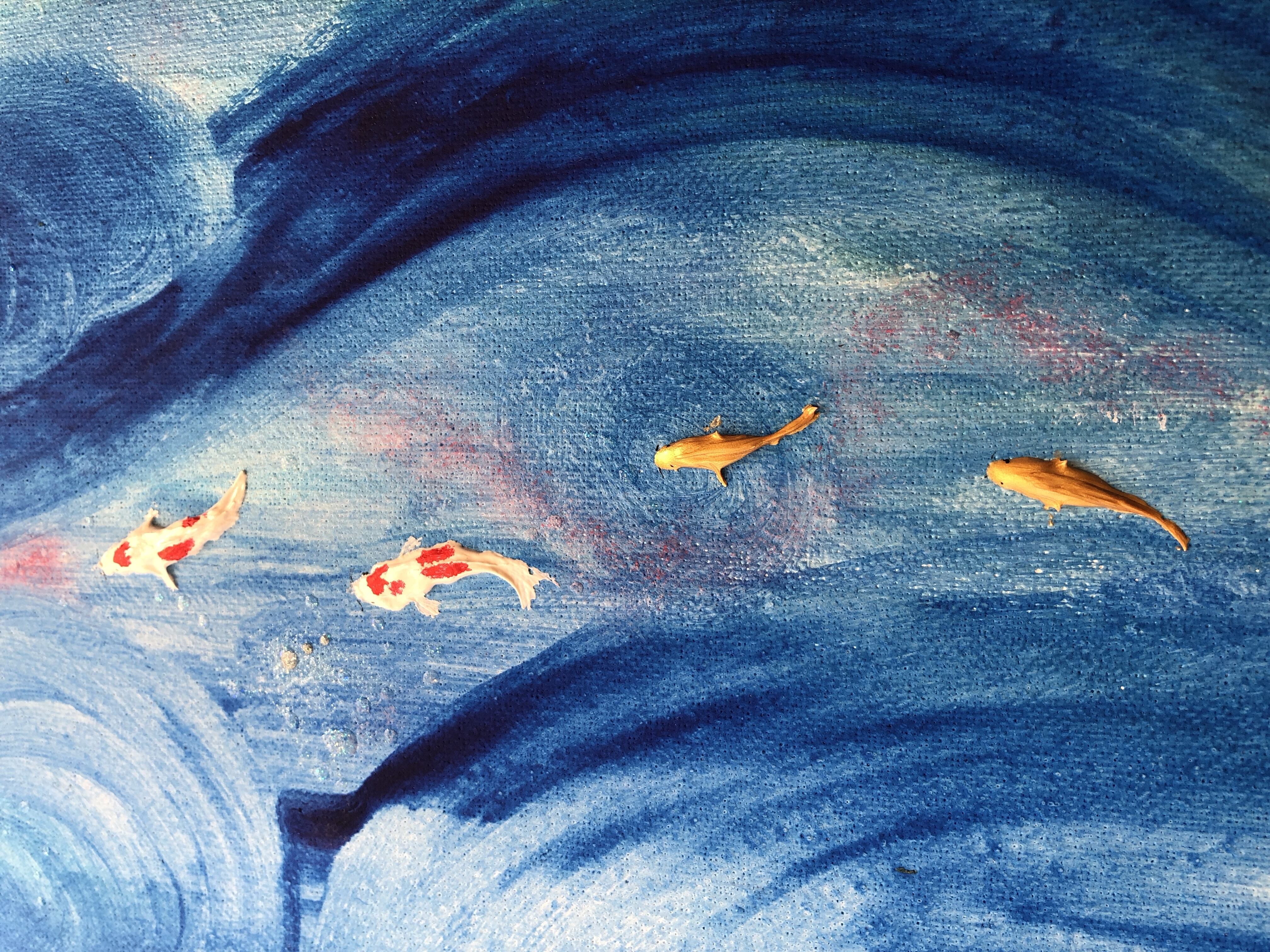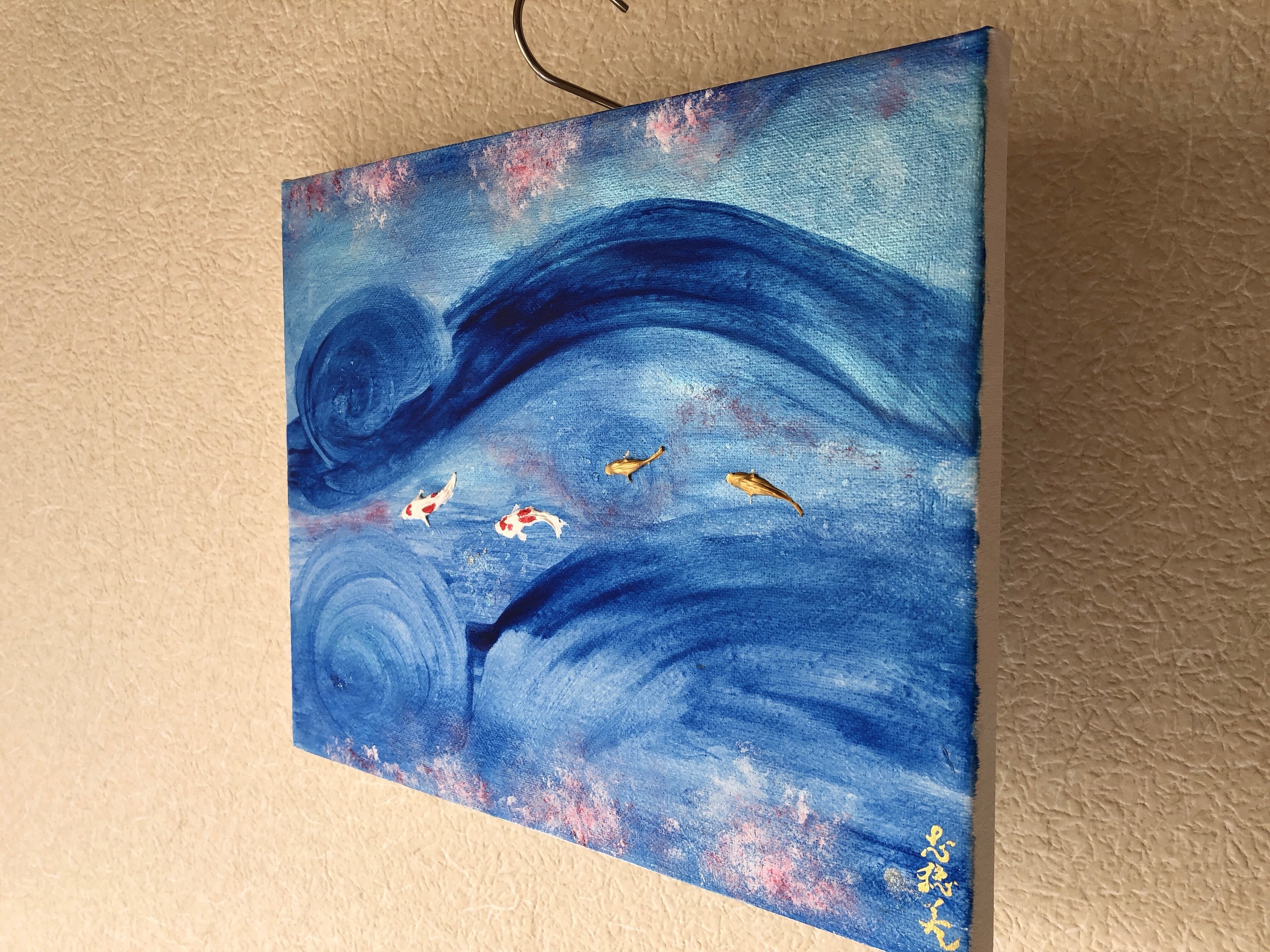 青く渦巻く流れの中を泳ぐ半立体の錦鯉。