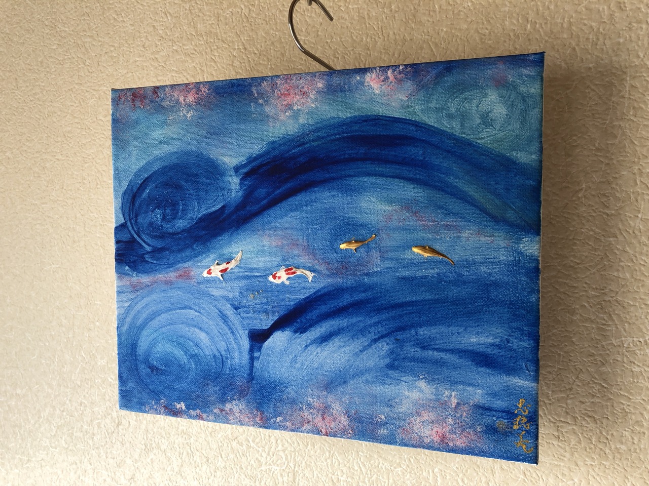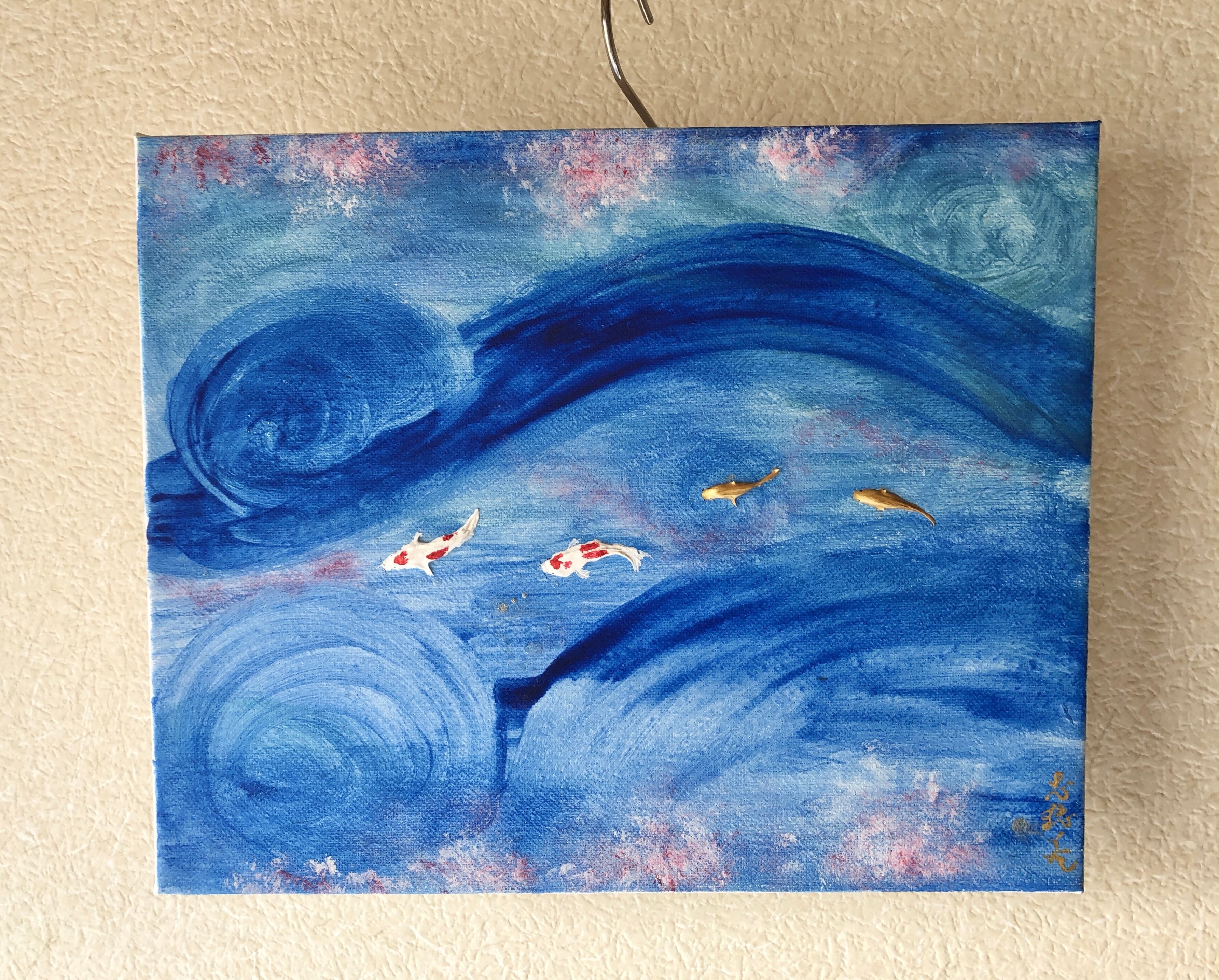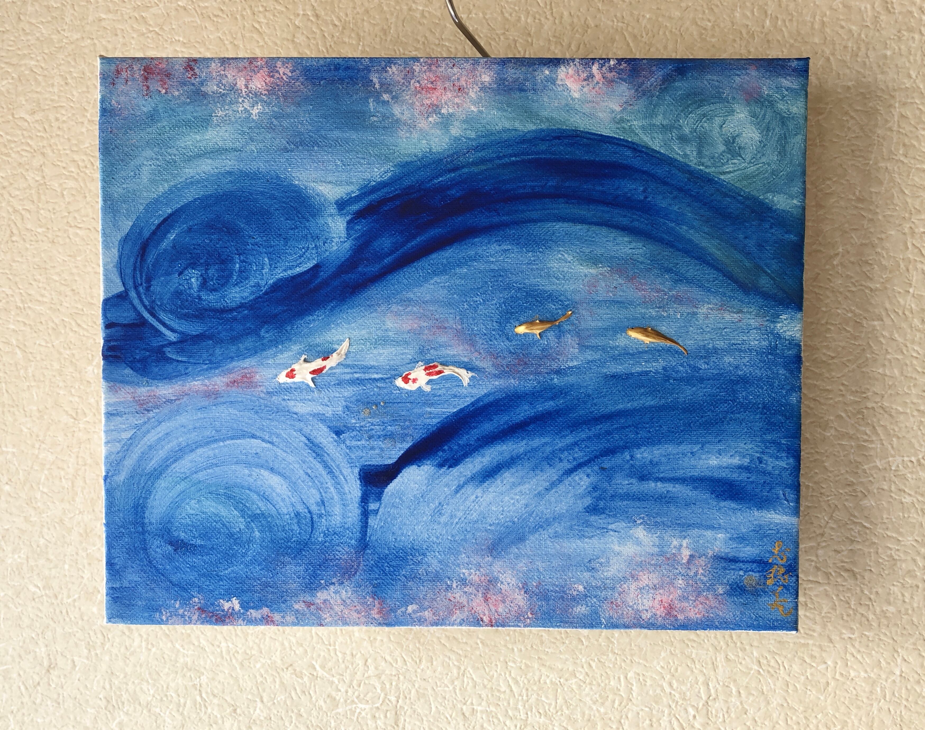 青く渦巻く流れの中を泳ぐ半立体の錦鯉。