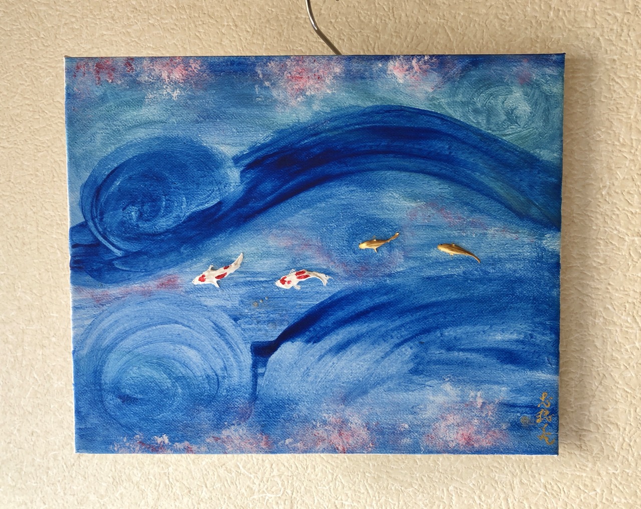 鯉の周りや渦巻く水の中には水の泡を表現しました。