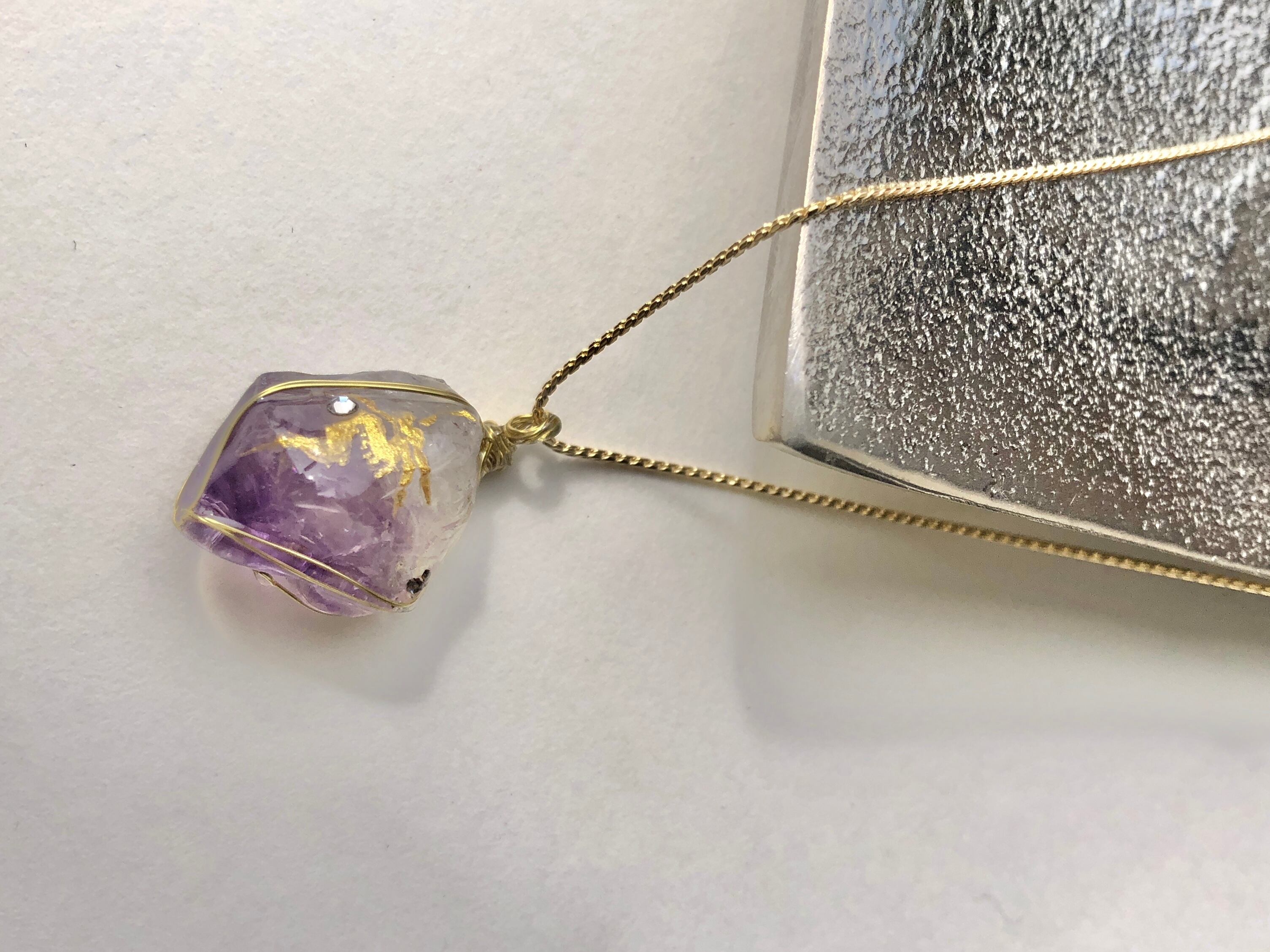存在感のあるアメジストの、原石の自然の形が美しいネックレスです。