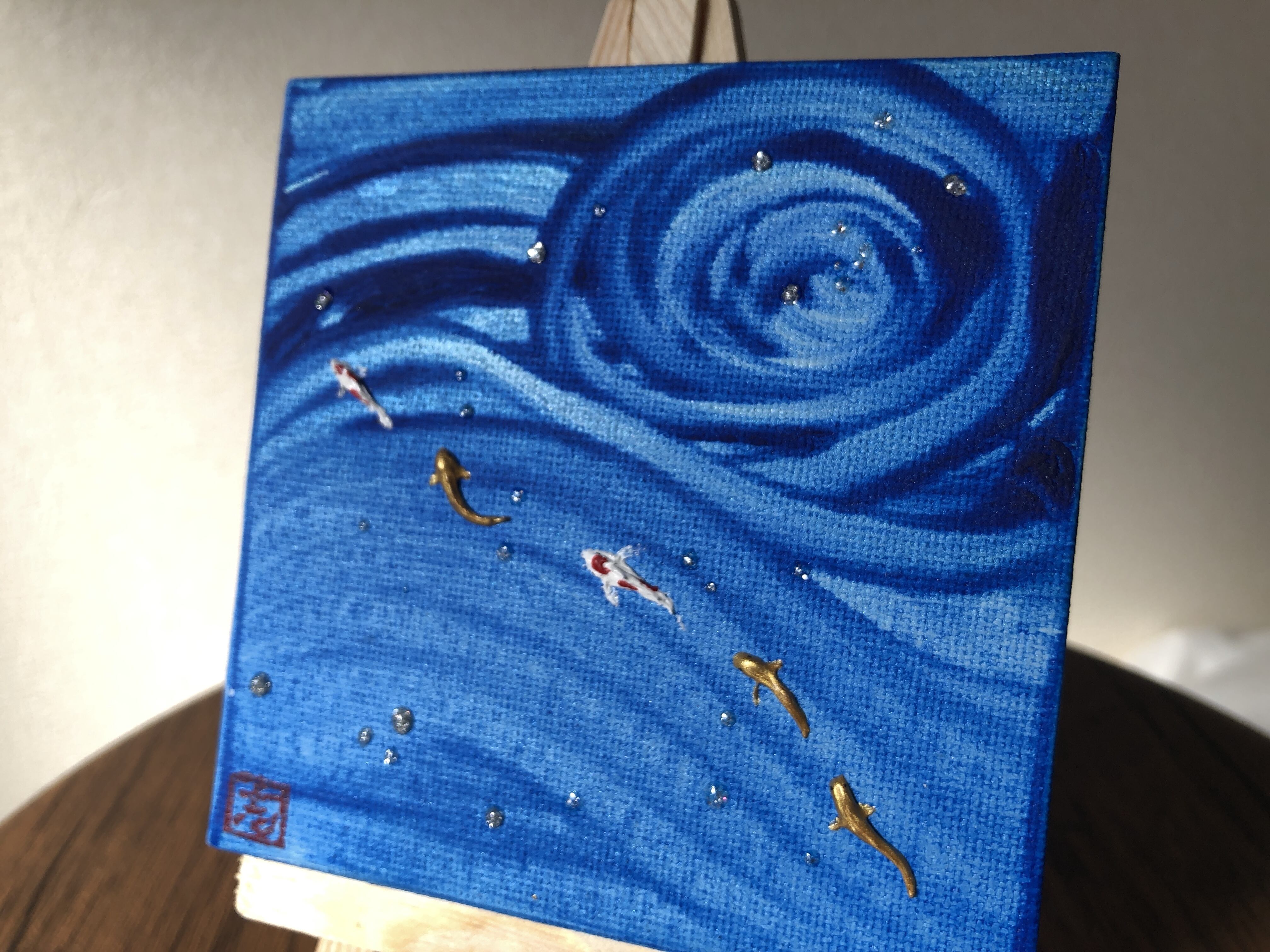 幻想的な水色を背景に、半立体に浮かび上がる5匹の錦鯉