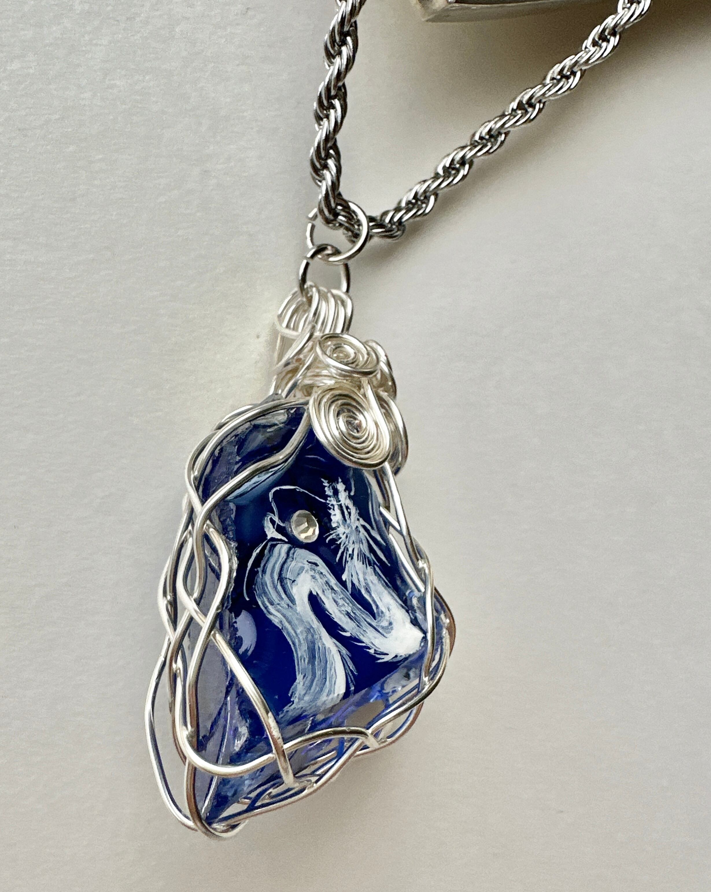 繊細な石であるオブシディアンをワイヤーラッピングが守るように包み込み、同時に個性的なネックレスにしています。