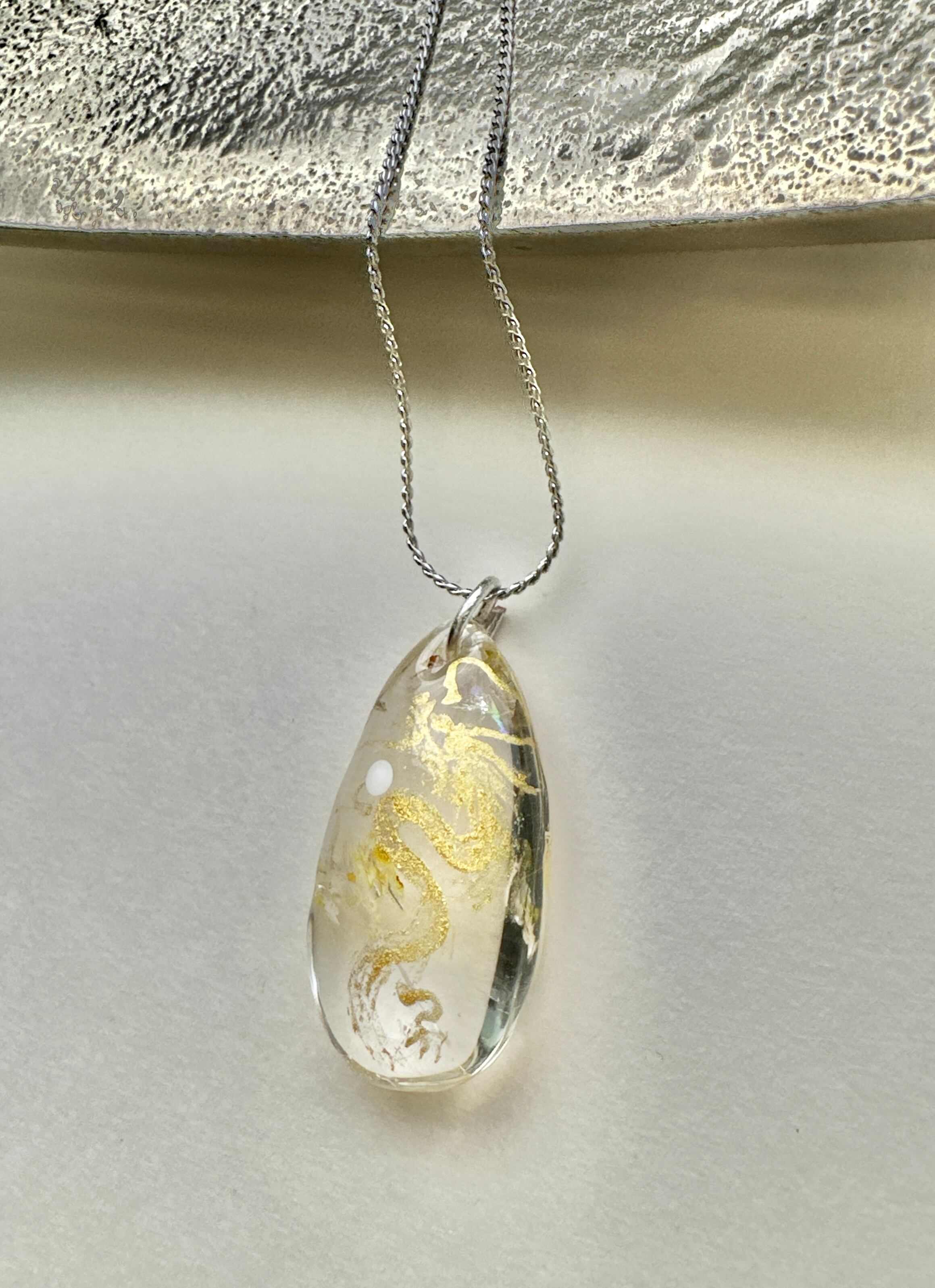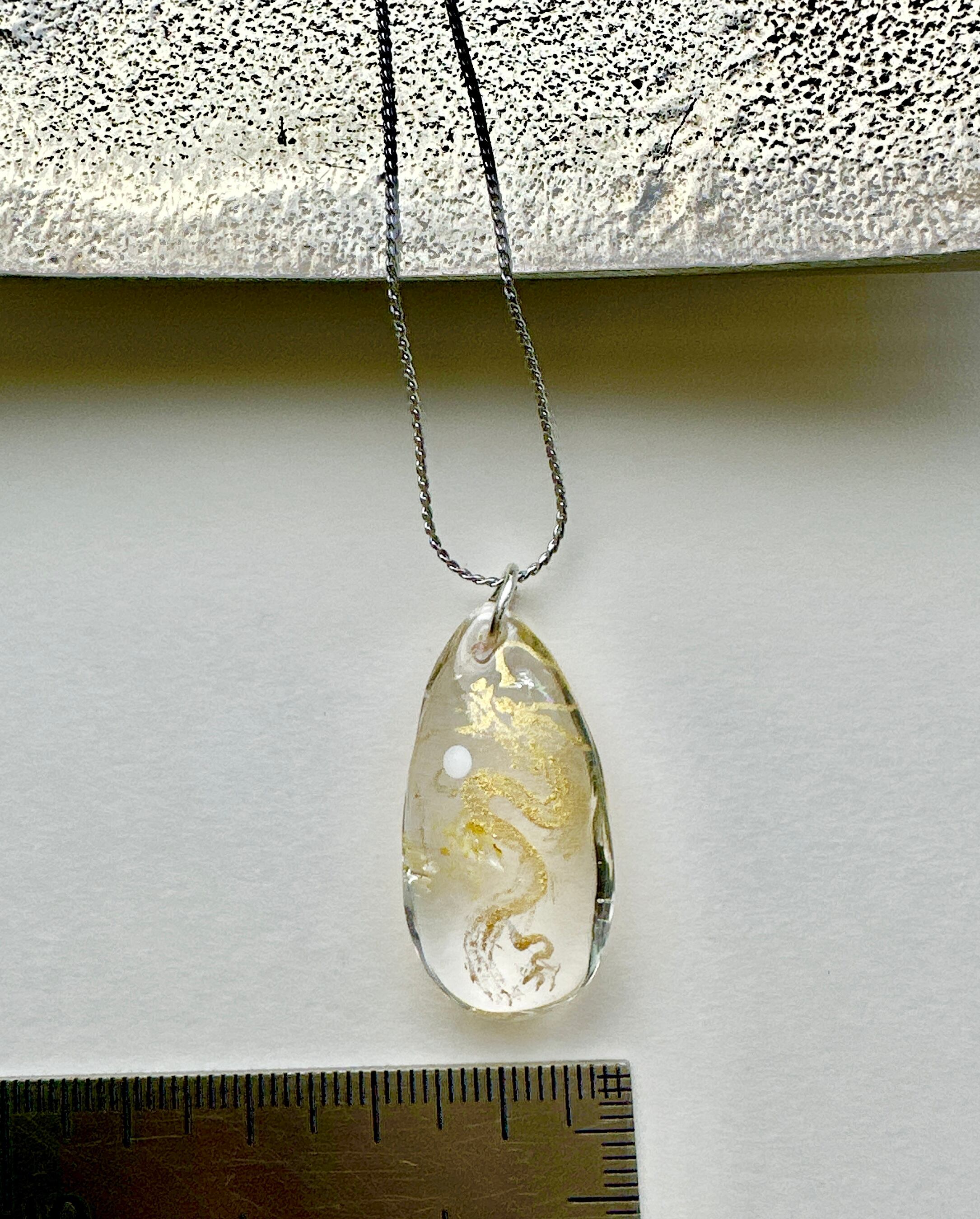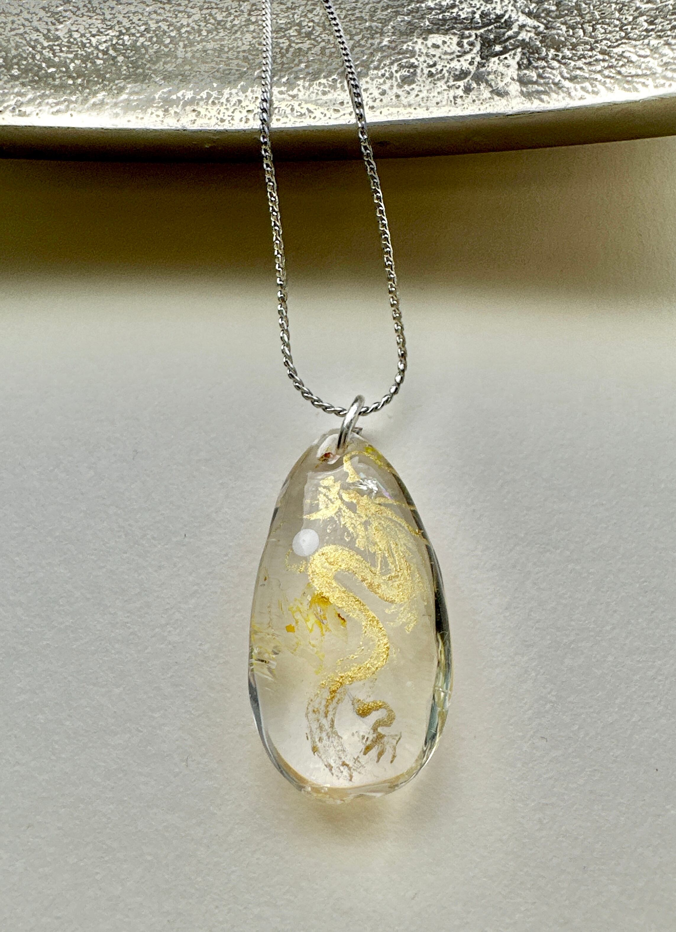 レインボーに輝く美しいサシが入った雫の水晶に描かれた輝く金龍。