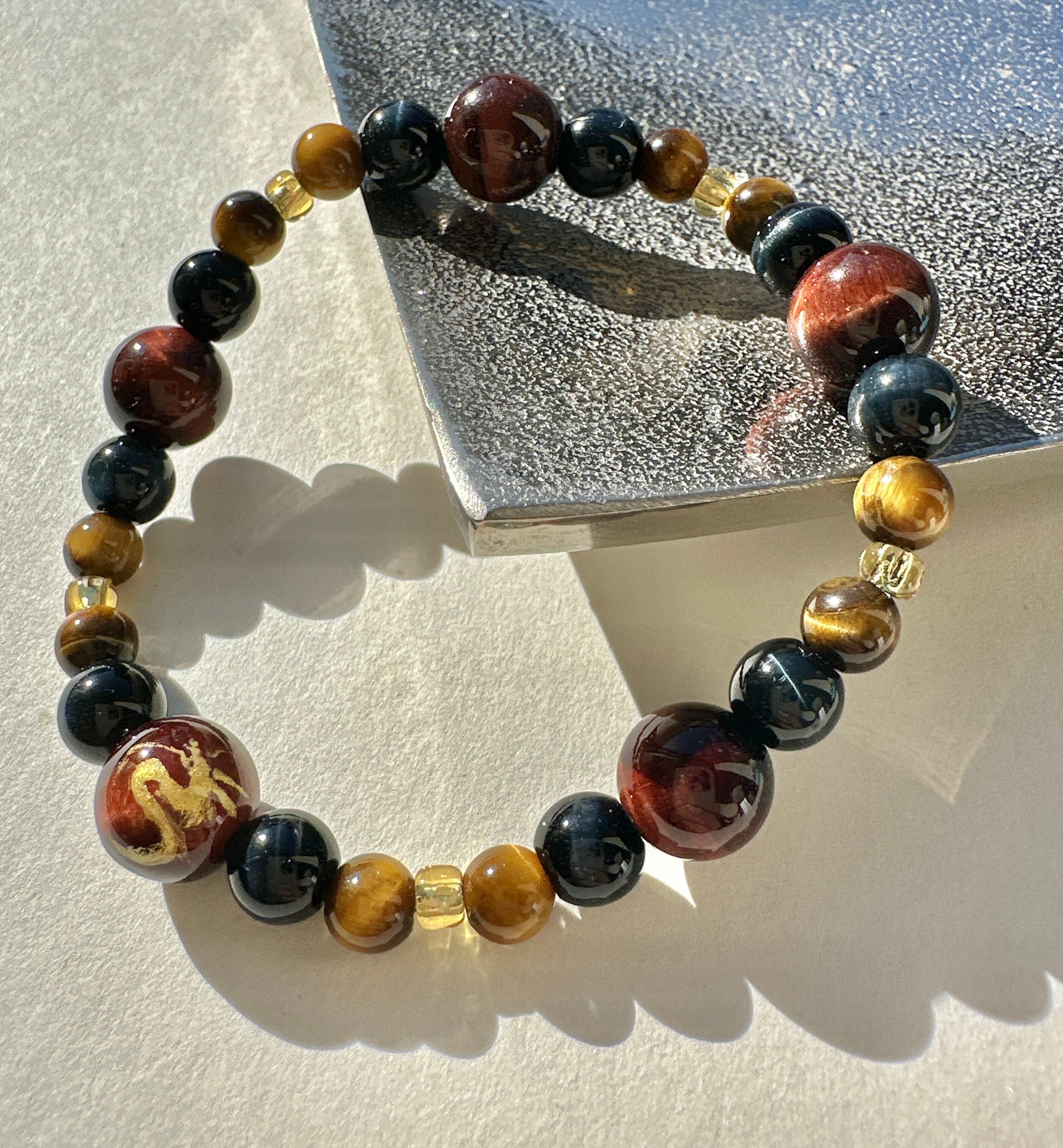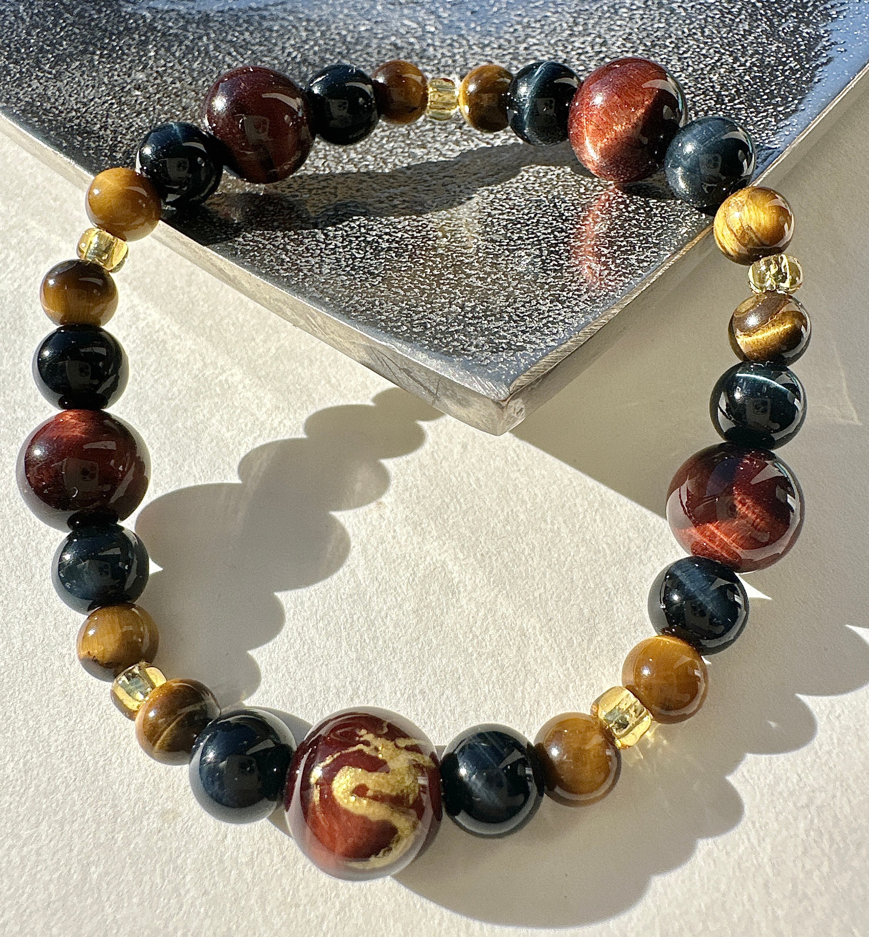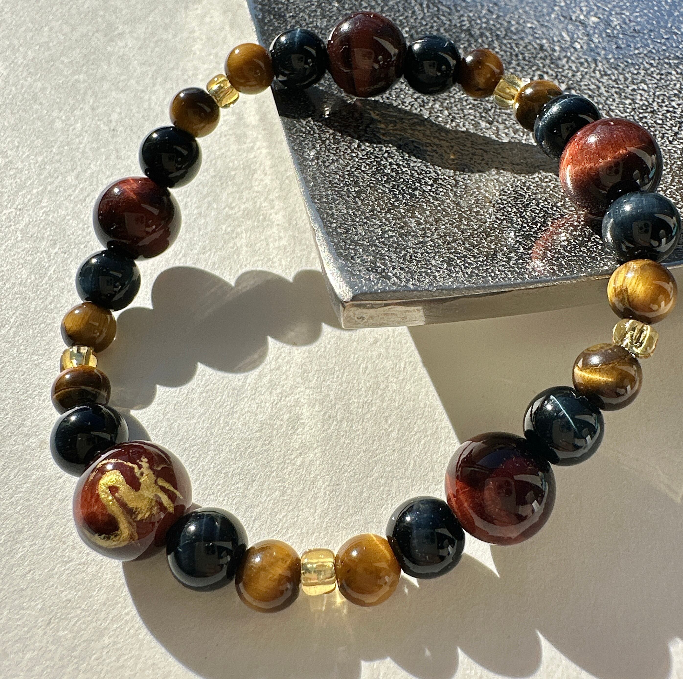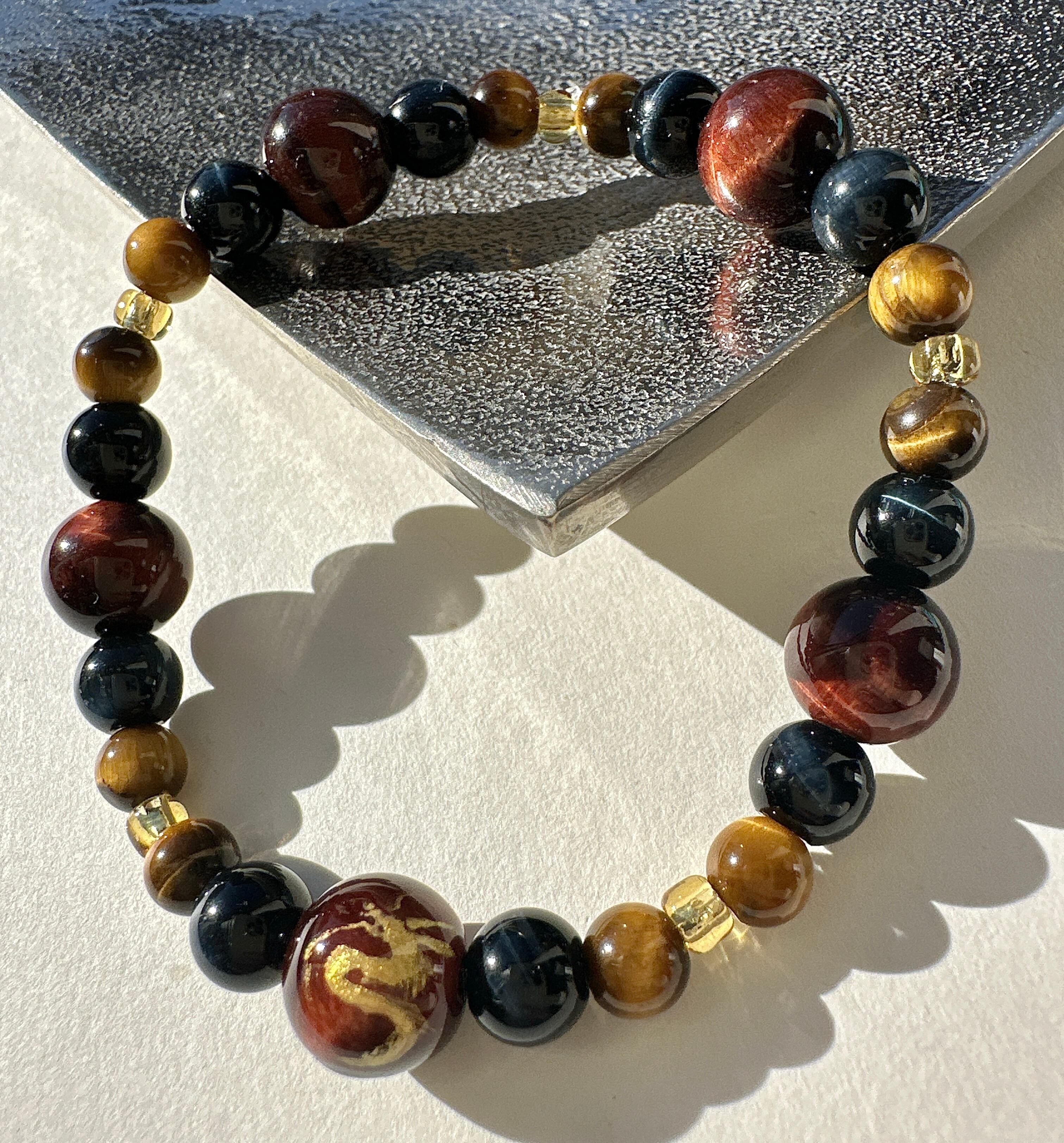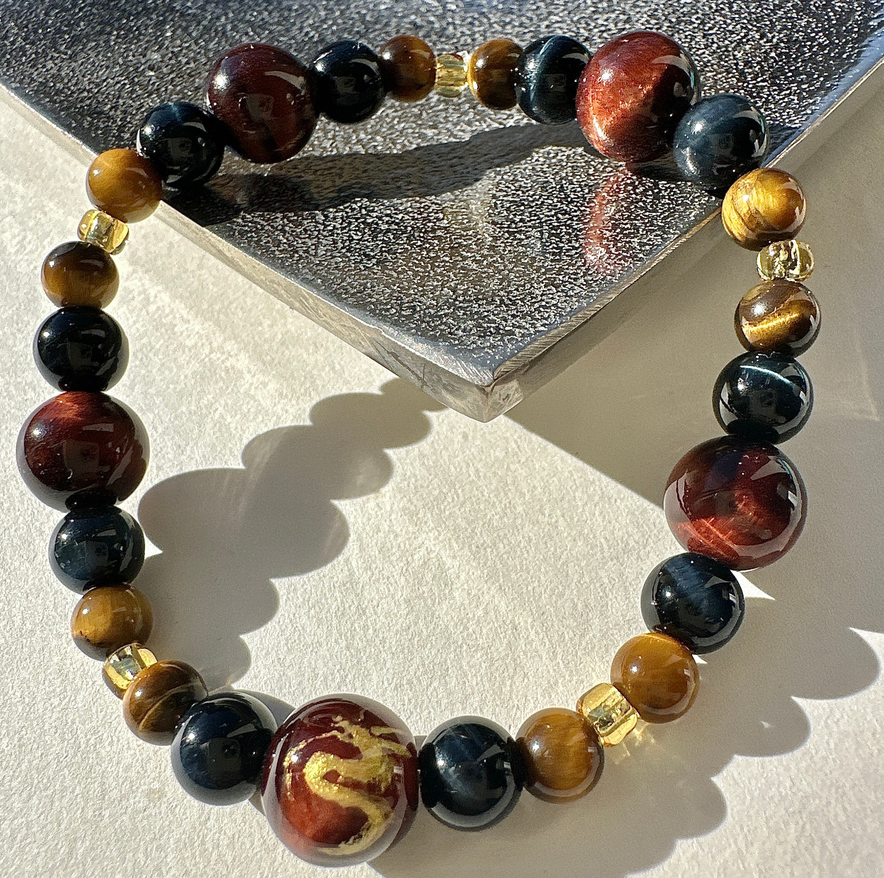 天然石 金龍 レッドタイガーアイ&タイガーアイ&黒水晶(モリオン)ブレスレット