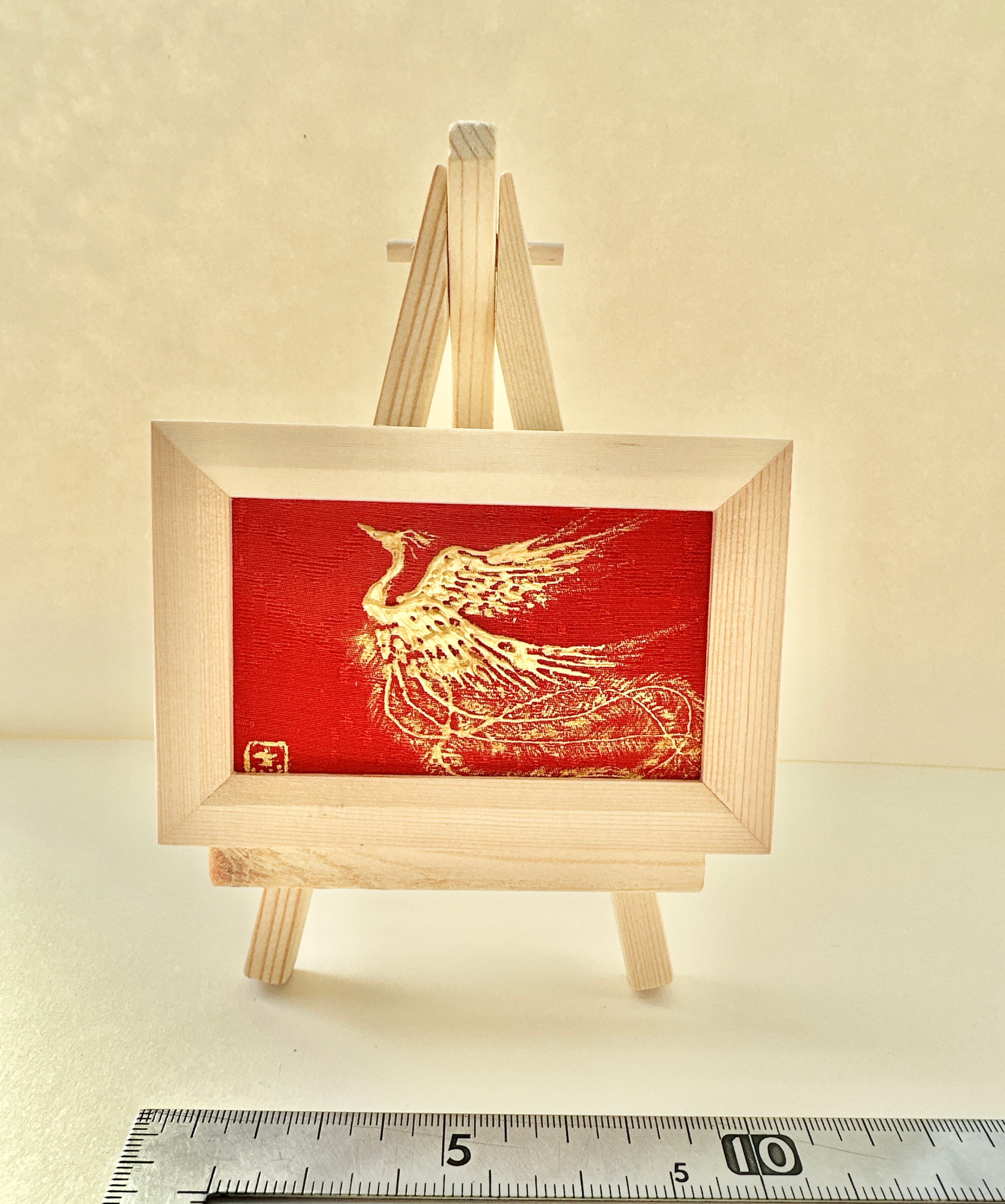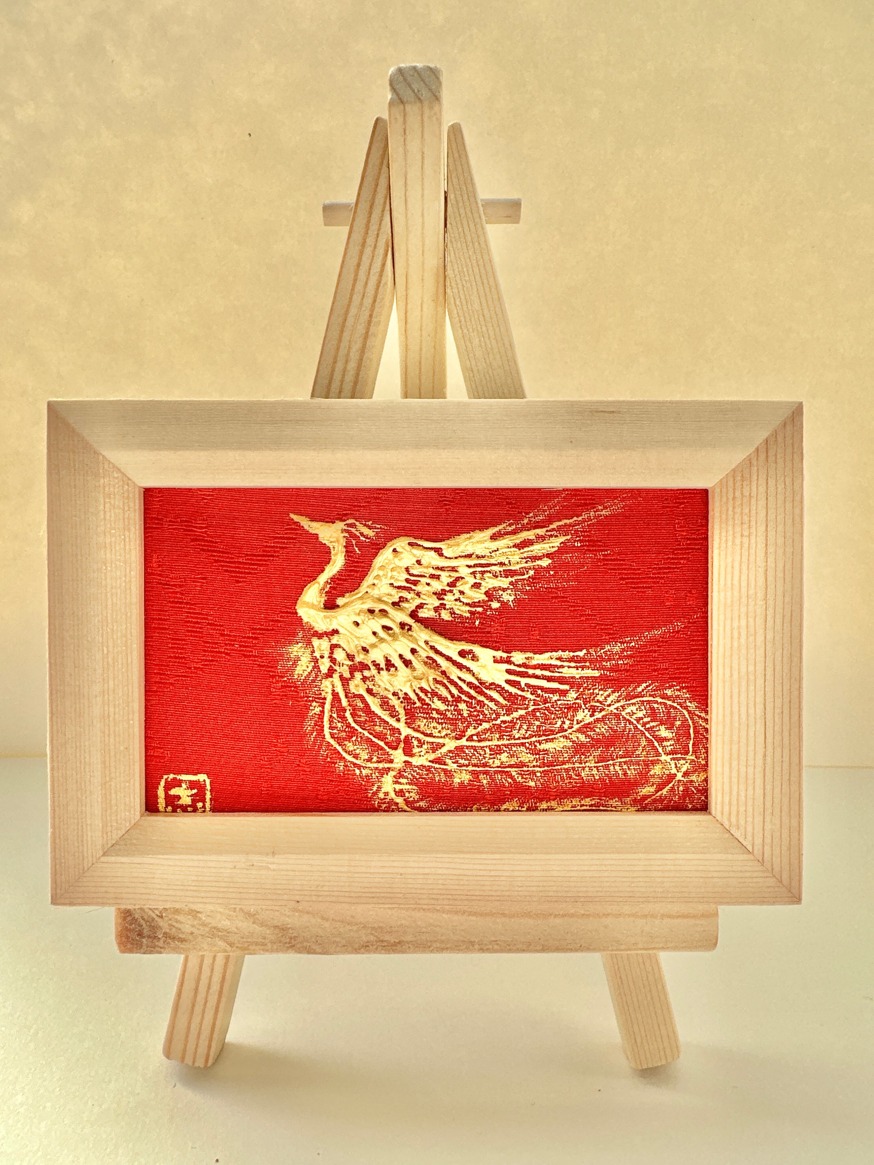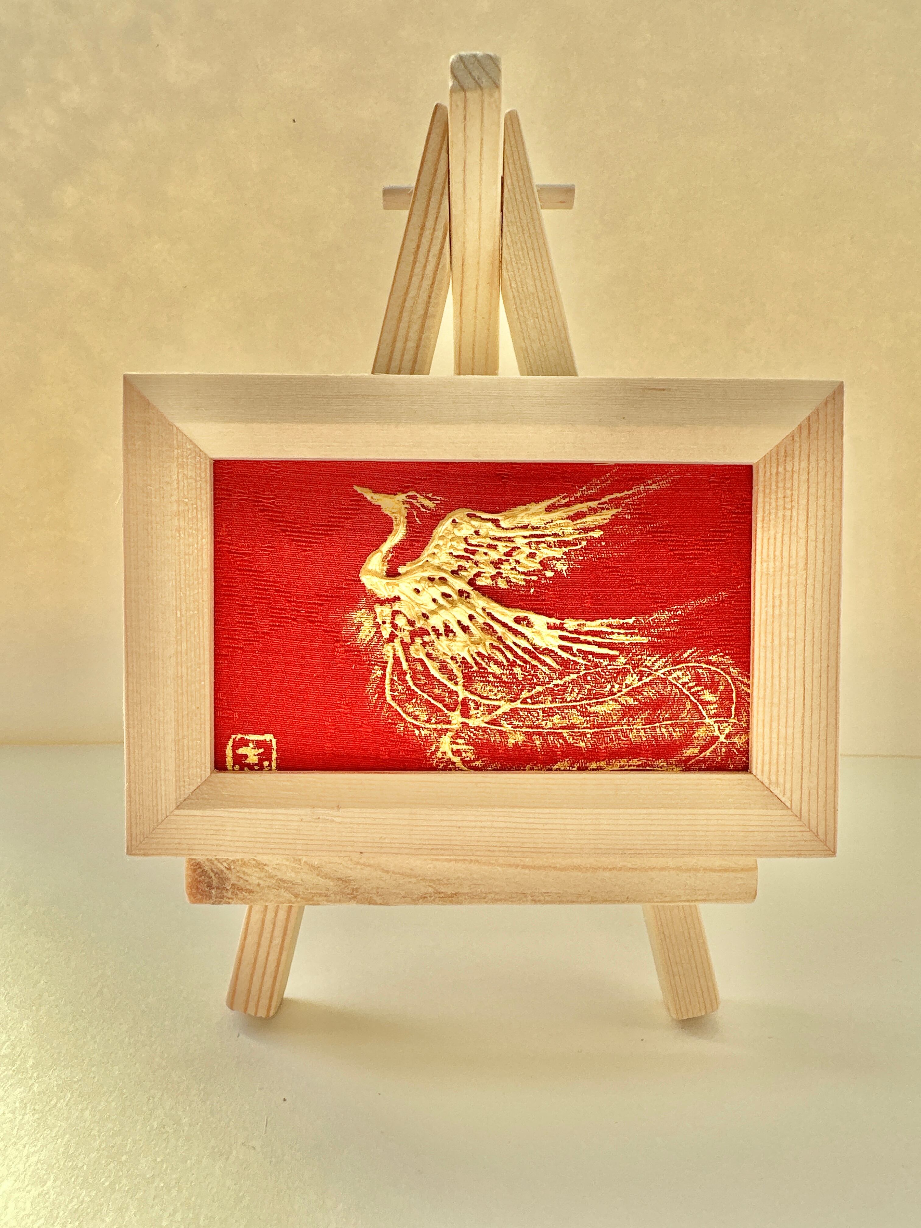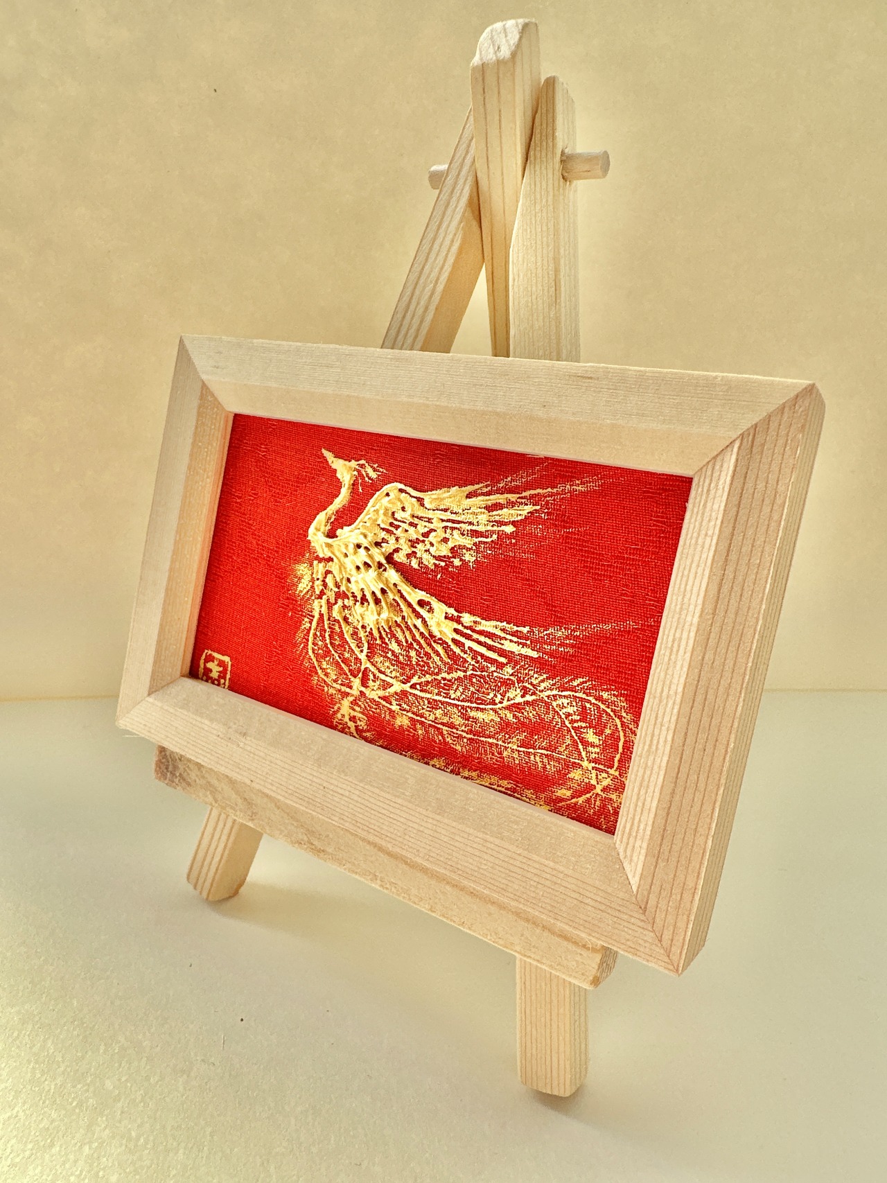ミニ絹画立体 金鳳凰(赤色) イーゼル付き