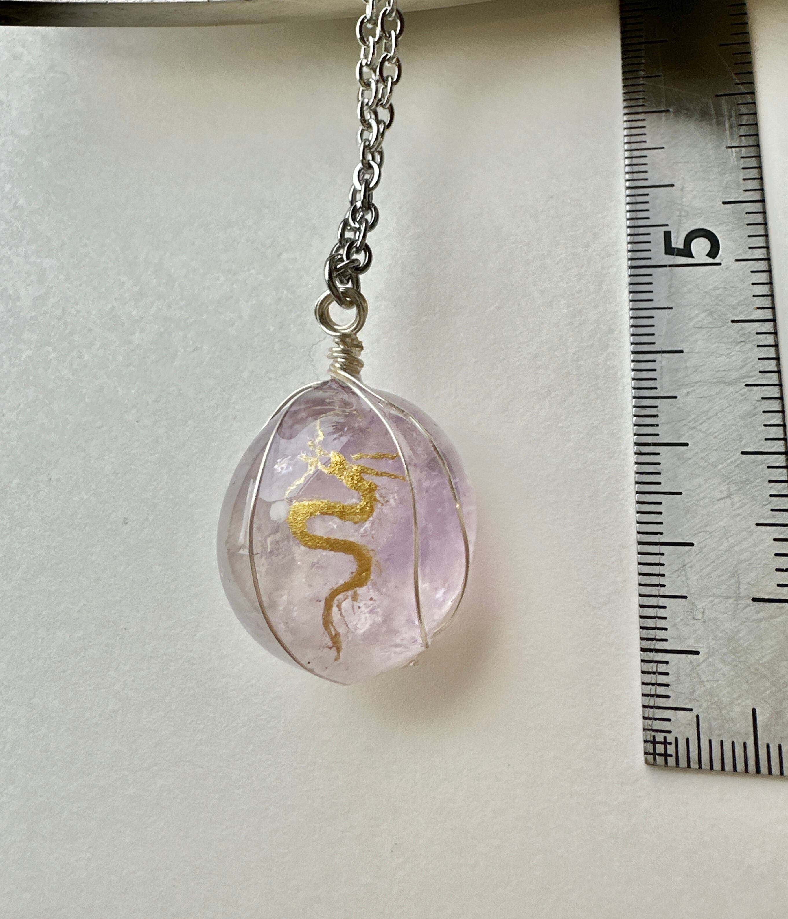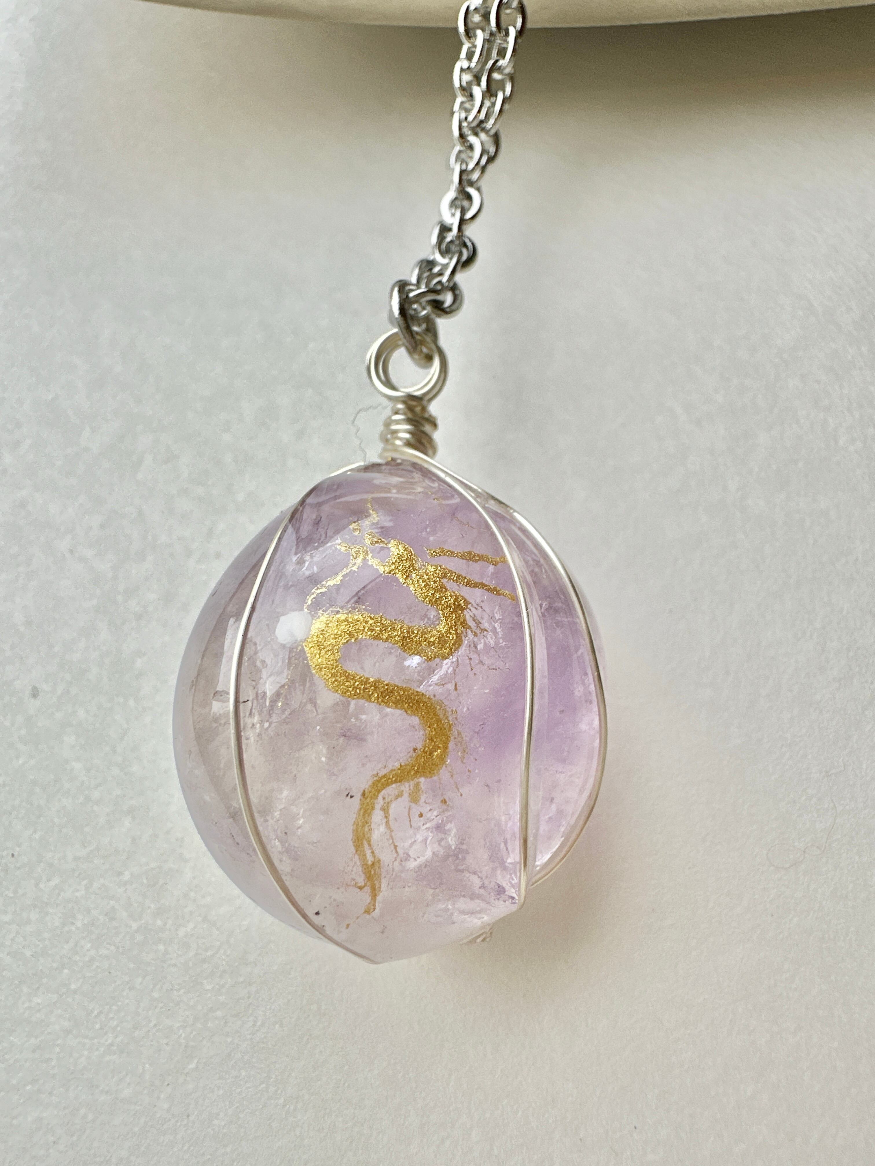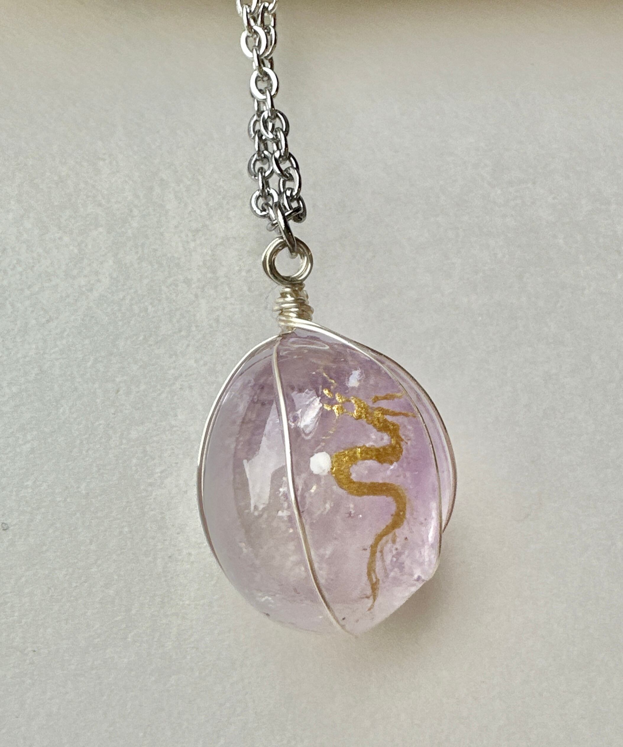 コロンとした大きな美しいアメジストに金の龍神が描かれています。