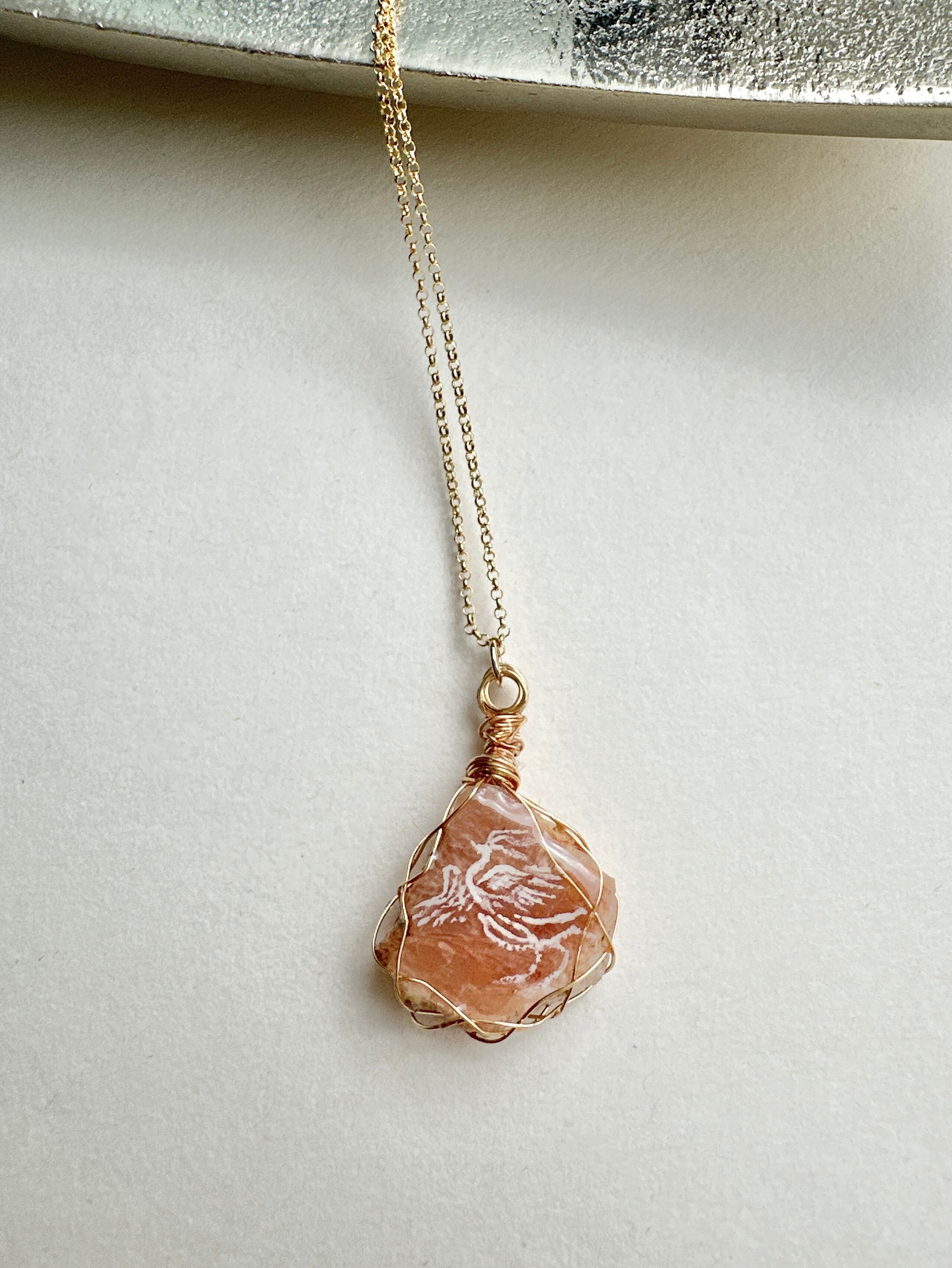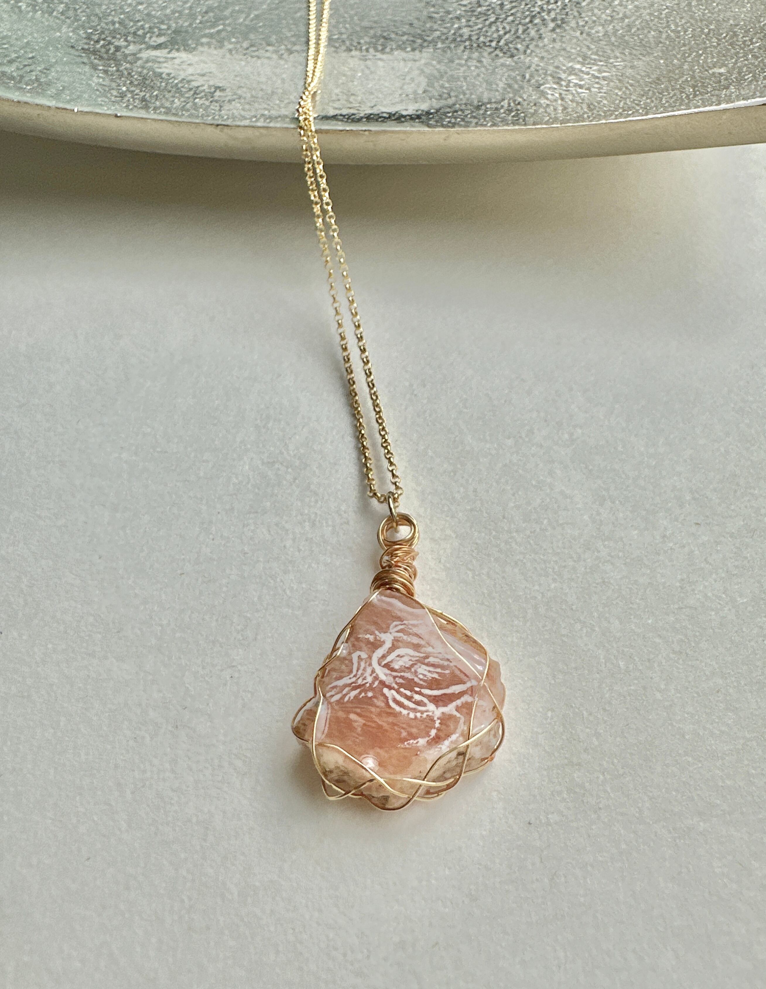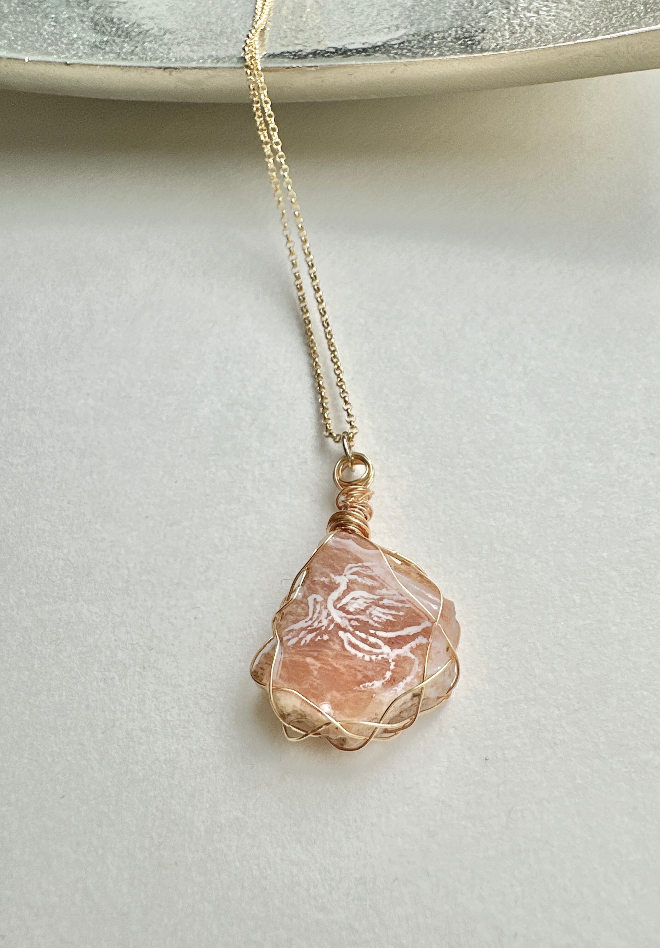 《再入荷》フィンランド鉱石(ピンク) 白鳳凰 ワイヤーラッピングネックレス